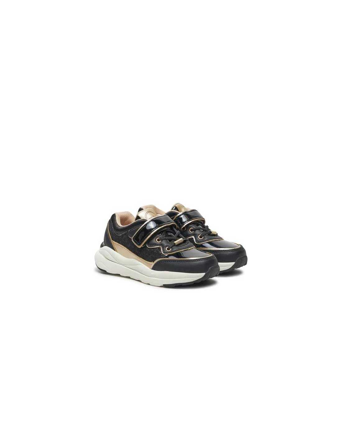 Zapatillas deportivas para niña, de gran versatilidad para sus aventuras diarias. Material exterior combinado de piel y otros materiales. Todos nuestros zapatos se realizan con pieles libres de cromo. Cómoda plantilla extraíble. Suela gruesa de estilo actual. Cierre con velcro ajustable que garantiza una perfecta sujeción del pie. Detalle de purpurina (glitter).