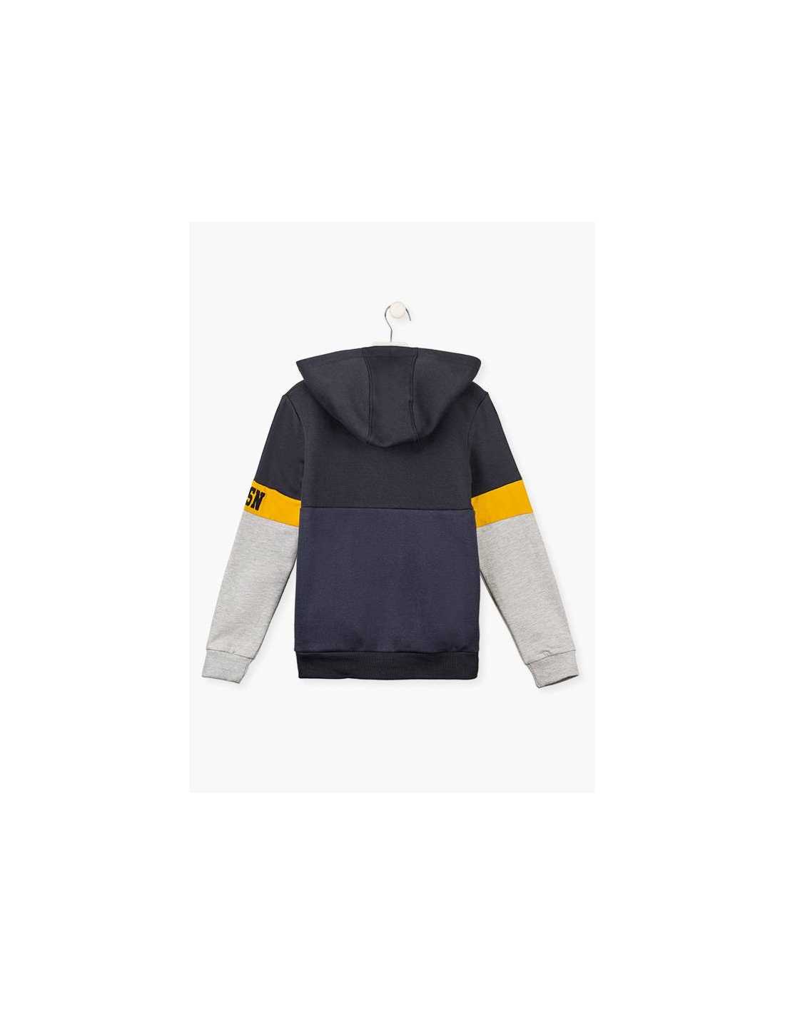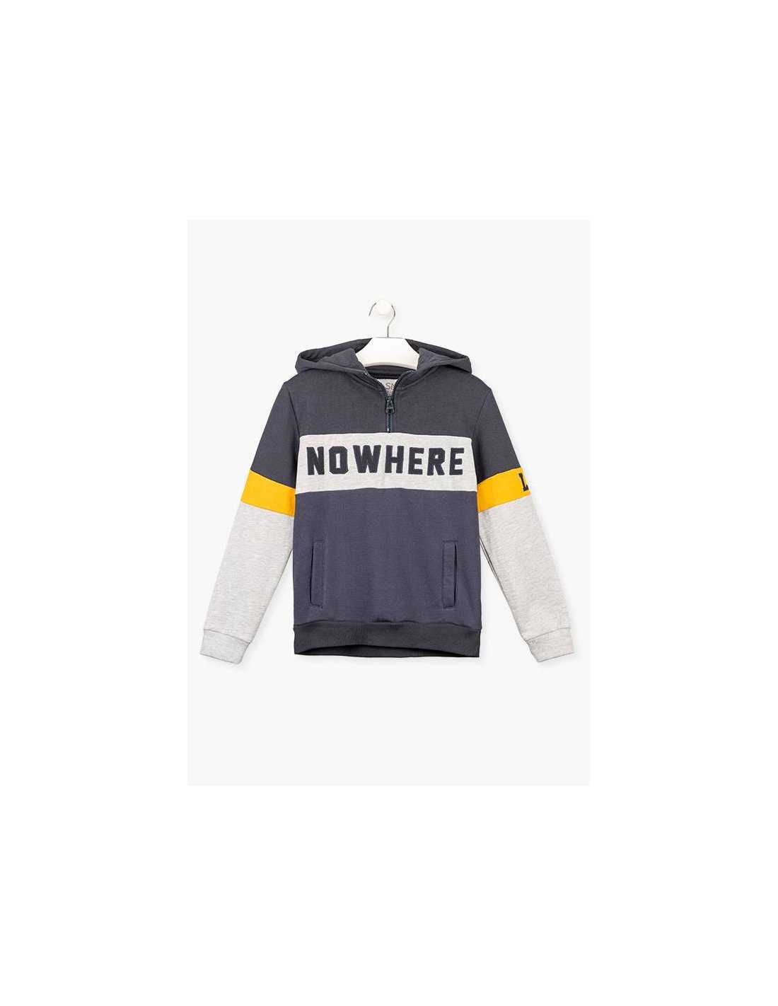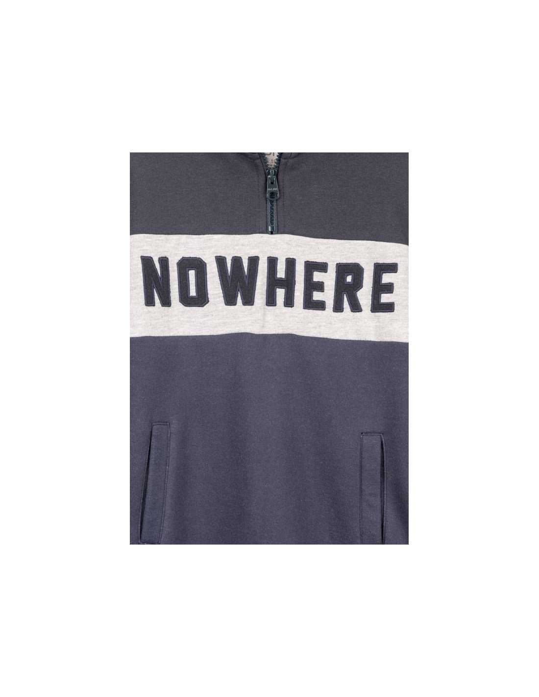 Sudadera con mensaje de parche para . Sudadera de color azul. Tejido de felpa de mezcla de algodón. Con capucha. Media cremallera. Bolsillos laterales. Terminaciones de canalé.