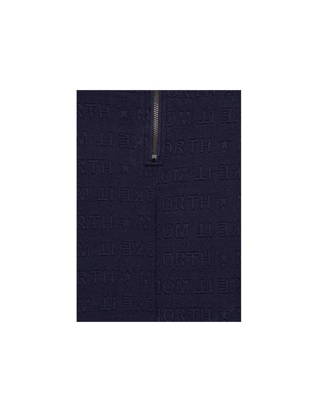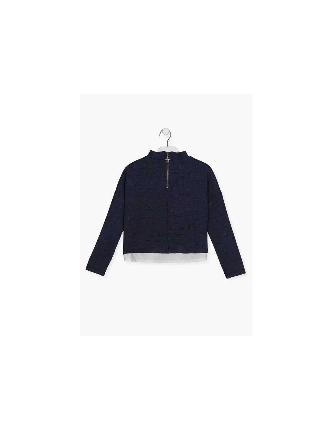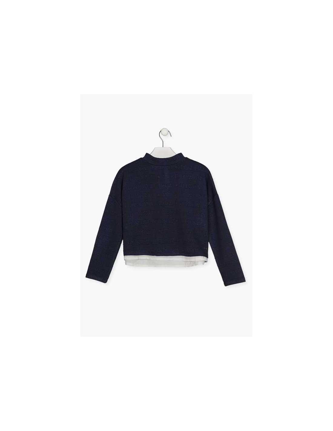 Sudadera cuello semicisne con Jacquard para . Sudadera de interlock en color azul marino. Con bajo en color blanco simulando camisa interior. Con abertura en la parte superior de la espalda con cremallera.