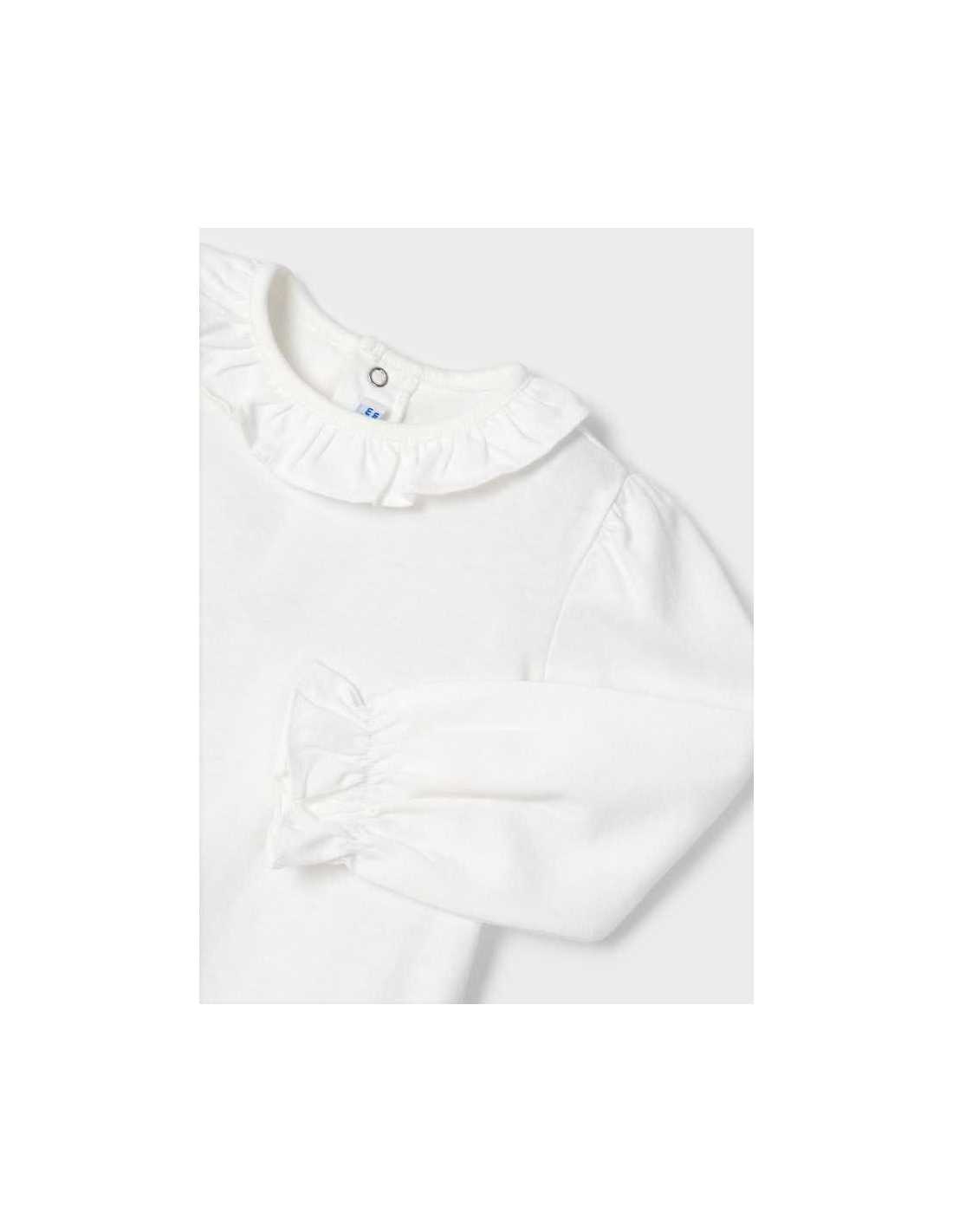 Camiseta de manga larga para bebé. Pequeña abertura en la espalda con cierre de botón para facilitar la puesta de la prenda.