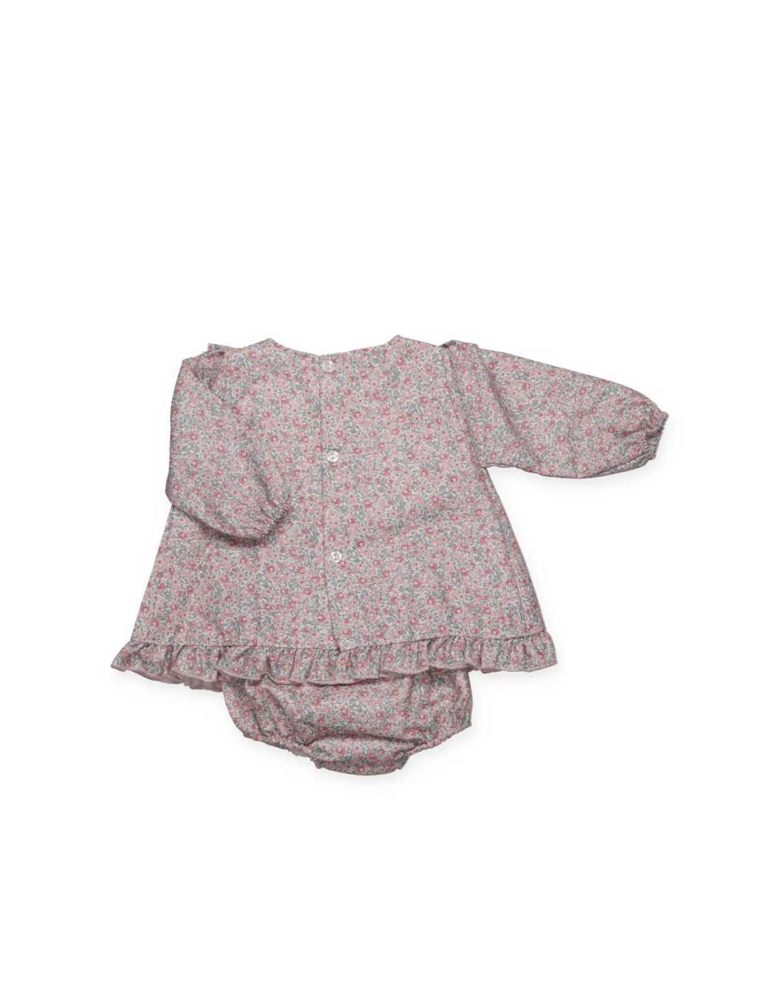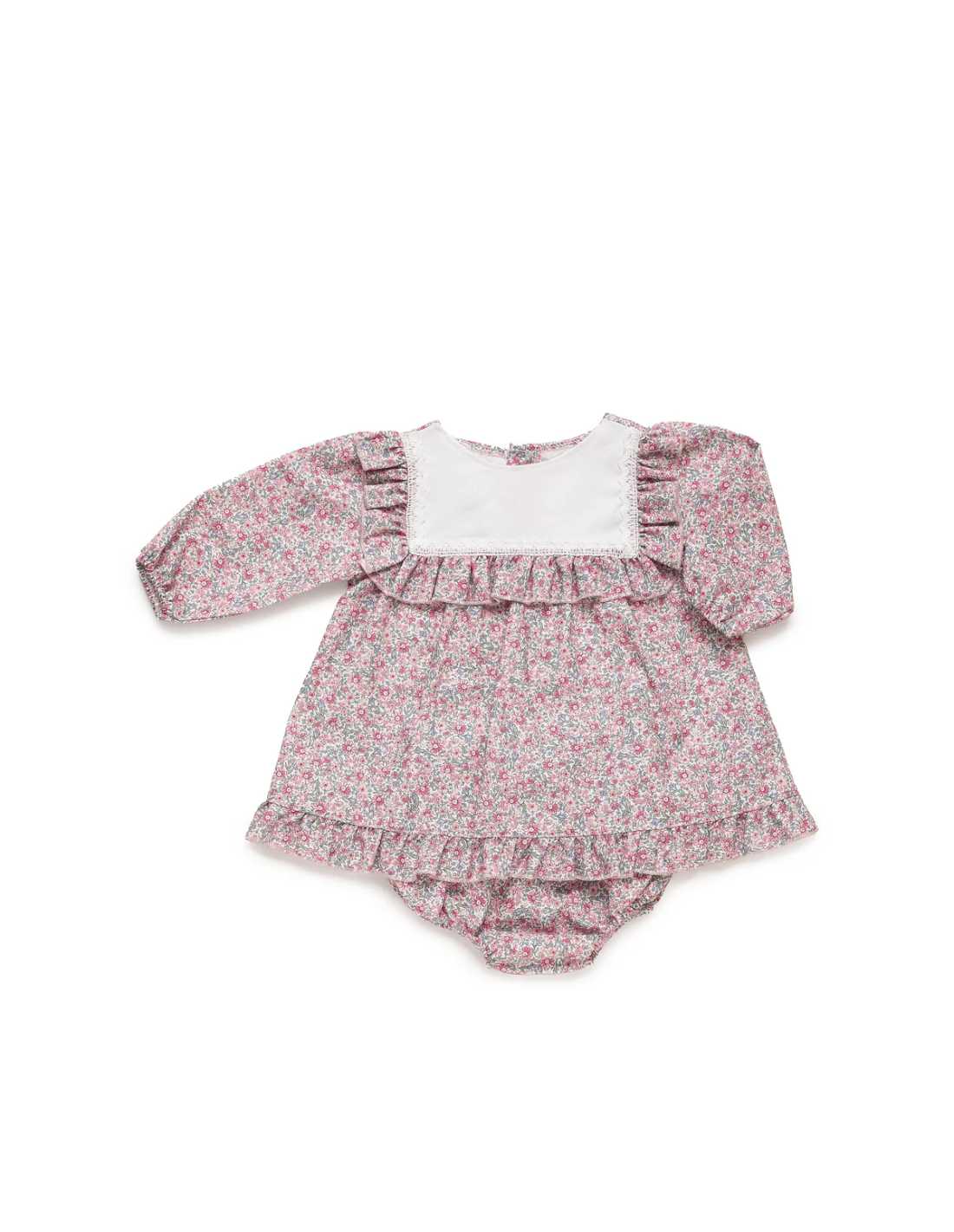 Jesusito de estampado floral en tonos maquillaje con delicada pechera blanca adornada con puntilla. Los volantes en los hombros y el bajo añaden un toque dulce. Incluye ranita a juego para una presentación impecable.