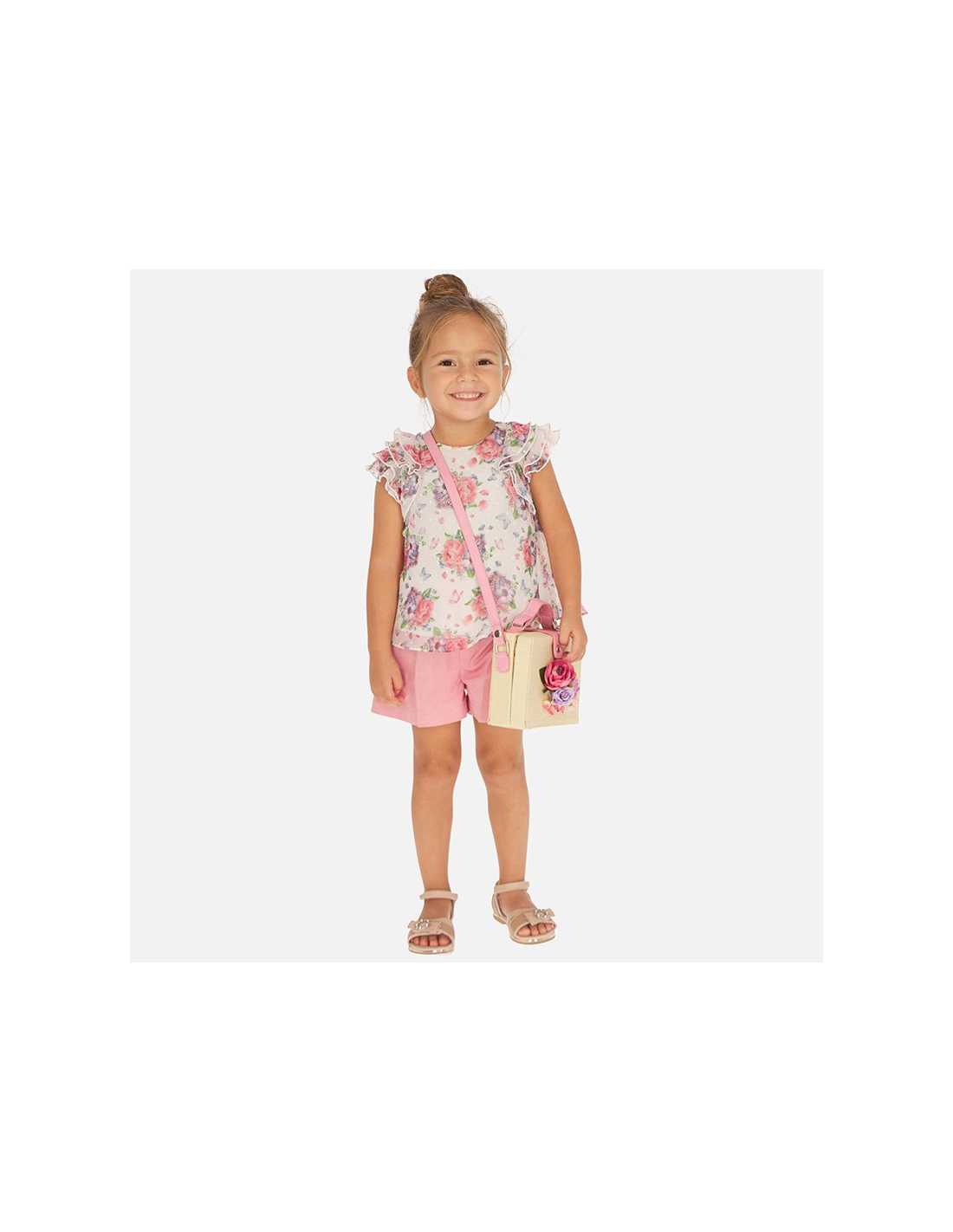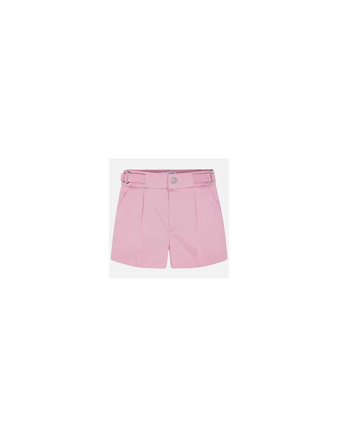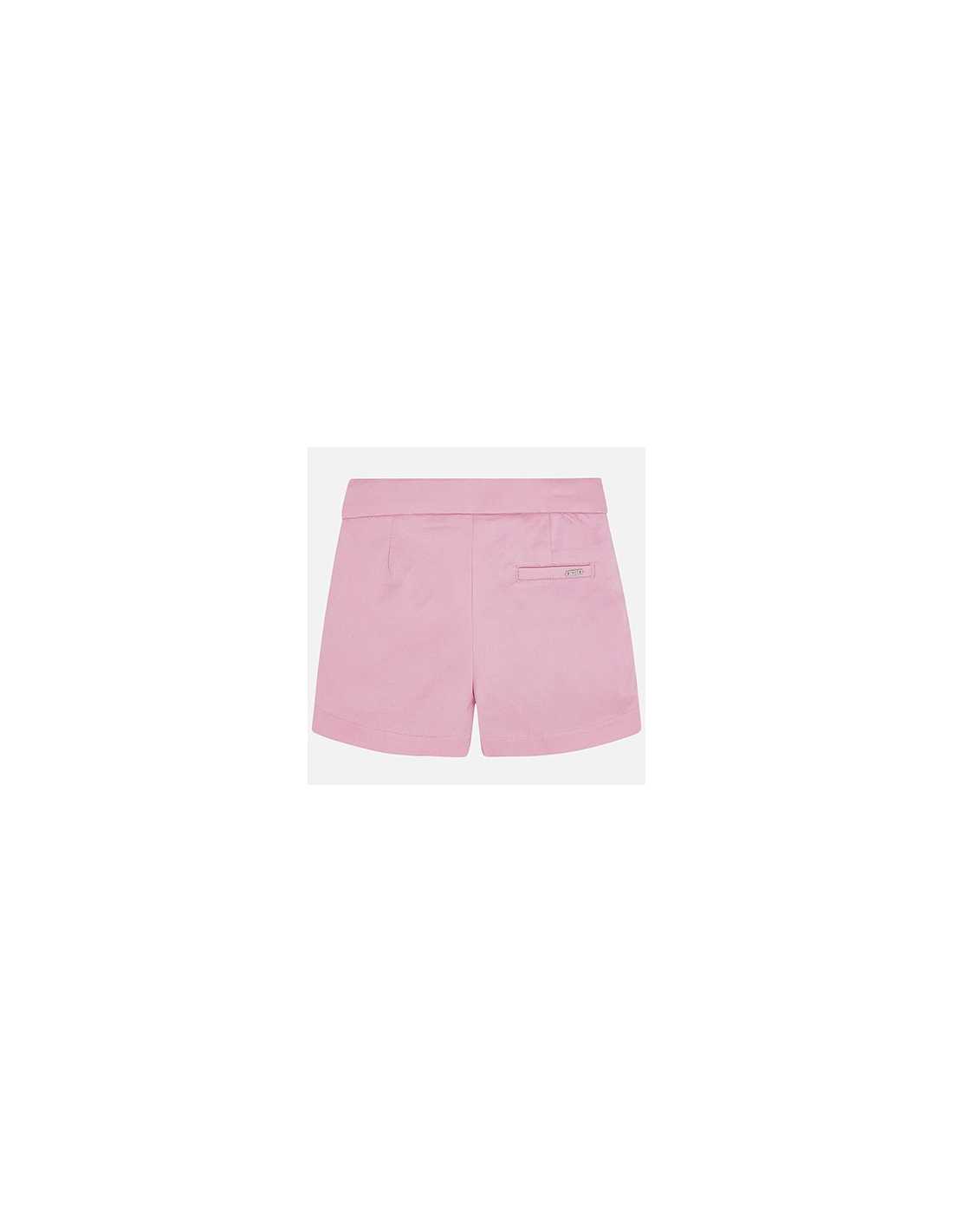 Pantalón de tipo short para niña. Cierre con botón a presión en la parte delantera. Goma elástica regulable en la cintura para ajustar el talle. Elegante y luminoso tejido de satén. Bolsillo simulado decorativo en la parte trasera. Elementos de adorno: hebillas decorativas.