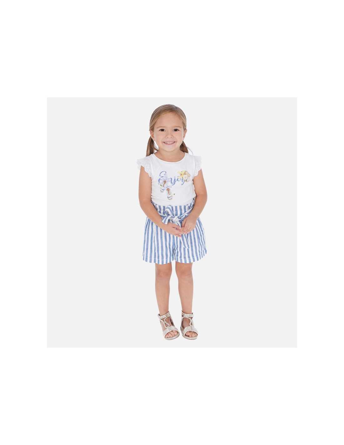 Pantalón de tipo short para niña. Goma elástica regulable en la cintura para ajustar el talle. Tejido de aspecto fresco y actual con lino. Fajín superpuesto para mejorar el ajuste al cuerpo. Bolsillos funcionales en la parte delantera. Motivo de rayas.