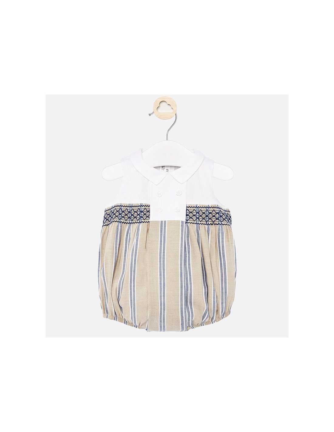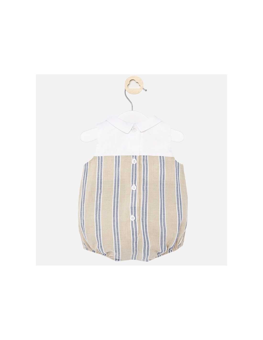 Pelele sin mangas para bebé niño recién nacido. Cuello camisero. Cierre con botones a presión. Tejido de aspecto fresco y actual con lino. Elementos de adorno: botones decorativos, detalles fruncidos con nido de abeja.