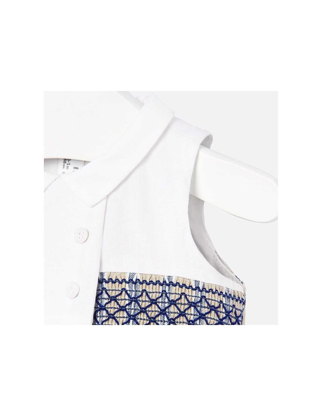 Pelele sin mangas para bebé niño recién nacido. Cuello camisero. Cierre con botones a presión. Tejido de aspecto fresco y actual con lino. Elementos de adorno: botones decorativos, detalles fruncidos con nido de abeja.PELELE VESTIR