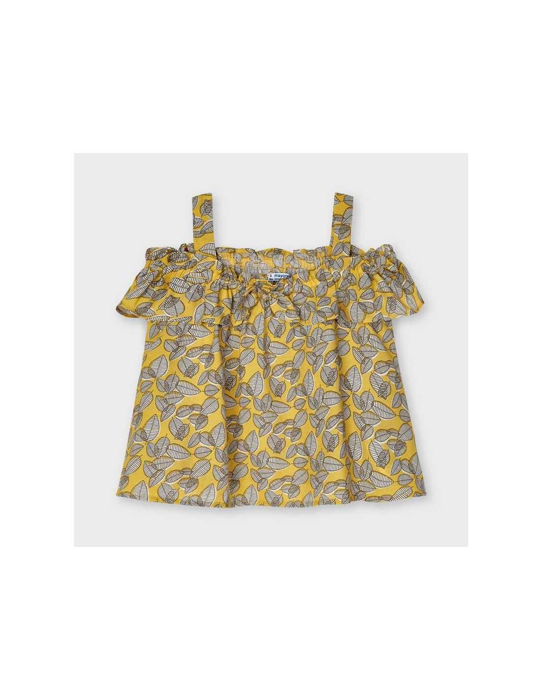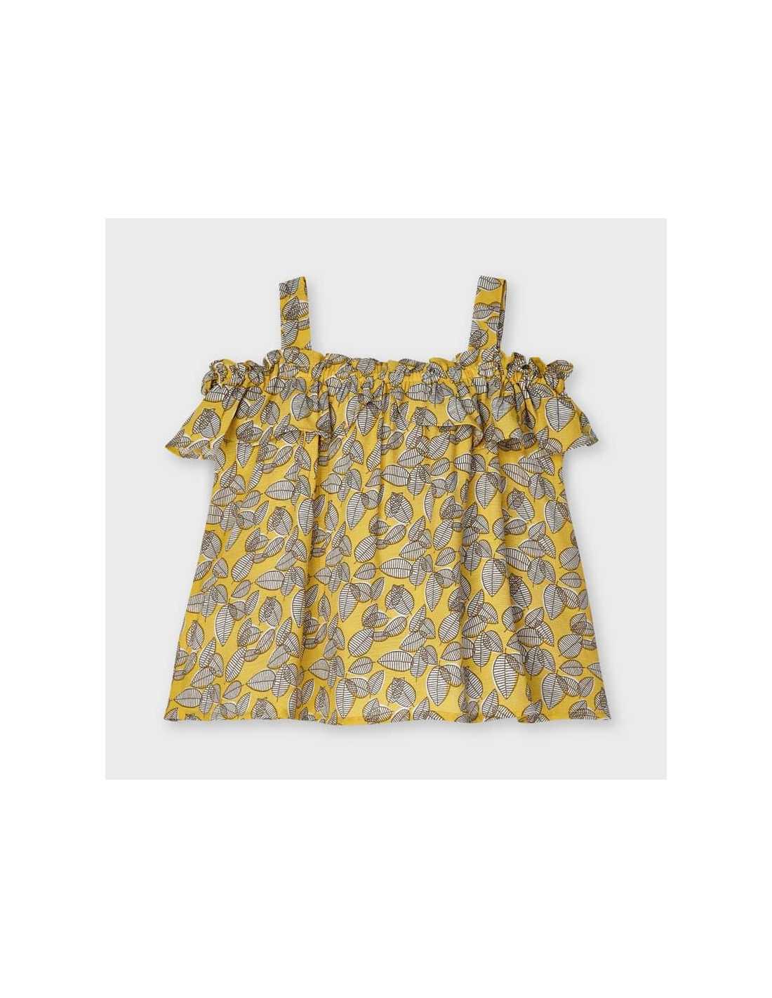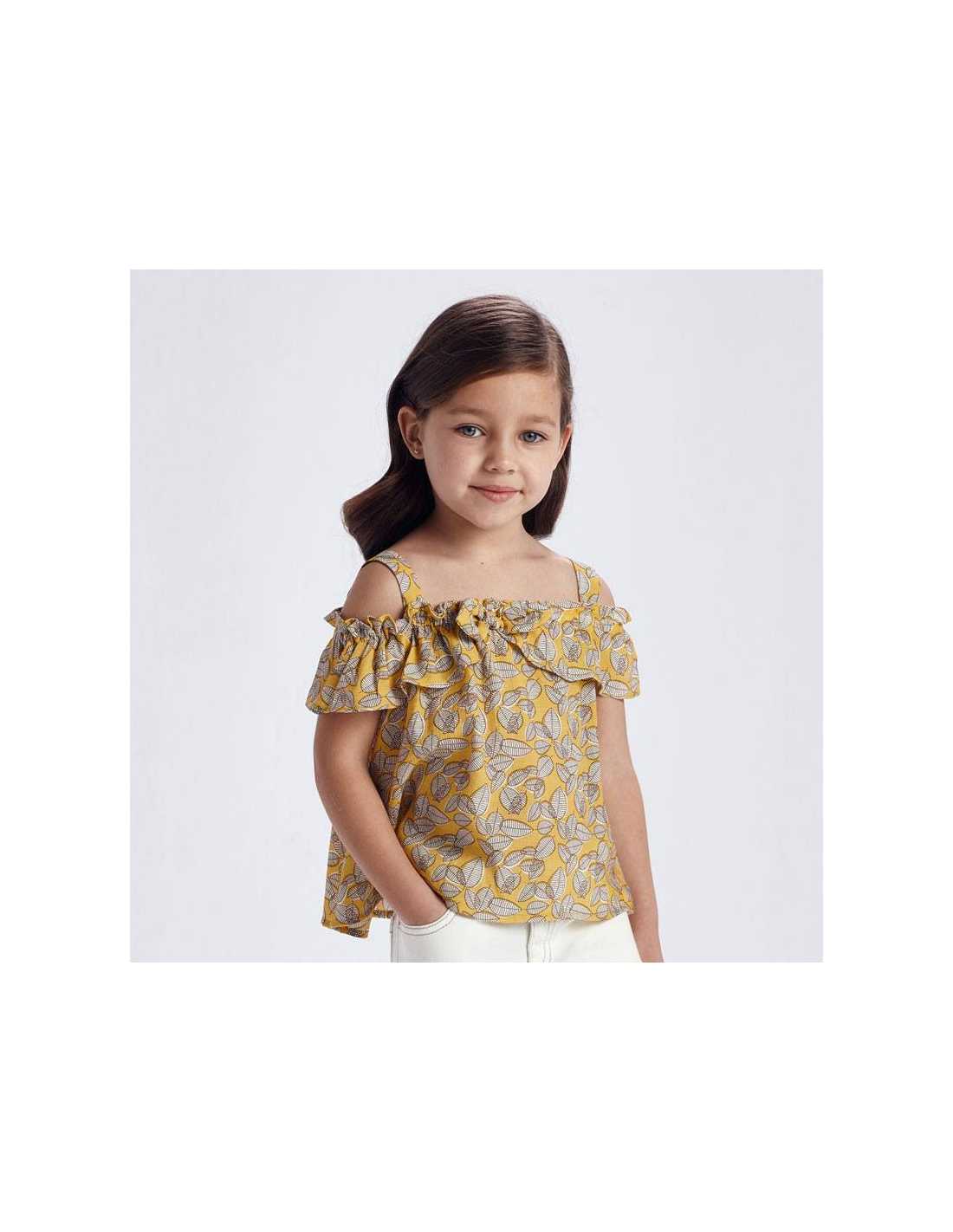 Blusón de manga corta con aberturas en los hombros para niña. Cuello recto. Tejido fluido y elástico para una máxima comodidad en el día a día. Modelo con volantes. Elementos de adorno: lazada decorativa. Diseño estampado.