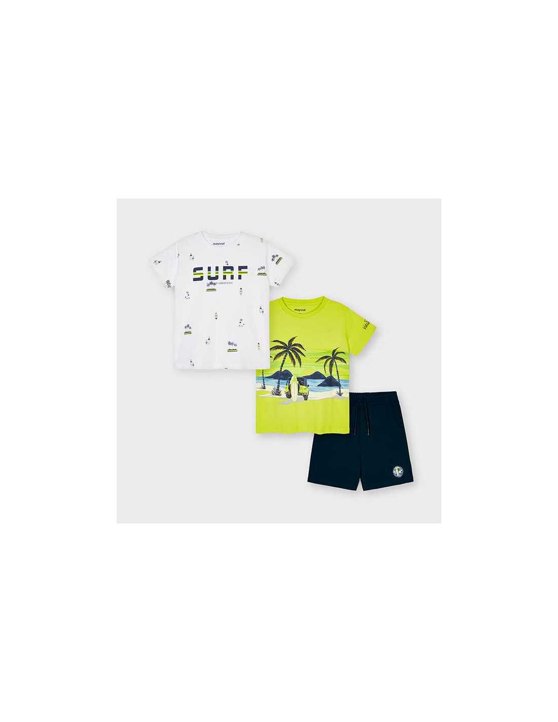 Conjunto de tres piezas para niño de 2 a 9 años formado por dos camisetas y un pantalón corto coordinado.