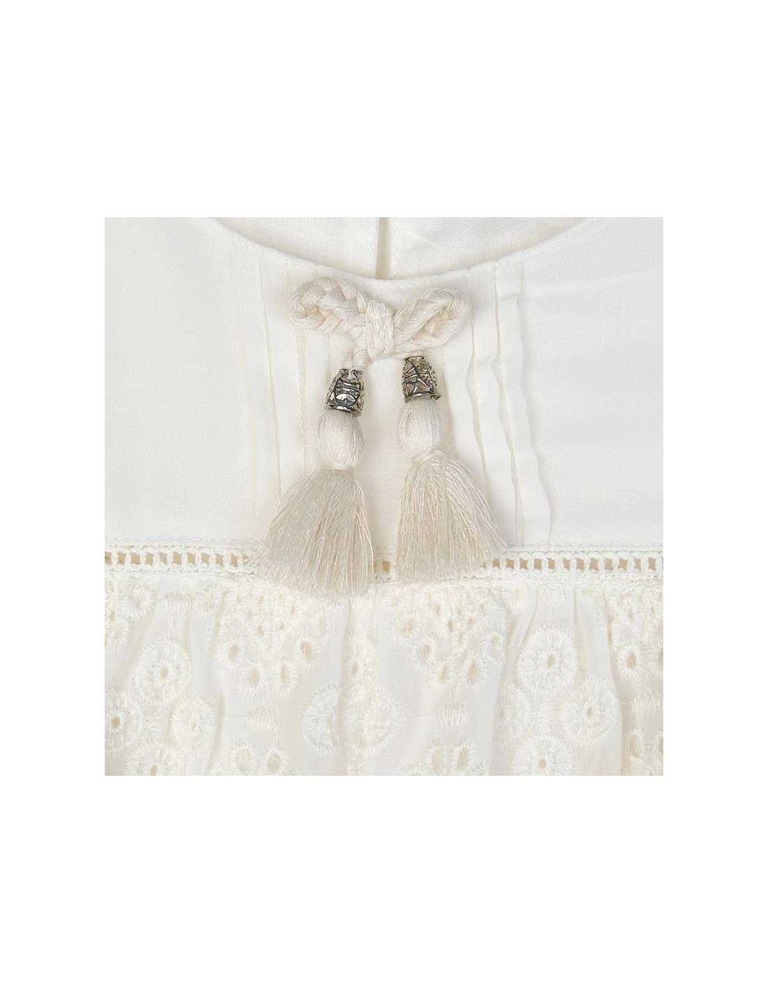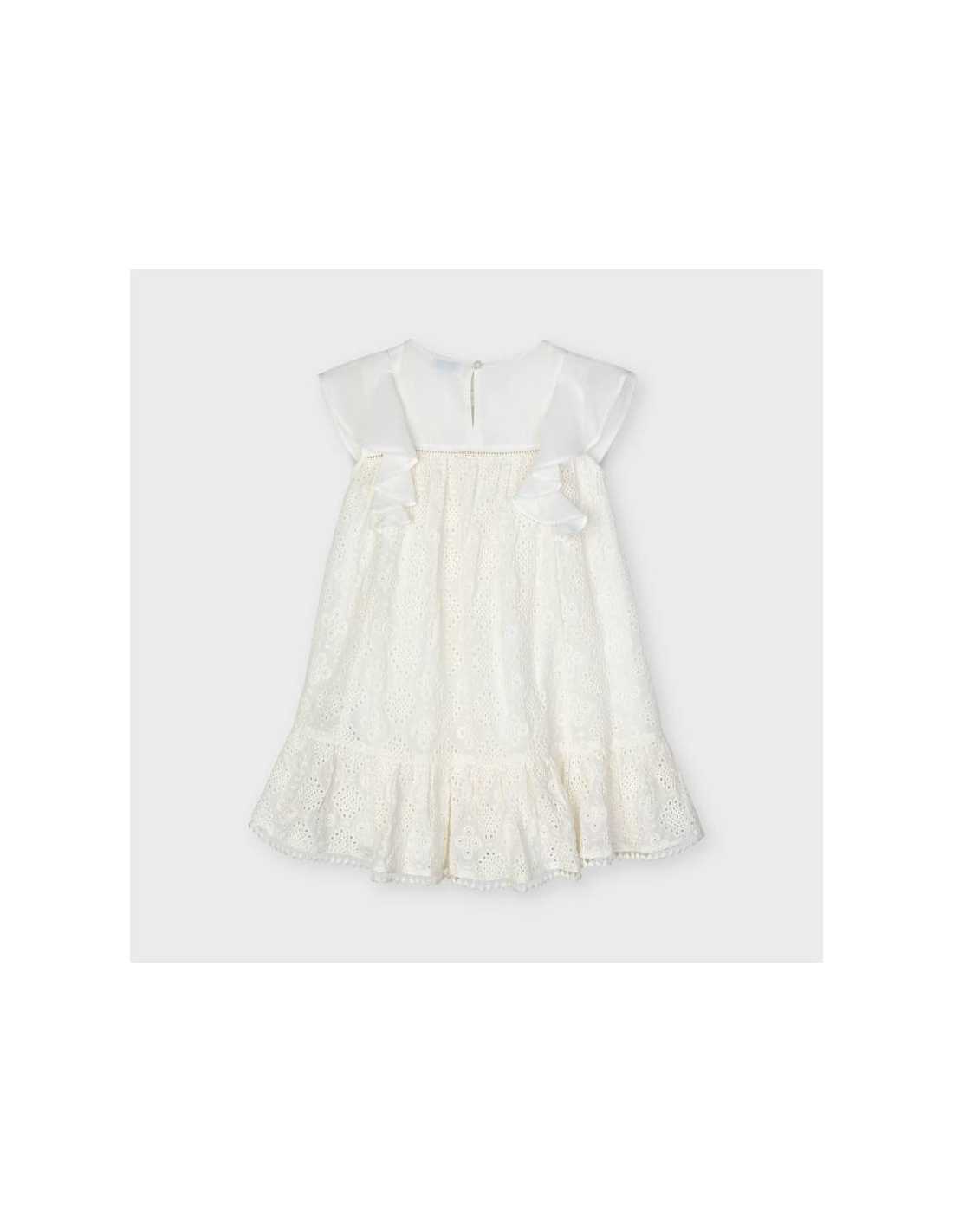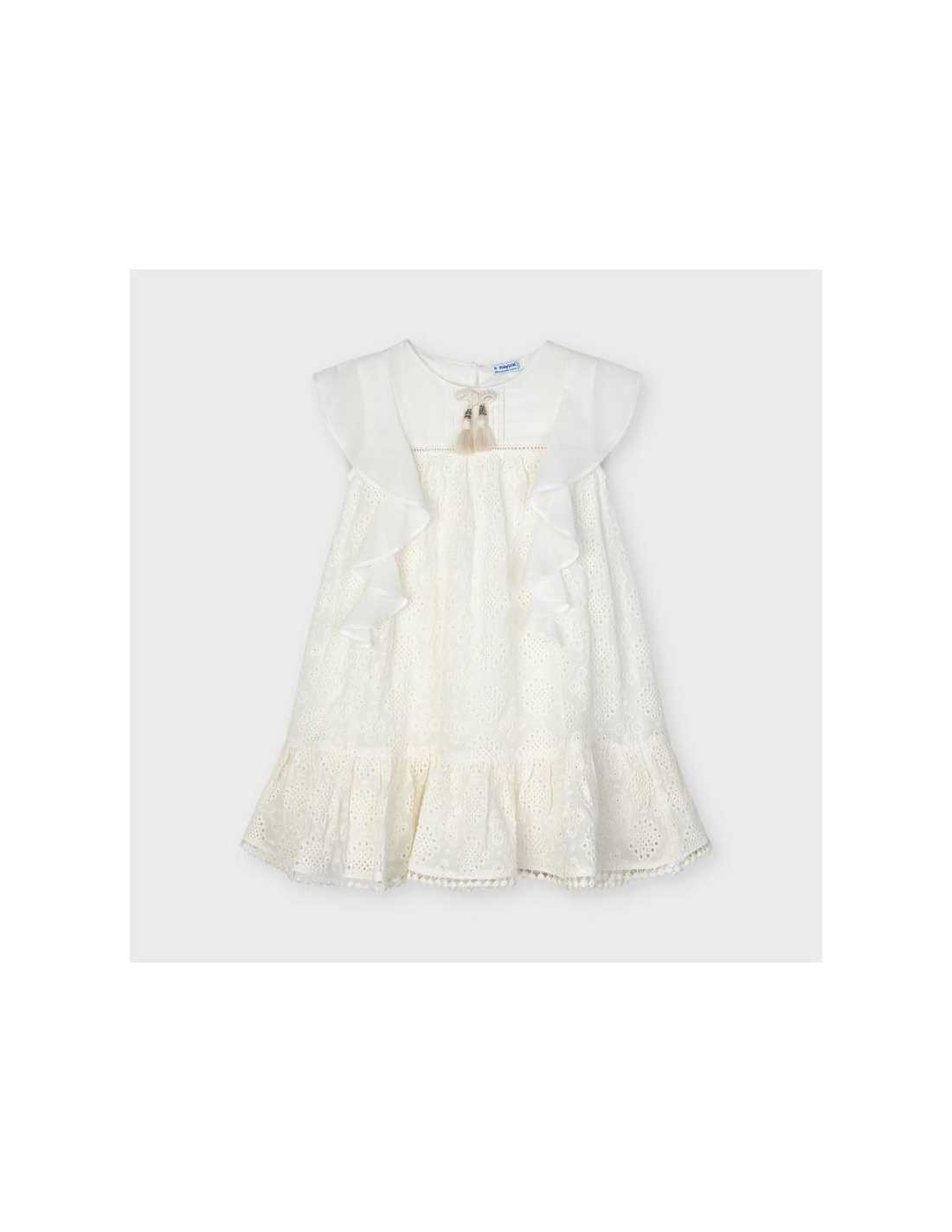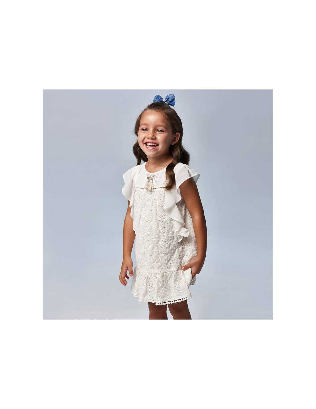 Vestido sin mangas con detalles de volantes para niña de 2 a 9 años. Cuello redondo. Pequeña abertura en la espalda con cierre de botón para facilitar la puesta de la prenda. Fluido tejido de gasa de gran ligereza y frescura. Diseño con volante decorativo en el bajo de la prenda.
