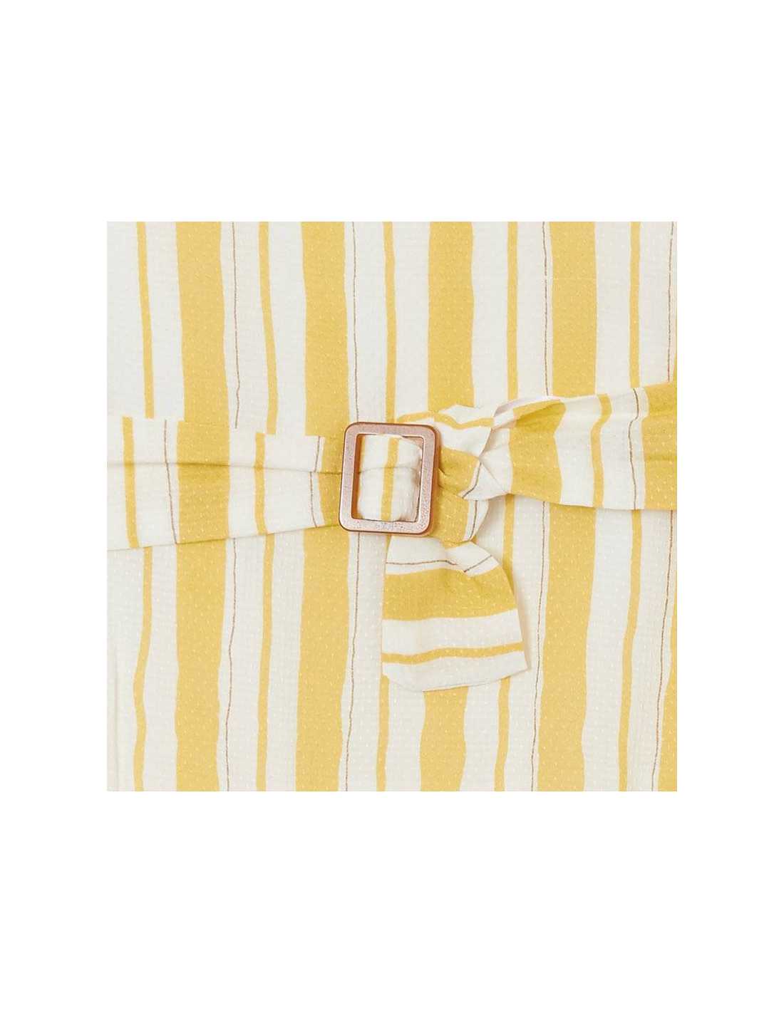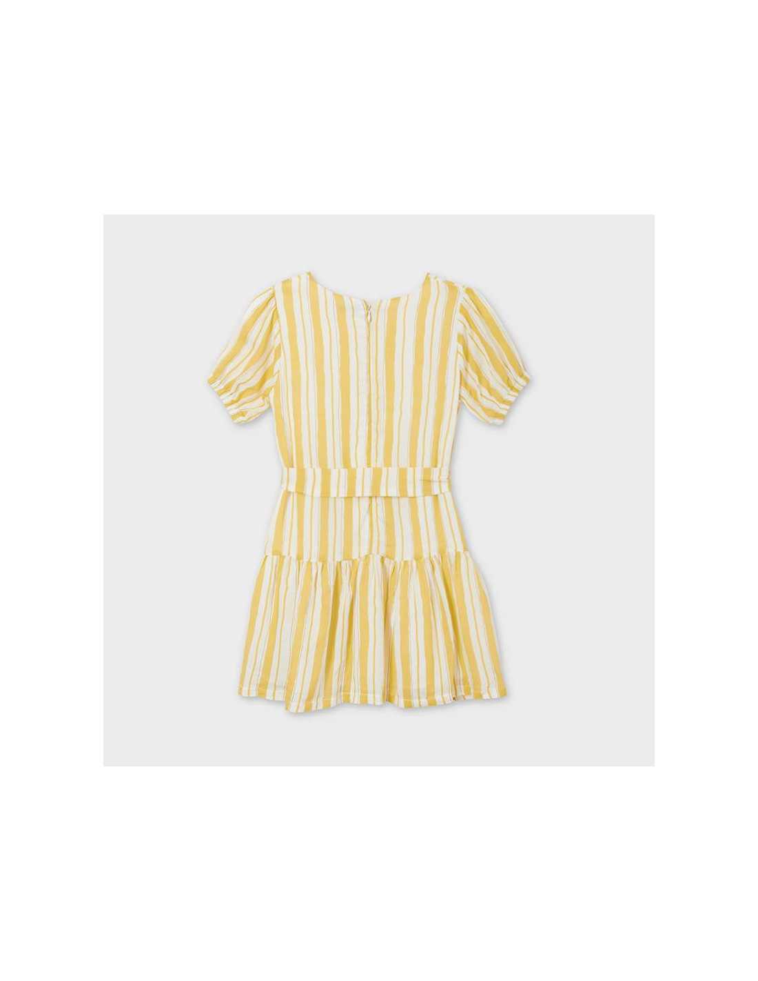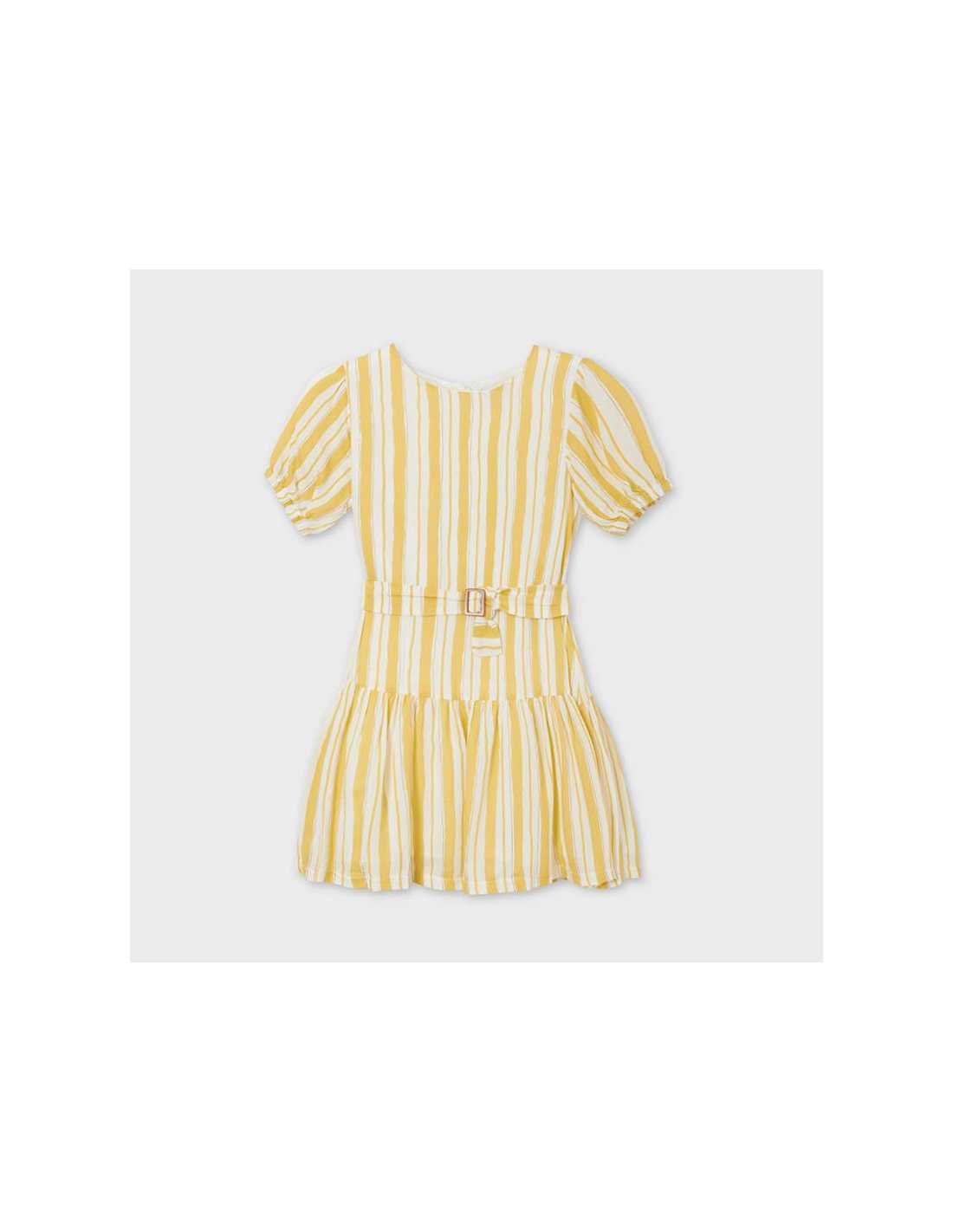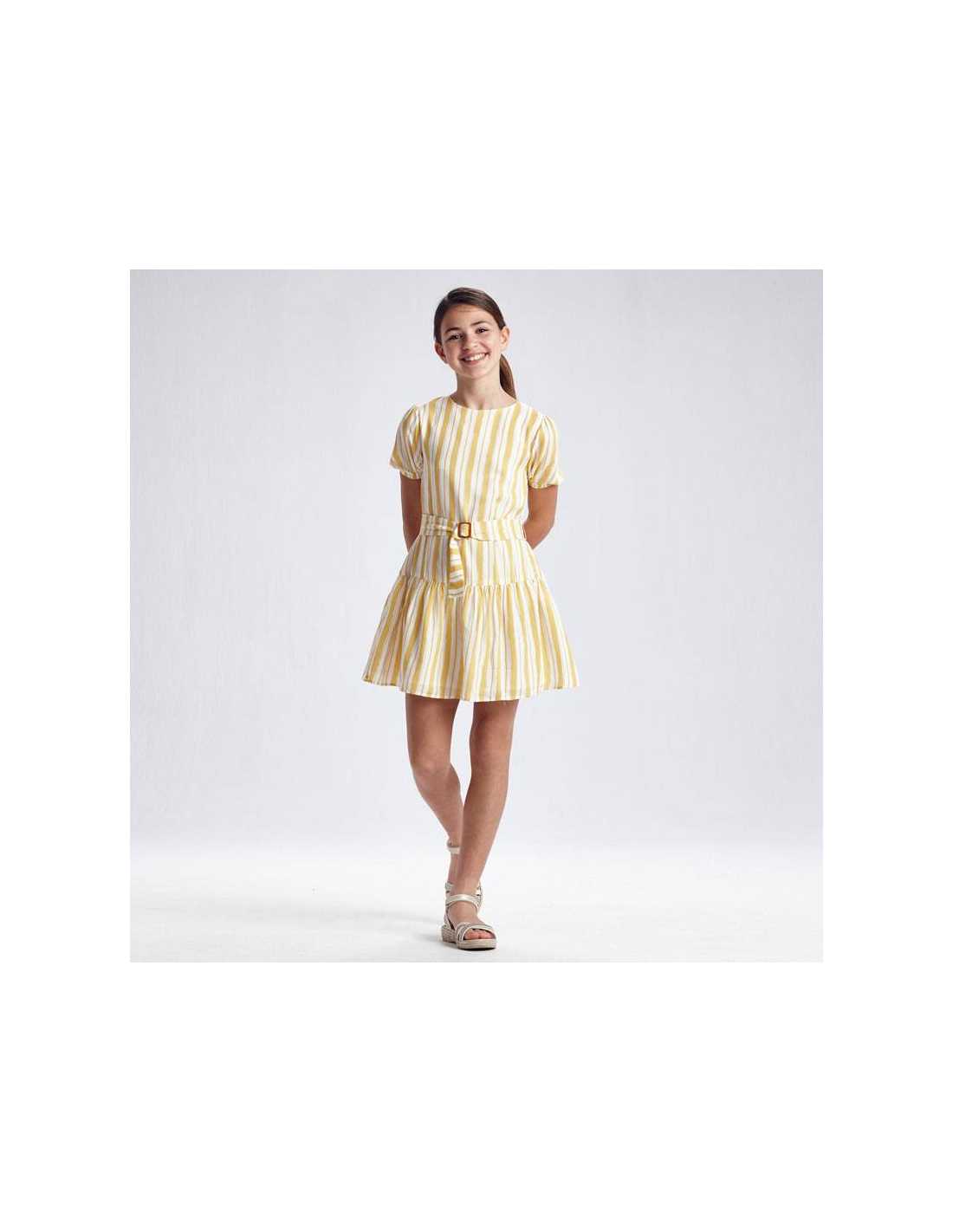 Vestido de manga corta para chica 8 a 16 Años. Cuello redondo. Tejido fluido para una máxima comodidad en el día a día. Modelo con rizo. Cinturón extraíble a la cintura. Motivo de rayas.
