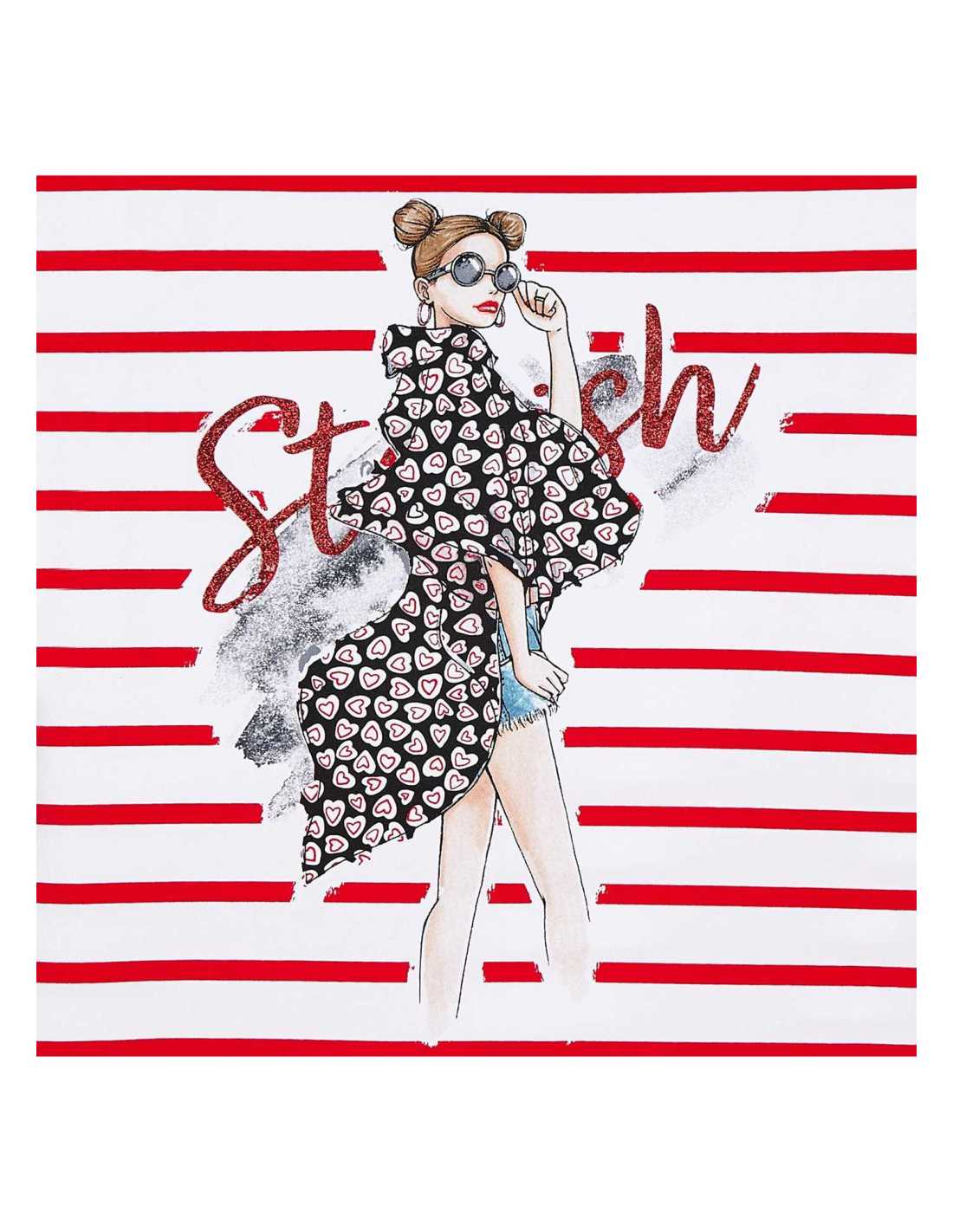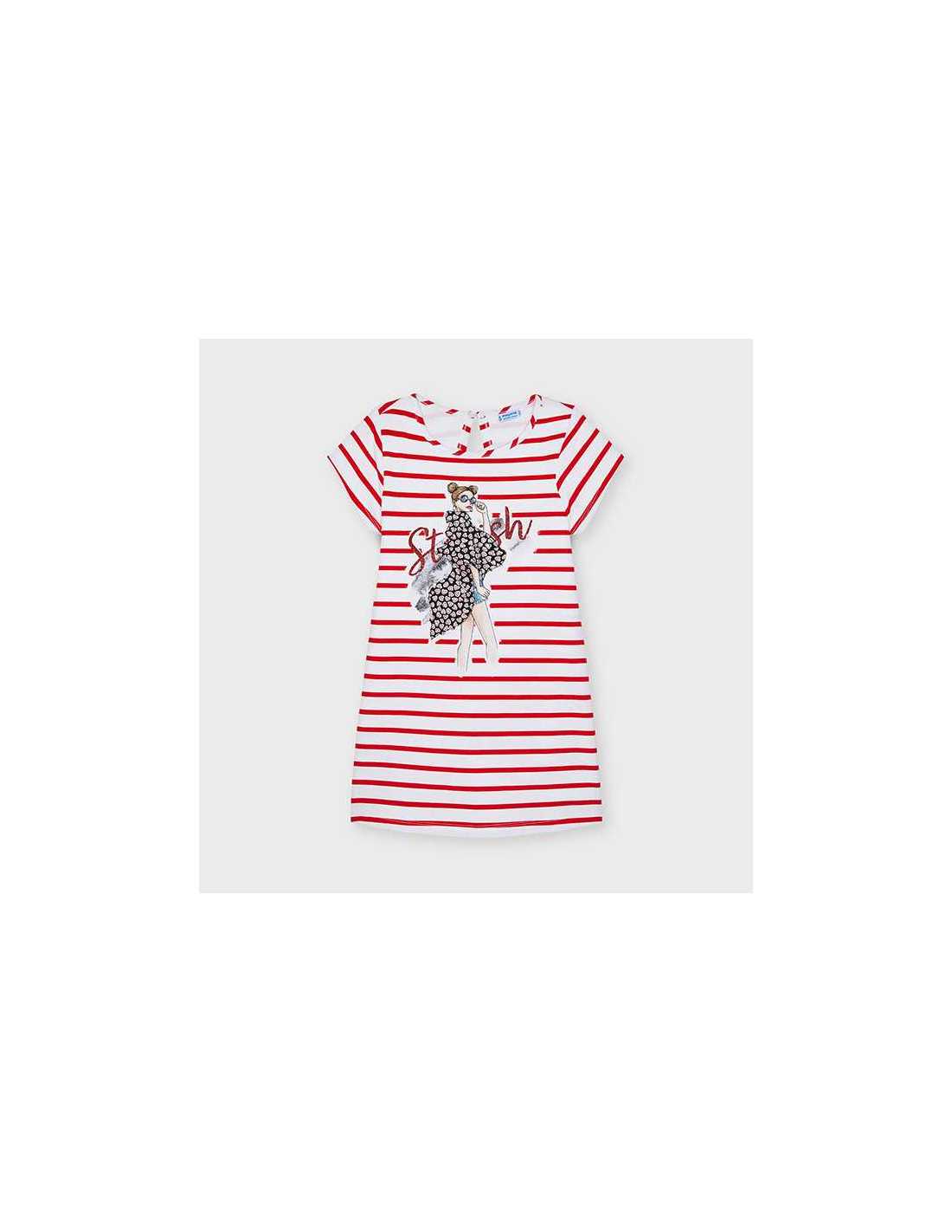 Vestido de manga corta para chica 8 a 16 Años. Cuello redondo. Cierre con un único botón. Suave tejido de algodón elástico. Diseño con abertura en la espalda. Elementos de adorno: dibujo en la parte delantera, glitter. Motivo de rayas.