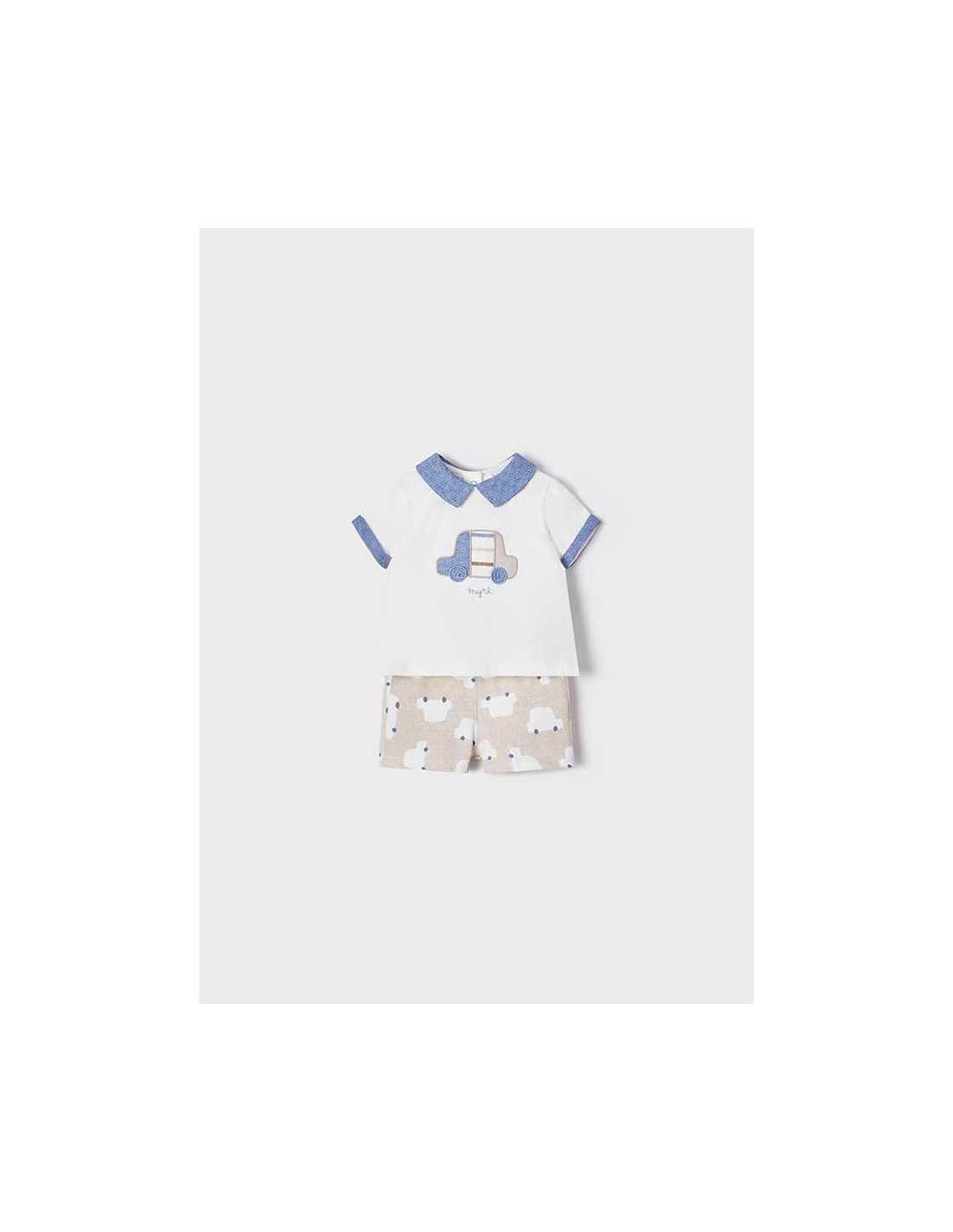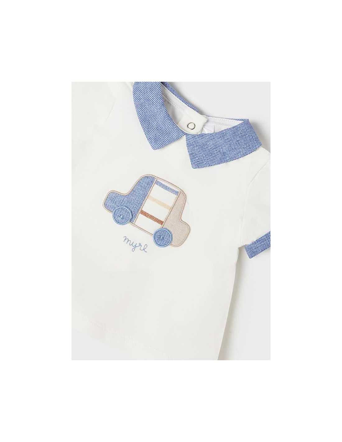 Camiseta de manga corta en tejido a contraste para recién nacido niño. Cuello con tejido a contraste. Cierre con botones a presión en la parte posterior para facilitar la puesta de la prenda. Cómodo tejido de punto. Elementos de adorno: aplique decorativo.