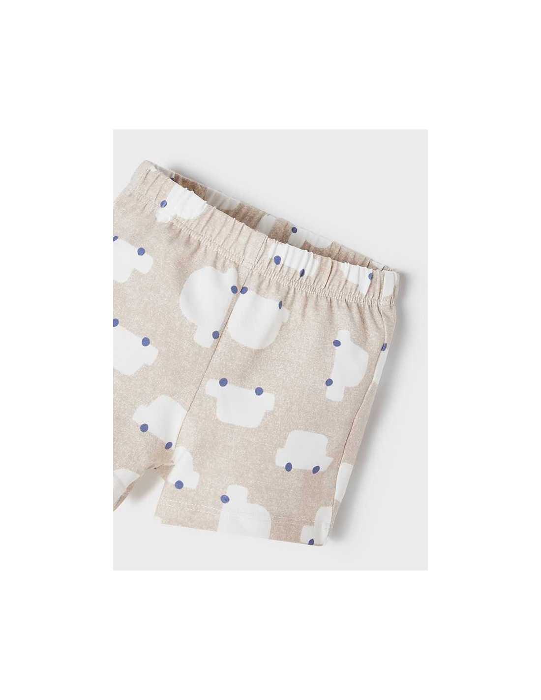 Pantalón de tipo short para recién nacido niño. Goma elástica en la cintura para un mejor ajuste. Cómodo tejido de punto. Diseño con delicados motivos infantiles.