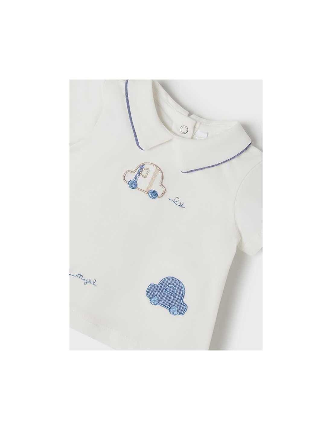 Camiseta de manga corta en tejido a contraste para recién nacido niño. Cuello con tejido a contraste. Cierre con botones a presión en la parte posterior para facilitar la puesta de la prenda. Cómodo tejido de punto. Elementos de adorno: aplique decorativo.