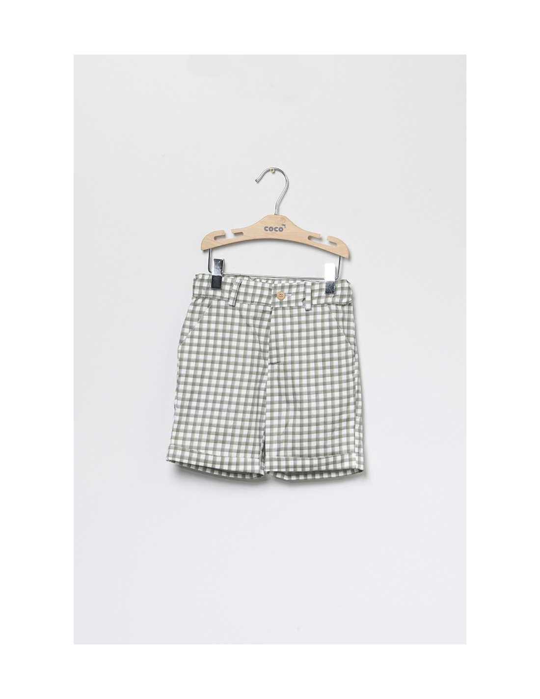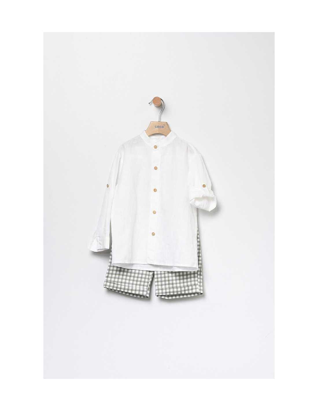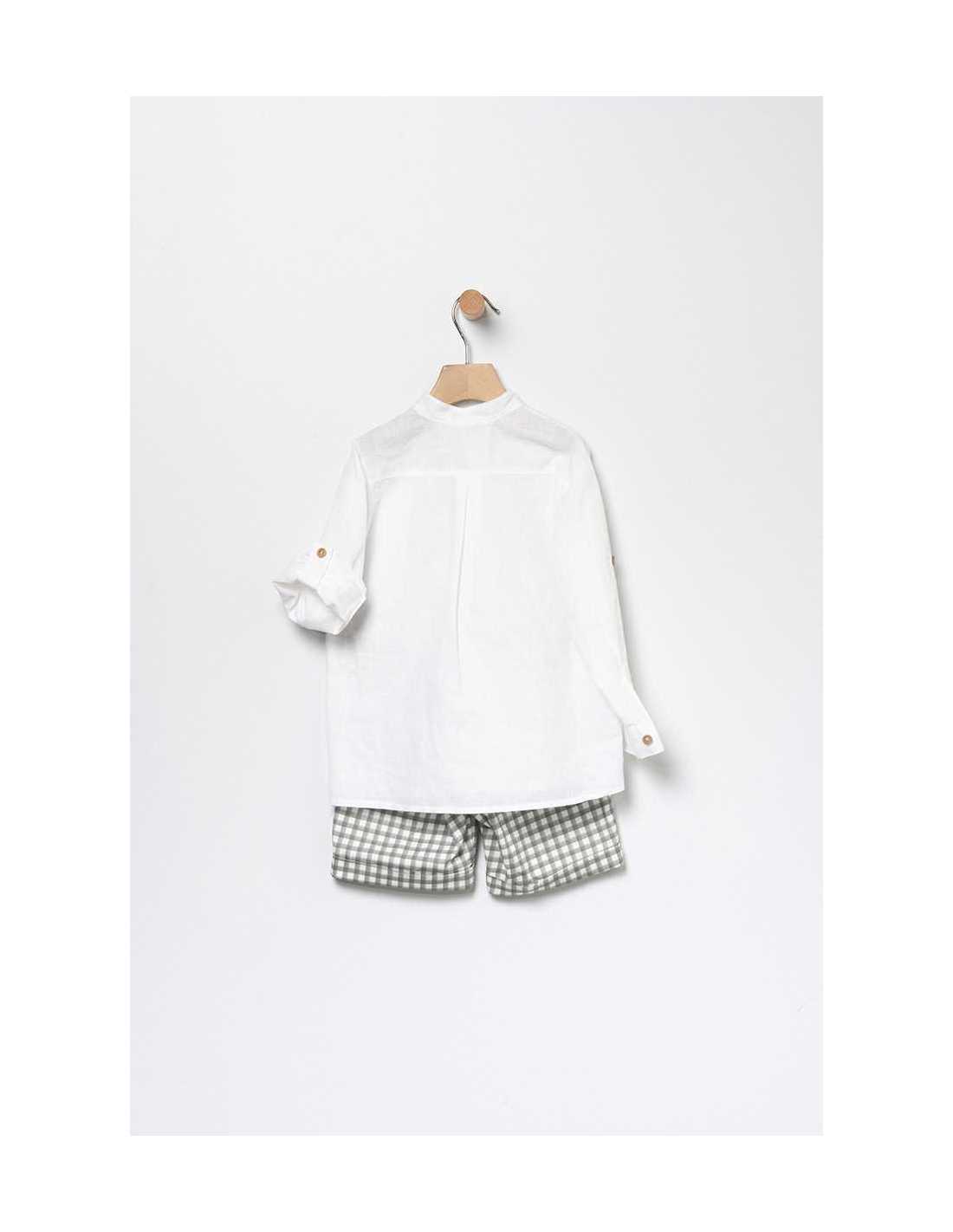 Conjunto niño. camisa en color crudo ,manga larga cuello tirilla abotonada en la parte delantera .Pantalón bermuda corto cuadros.