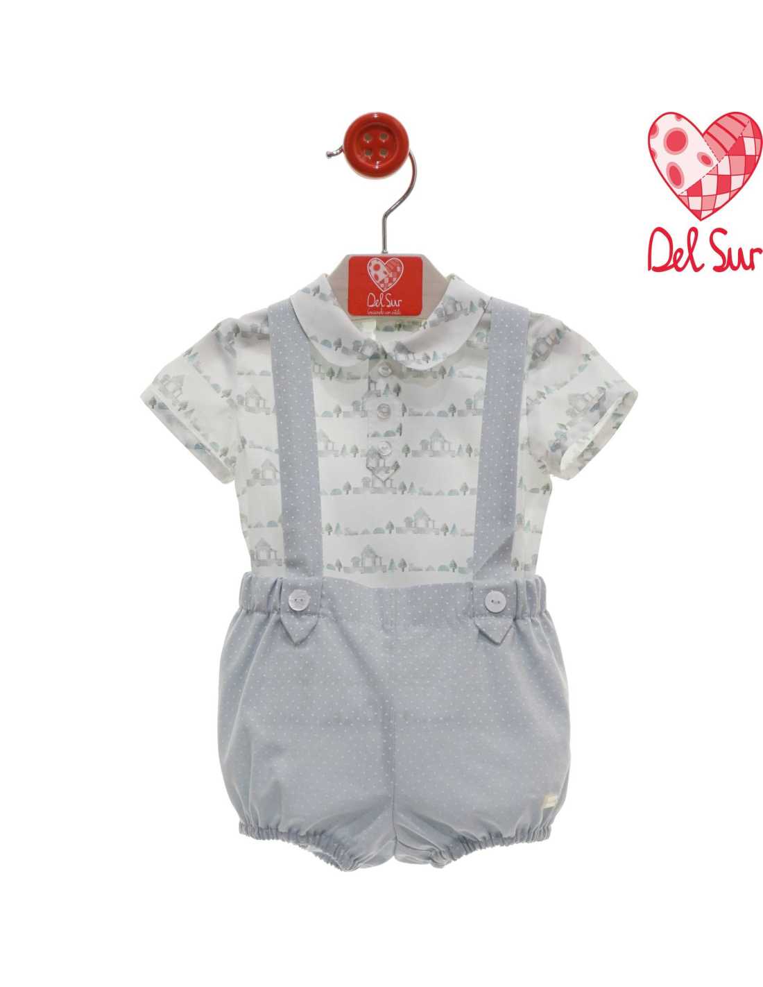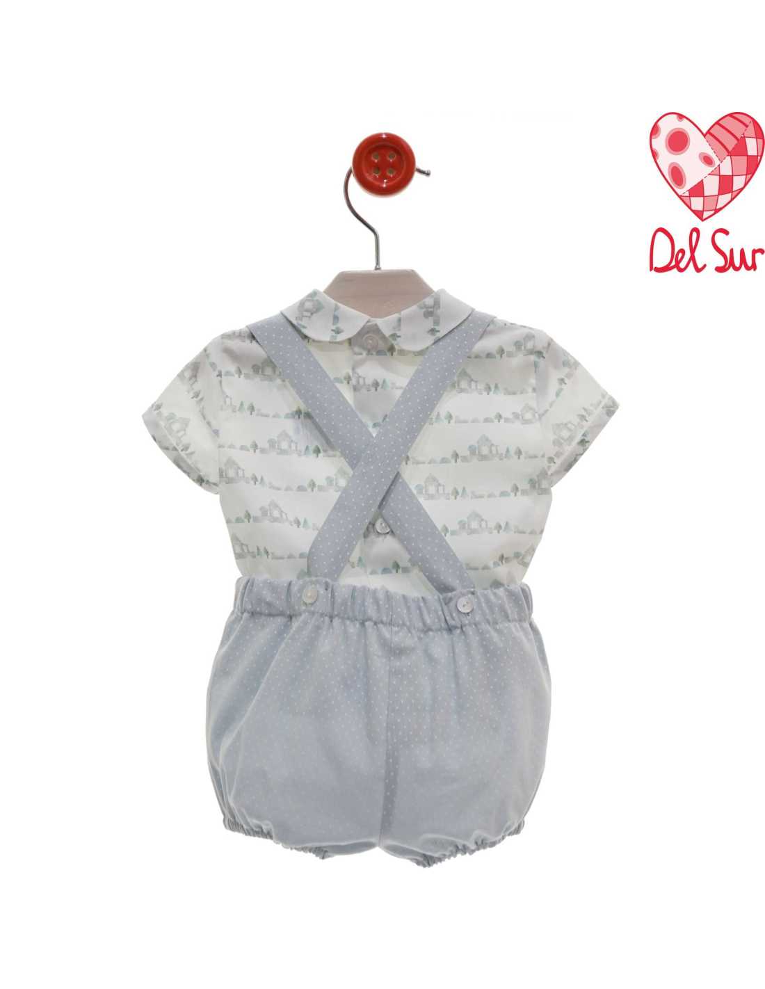 Conjunto vestir bebe niño ,camisa manga corta , estampada cuello bebe tapeta con botones . pantalón corto tipo ranita modelo tirantes .Ideal para cualquier evento.