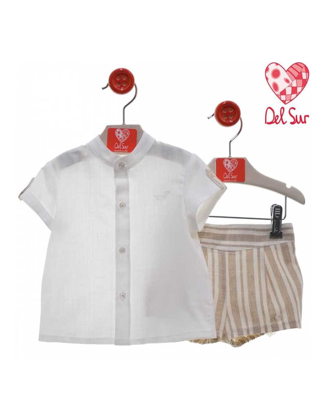 Conjunto bebe niño vestir. Camisas manga corta lino con detalles a contraste como el pantalón , cuello mao y abierta en la parte delantera. Pantalón corto lino rayas.