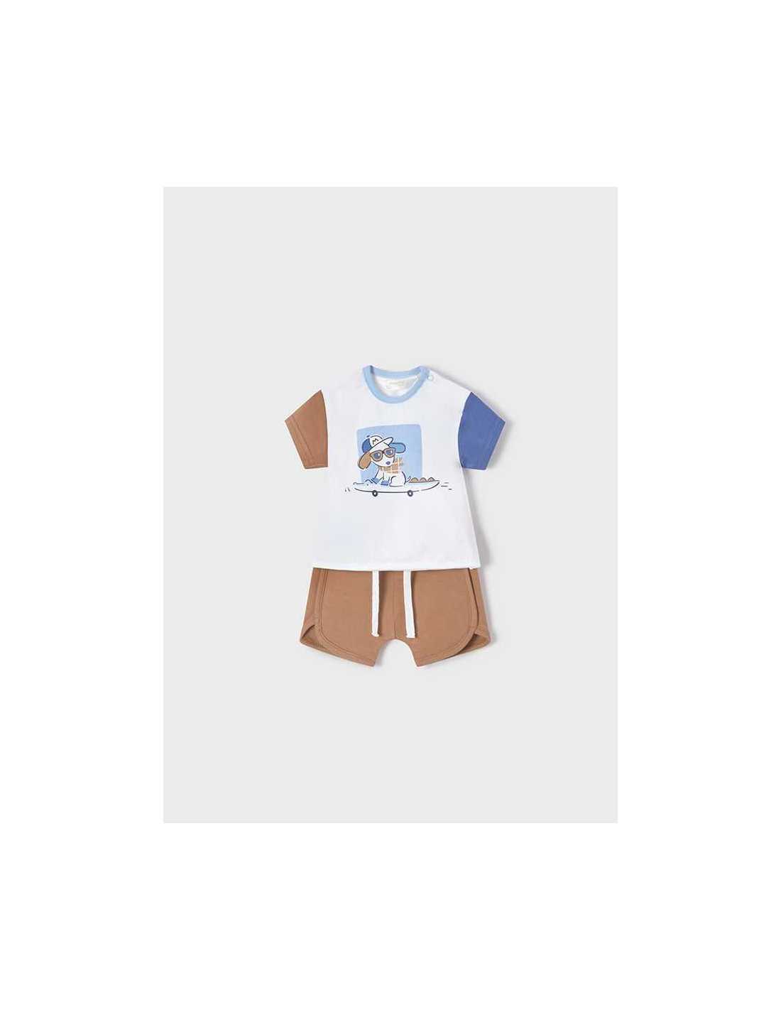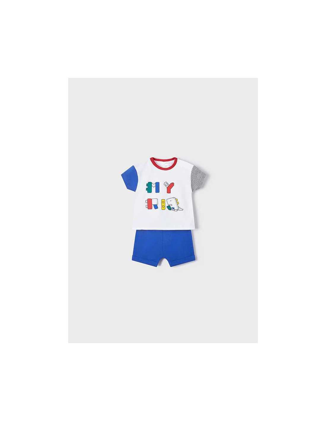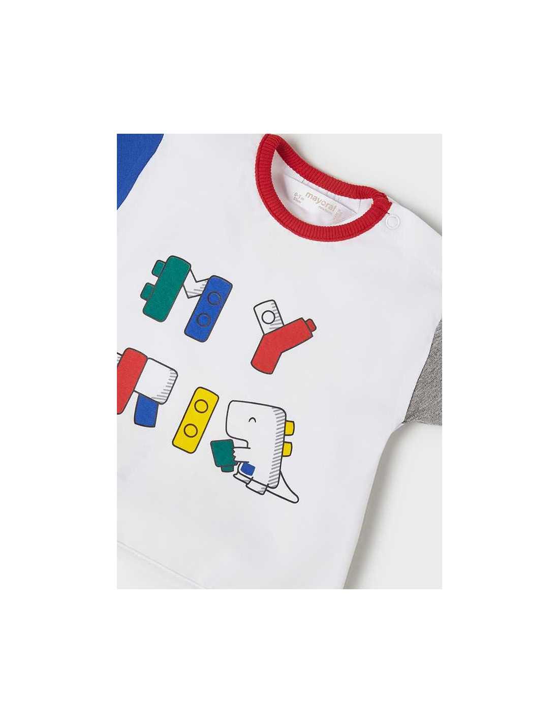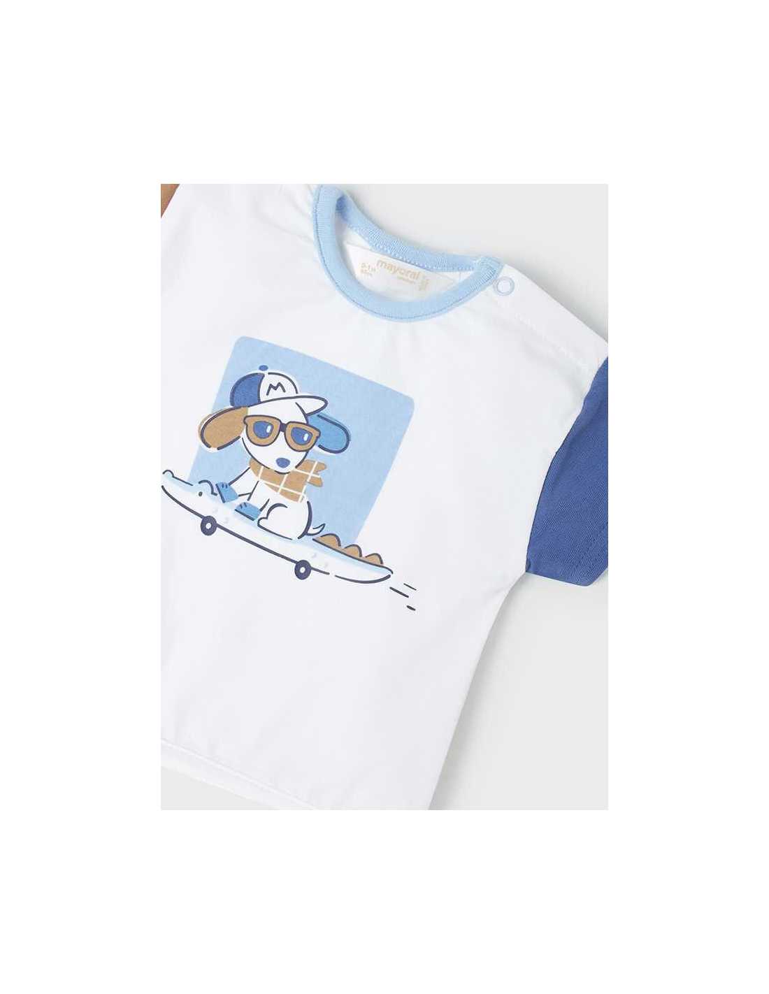 Camiseta de manga corta en tejido a contraste para recién nacido niño. Cuello redondo. Cierre con un único botón a presión. Cómodo tejido de punto. Elementos de adorno: dibujo en la parte delantera.
