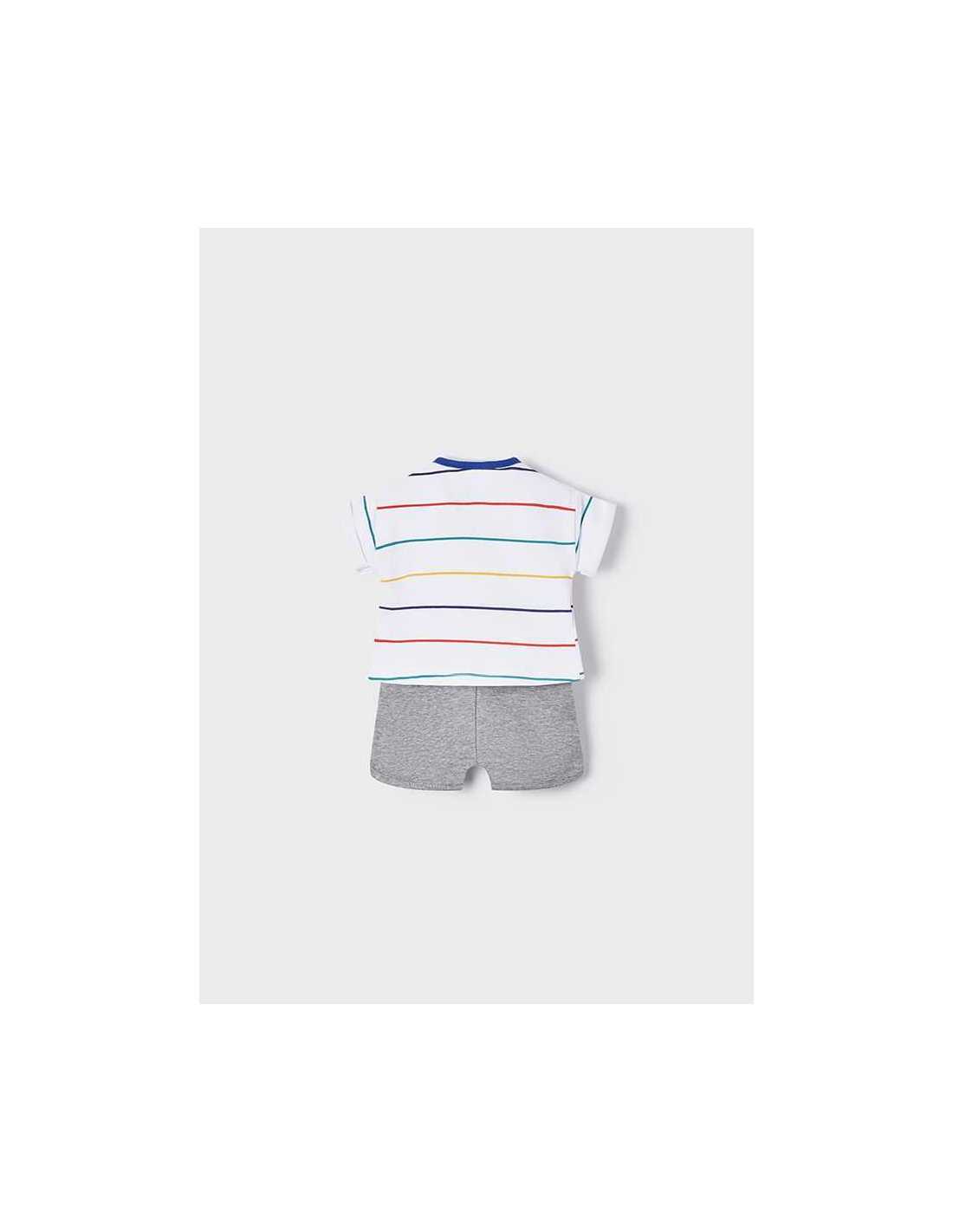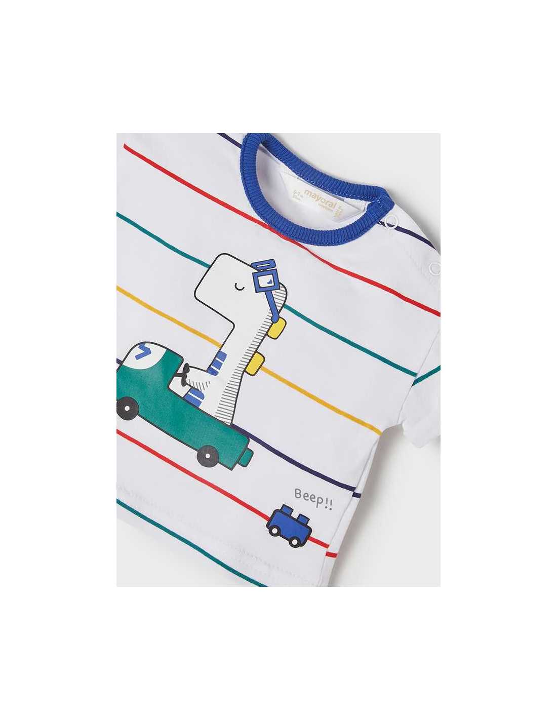 Camiseta de manga corta para recién nacido niño. Cuello redondo en distinto color. Cierre con botones a presión en el hombro para facilitar la puesta de la prenda. Cómodo tejido de punto. Elementos de adorno: dibujo en la parte delantera. Motivo de rayas.