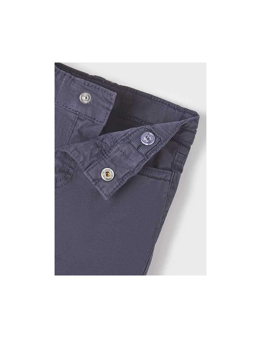 Pantalón de tipo bermuda para bebé niño. Bragueta simulada. Goma elástica regulable en la cintura para ajustar el talle. Cómodo tejido de sarga de gran resistencia. Bolsillos funcionales en el delantero y en la parte trasera de la prenda.