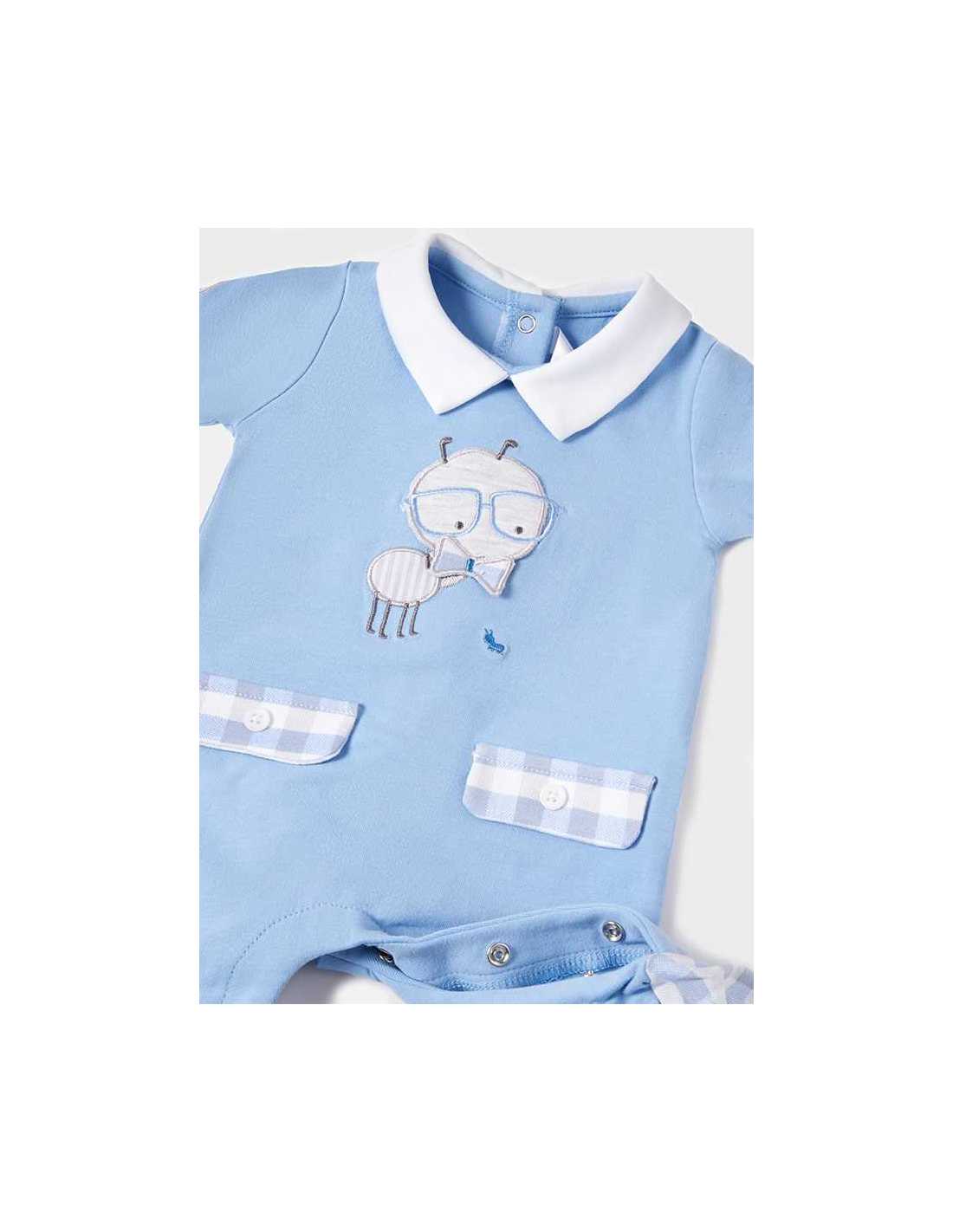 Pijama de manga larga para recién nacido niño. Cuello de polo con detalles en distinto color. Cierre con botones a presión en la parte posterior para facilitar la puesta de la prenda. Cómodo tejido de punto. Elementos de adorno: bordado, modelo con coderas.