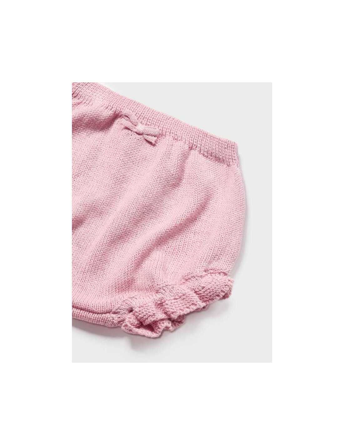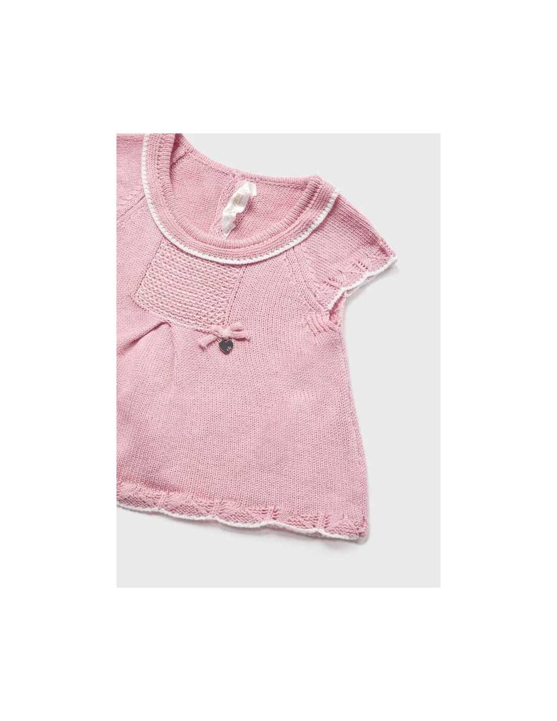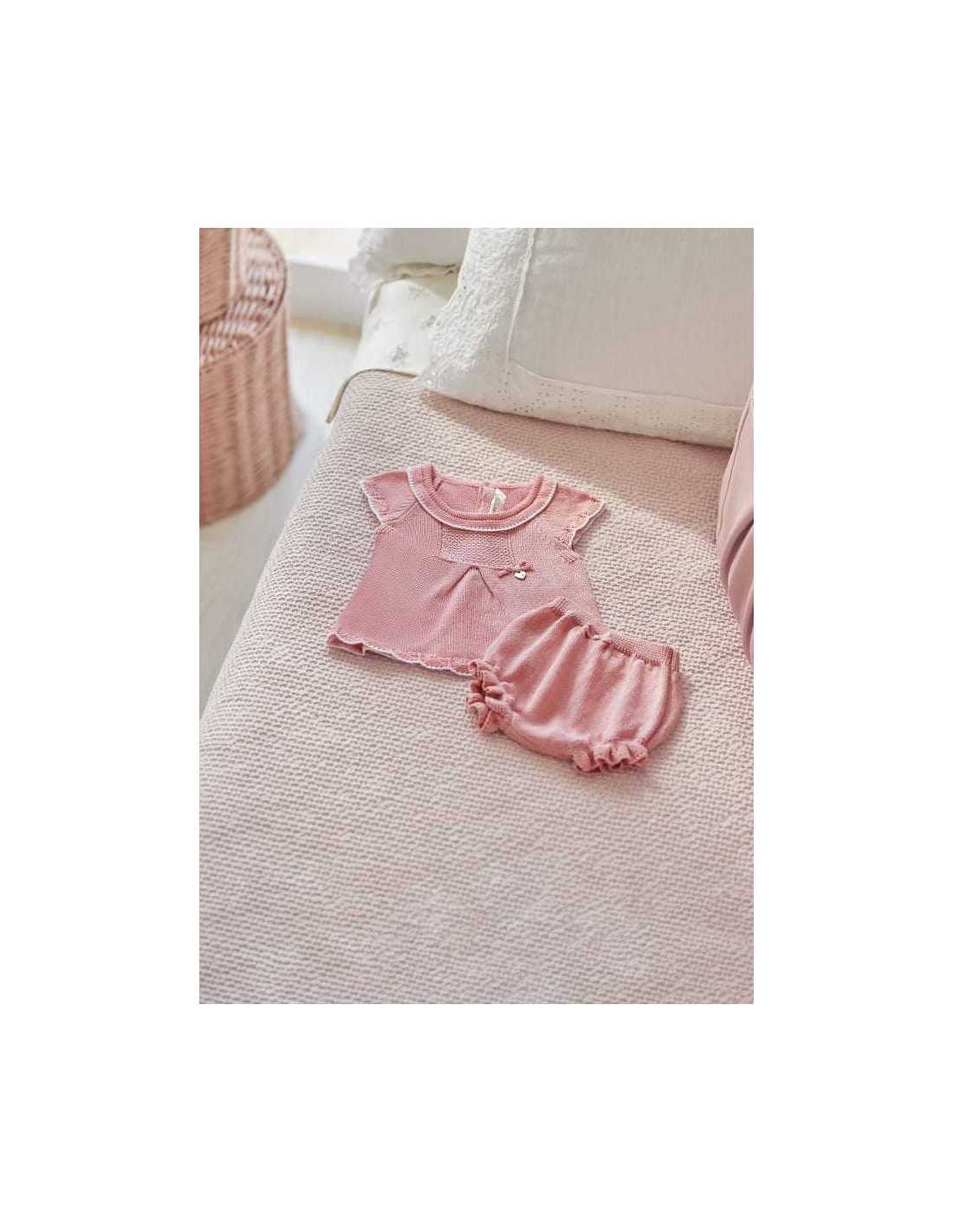 Blusón de manga corta para recién nacido. Cierre con botones en la espalda para facilitar la puesta de la prenda. Elementos de adorno: motivos calados, volante decorativo.