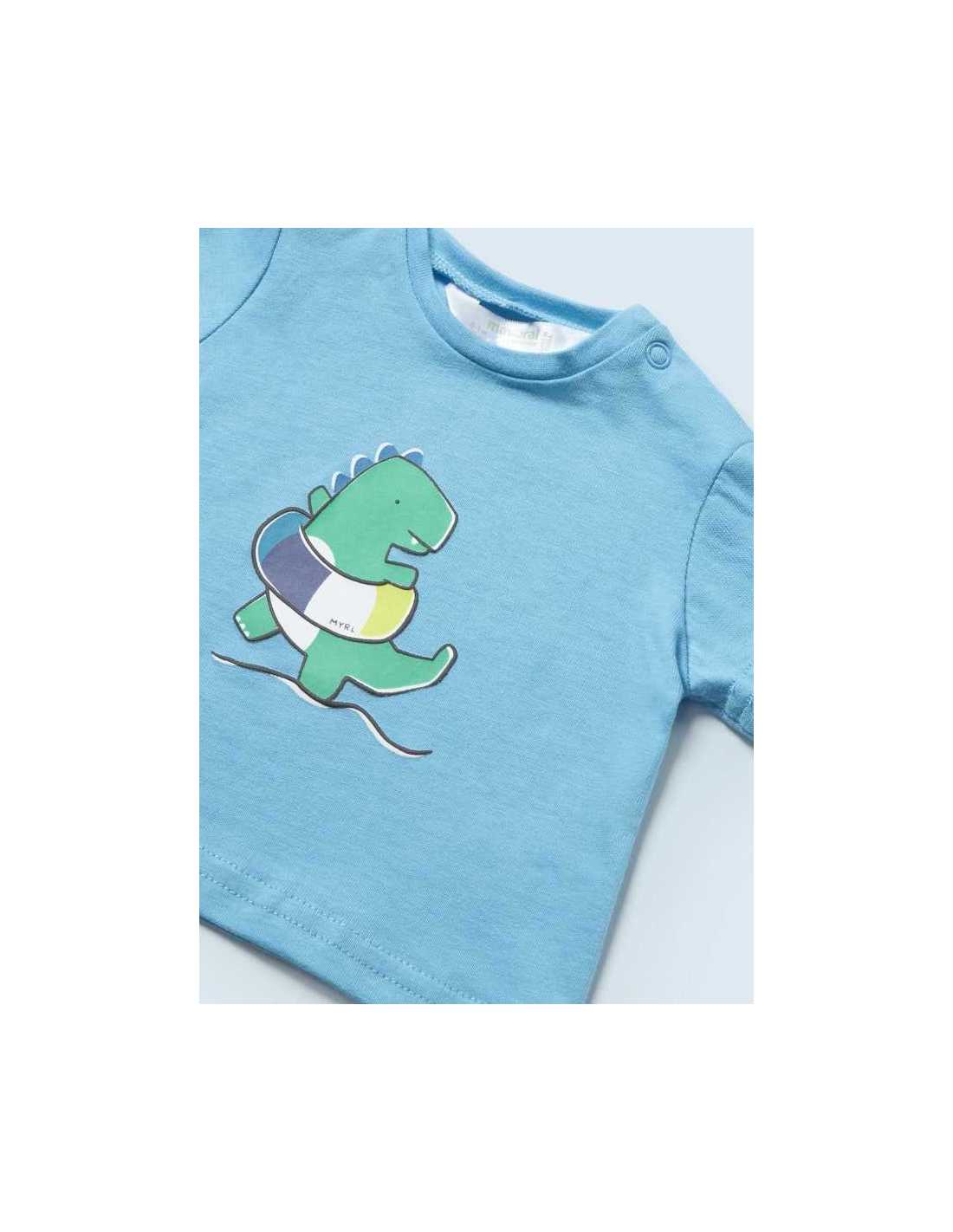 Camiseta de manga corta para recién nacido. Cuello redondo. Cierre con botones a presión en el hombro para facilitar la puesta de la prenda. Suave tejido de algodón elástico. Elementos de adorno: dibujo en la parte delantera.