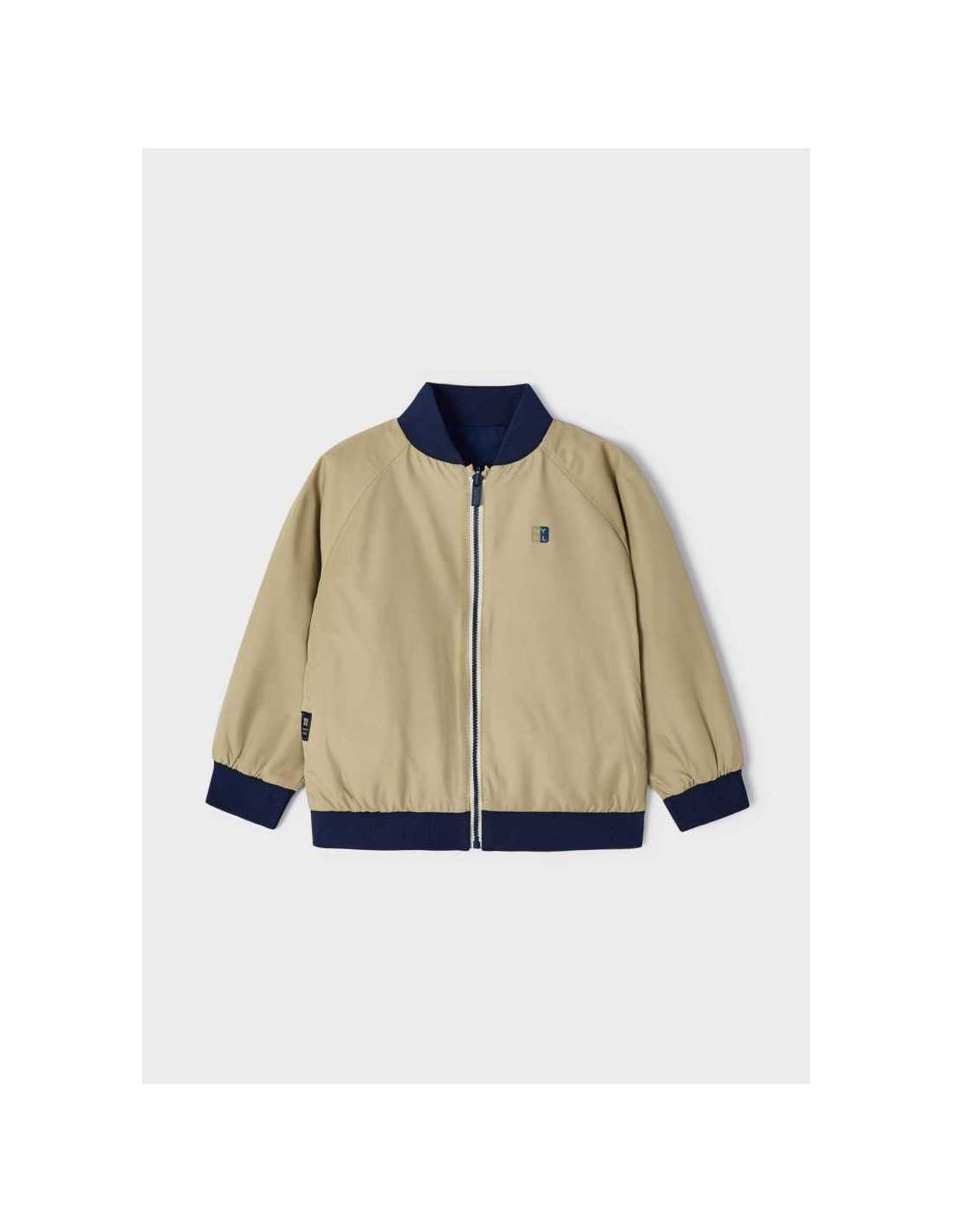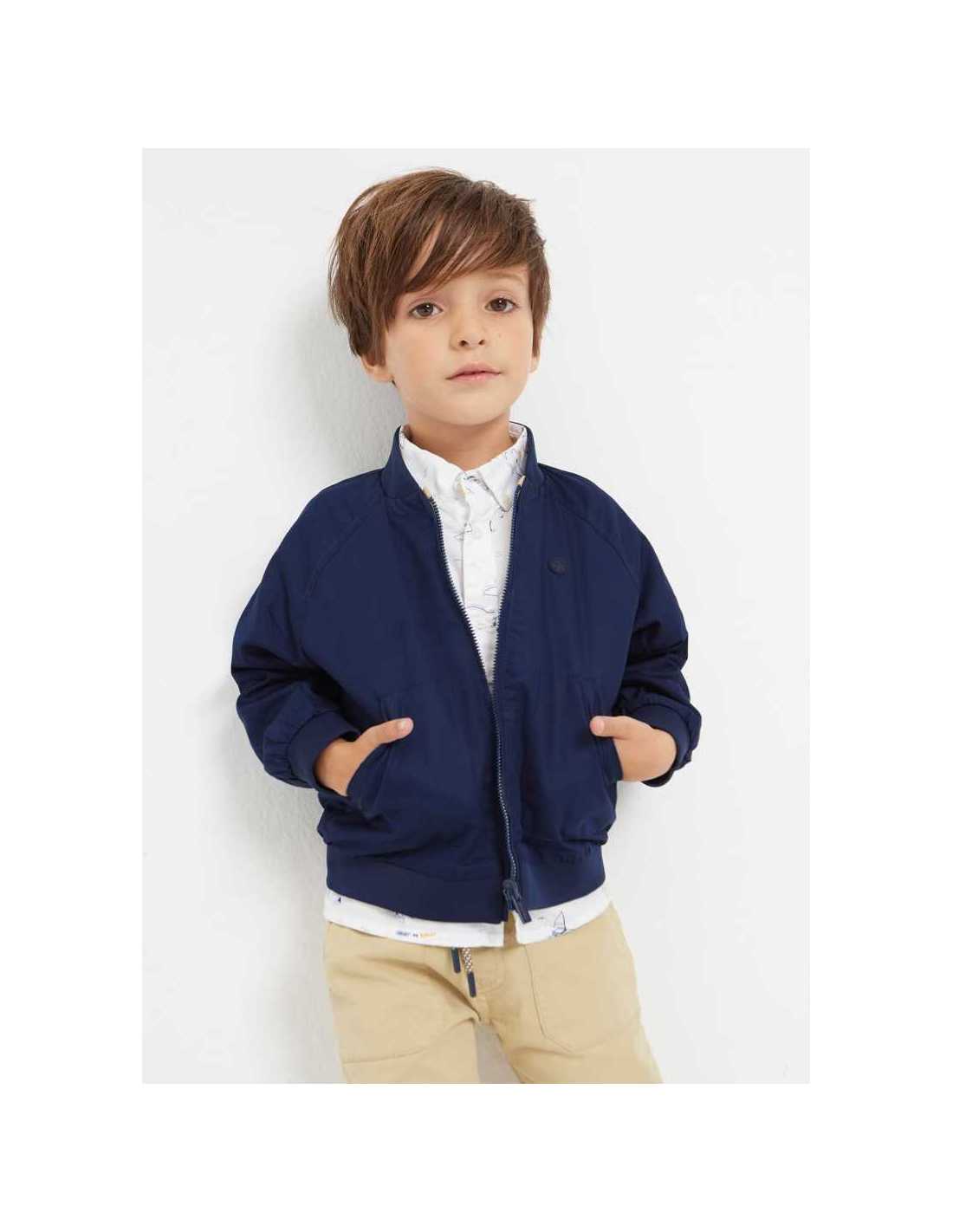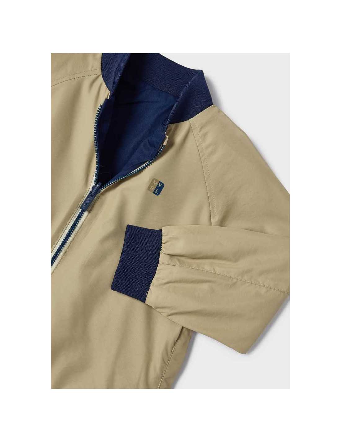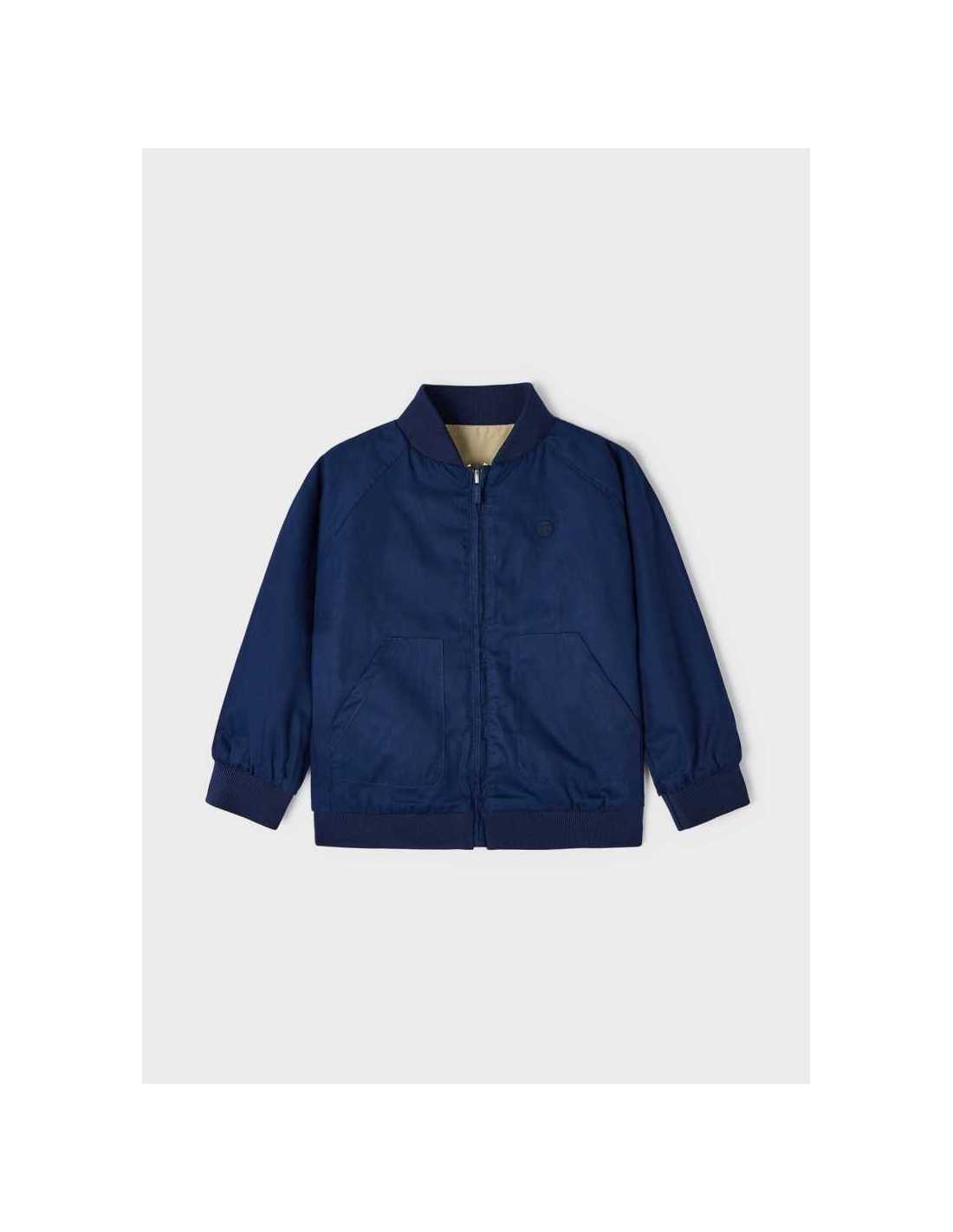 Cortavientos de manga larga para niño. Cuello bomber. Cierre central delantero con cremallera. Bolsillos en los laterales. Este modelo presenta un diseño reversible.