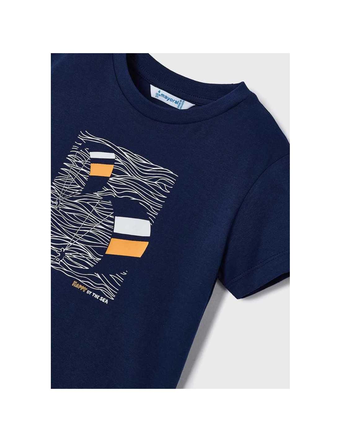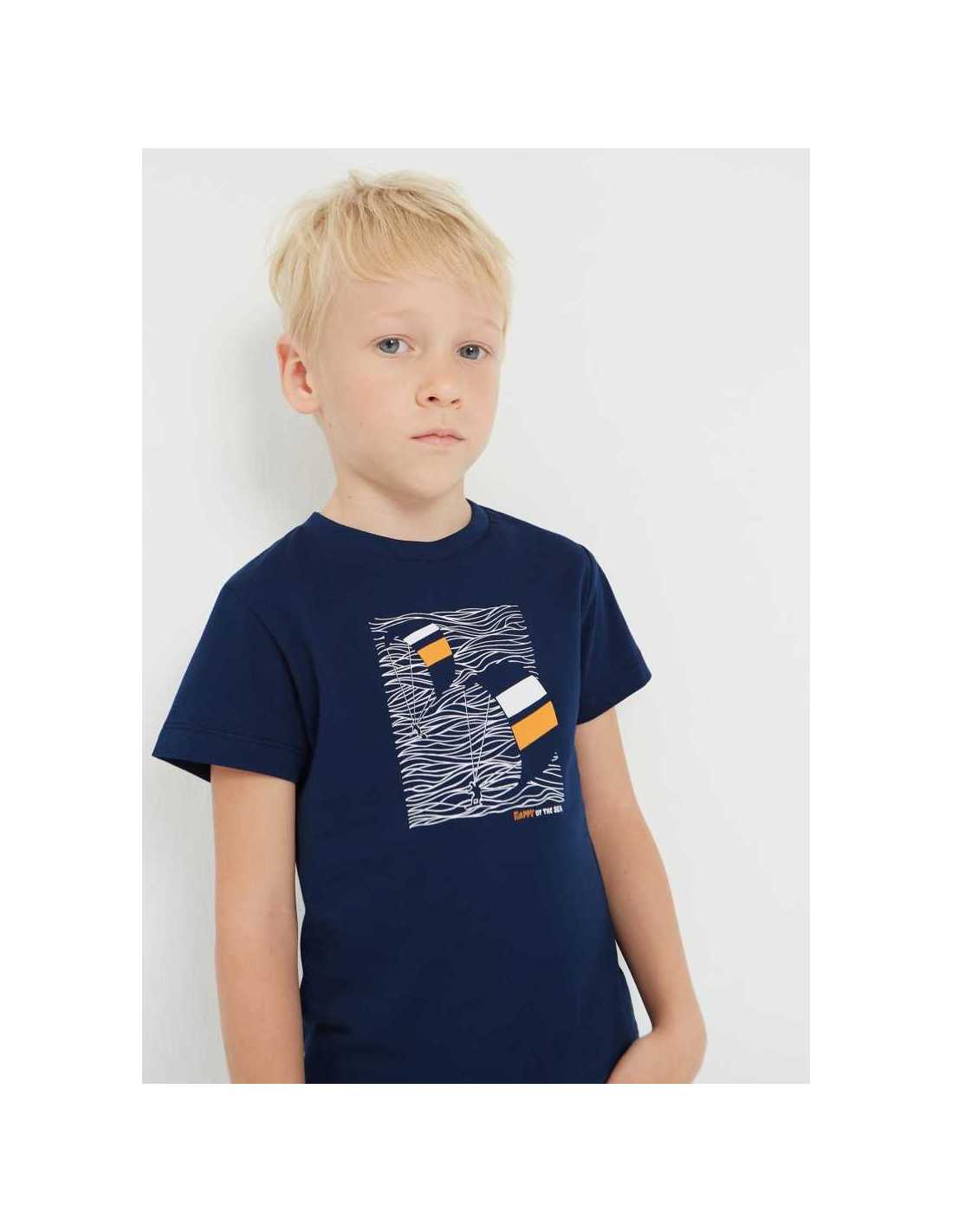 Prenda ECOFRIEND 100% algodón sostenible. Camiseta de manga corta para niño. Cuello redondo. Estampado veraniego.