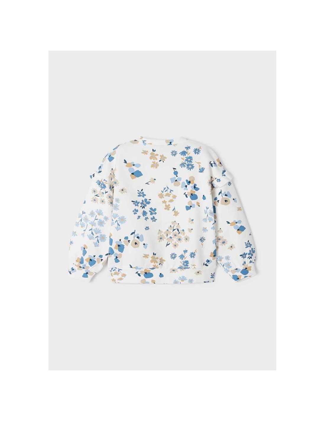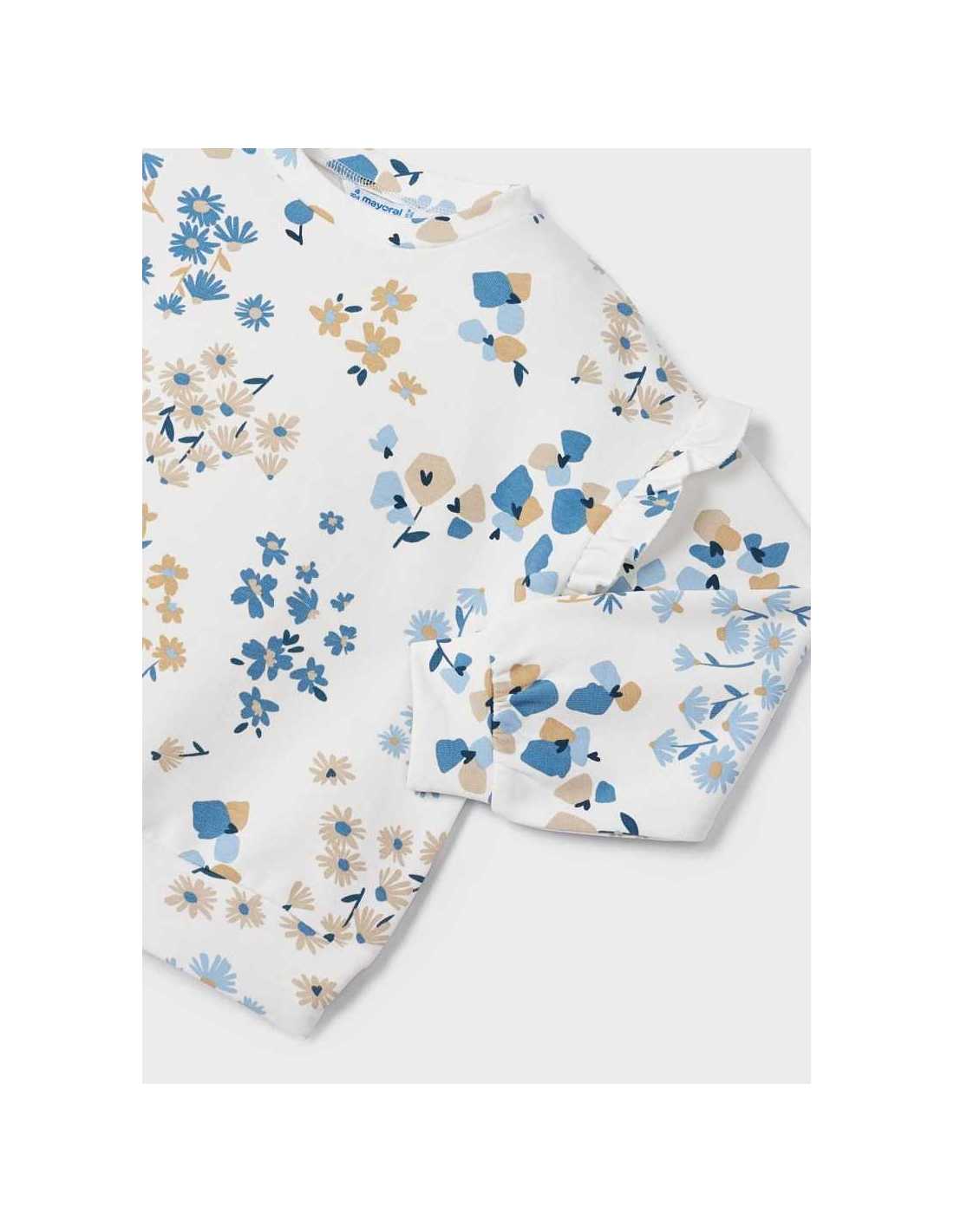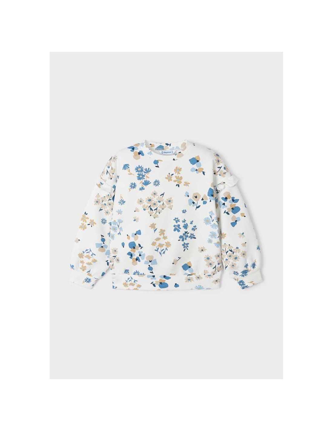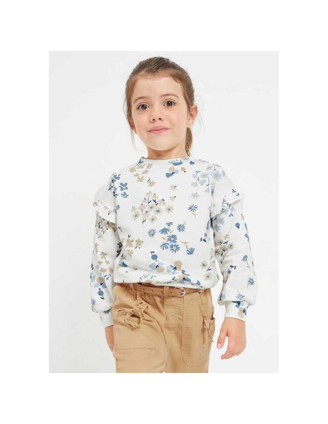 Sudadera de manga larga para niña con volantes en los hombros. Cuello redondo. Estampado con decoración floral.