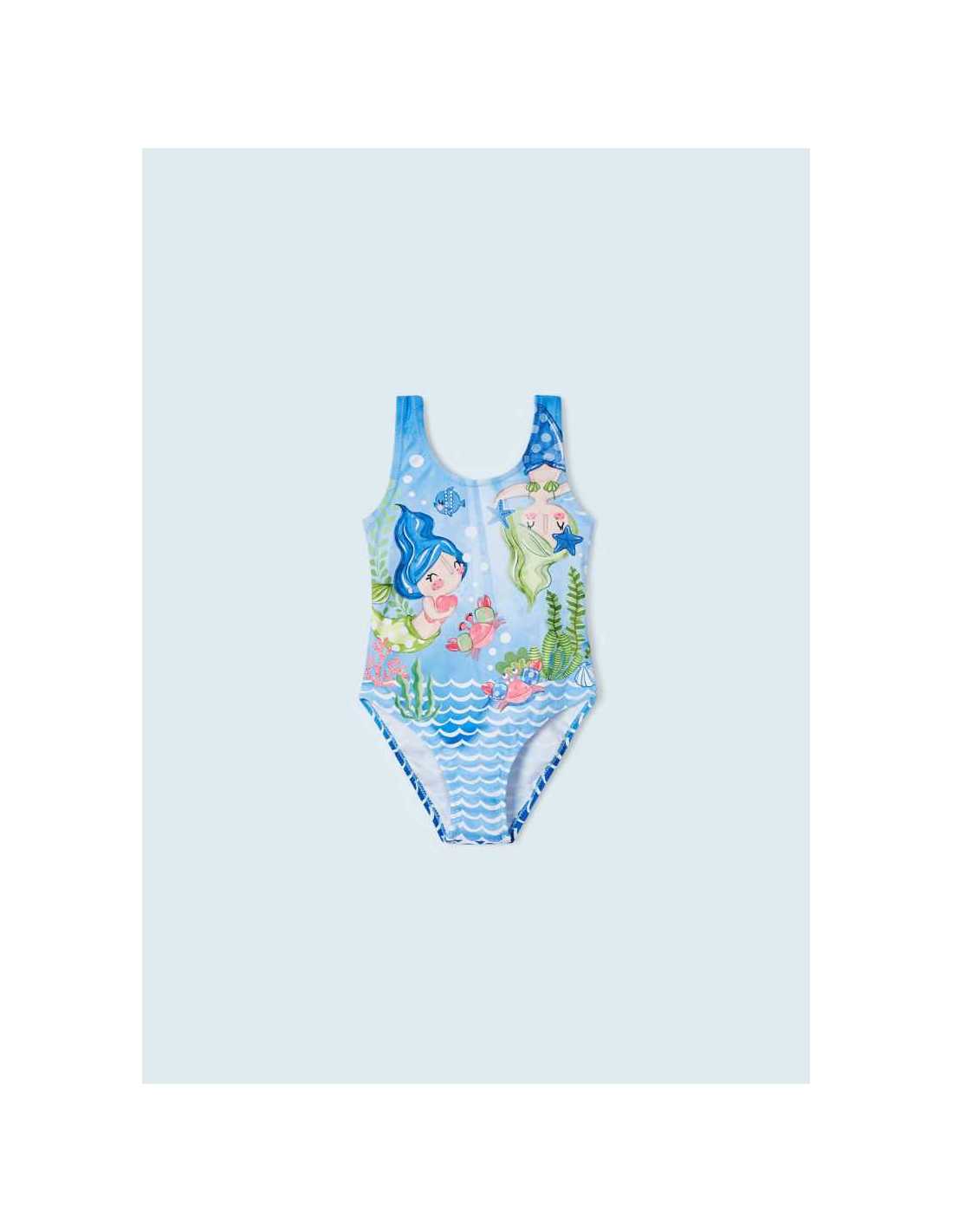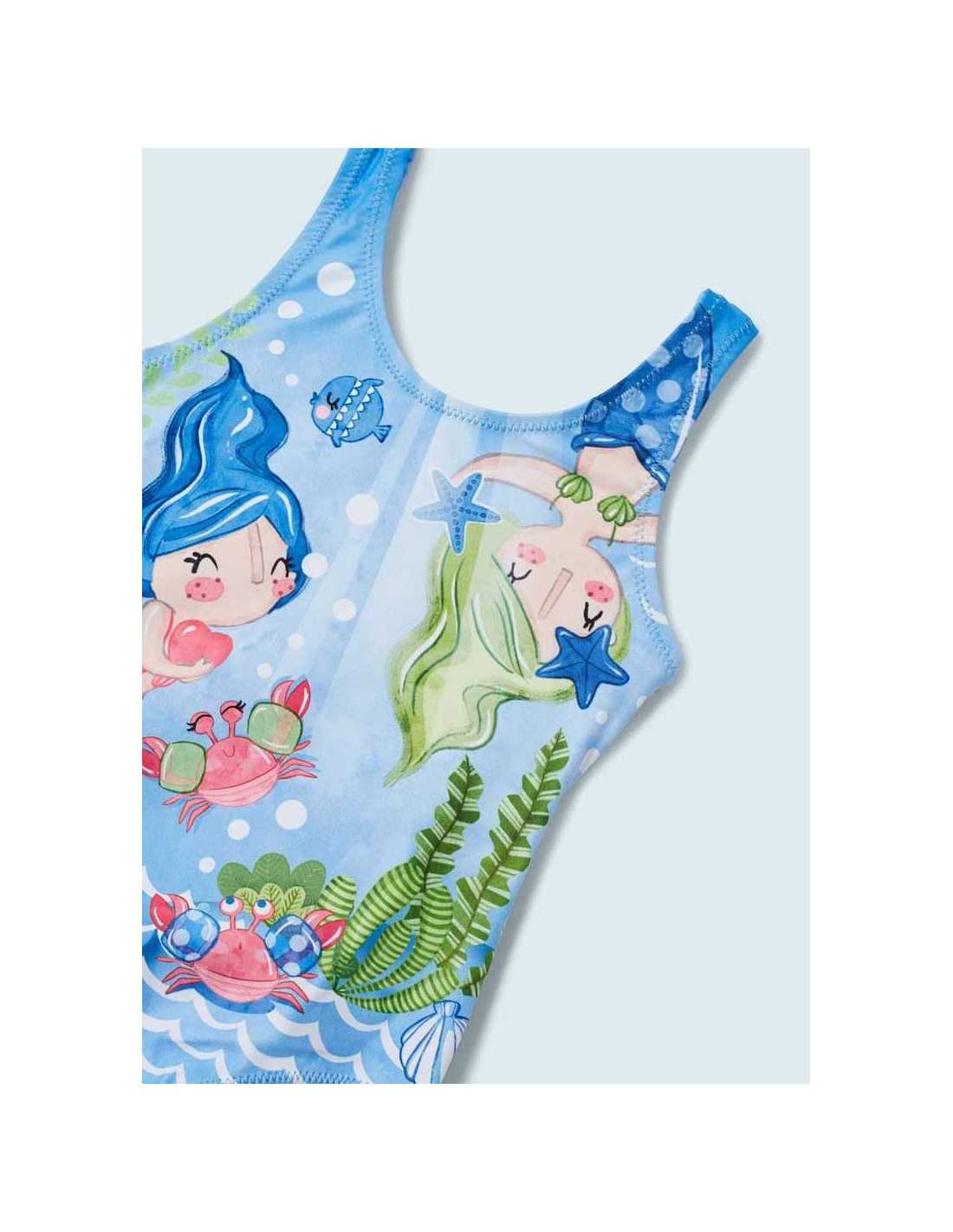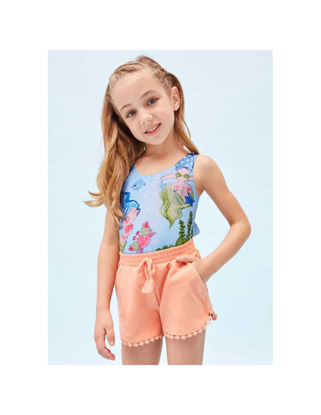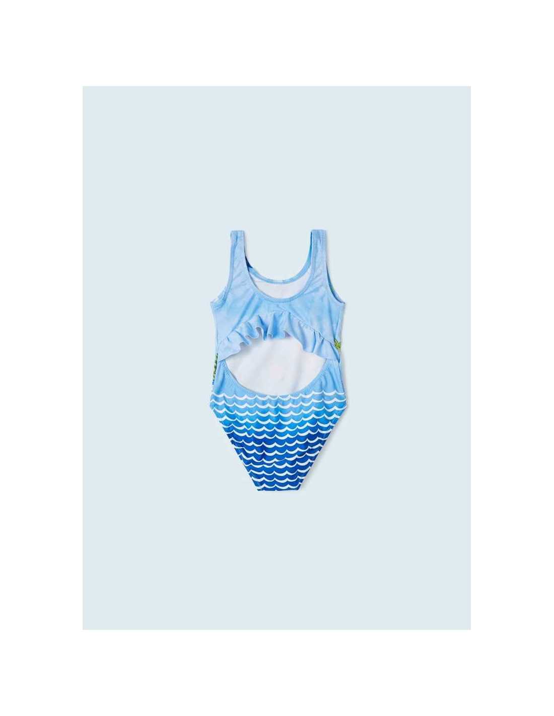 Bañador de tirantes para niña. Tejido fluido para una máxima comodidad en el día a día. Elementos de adorno: volante decorativo. Diseño estampado.