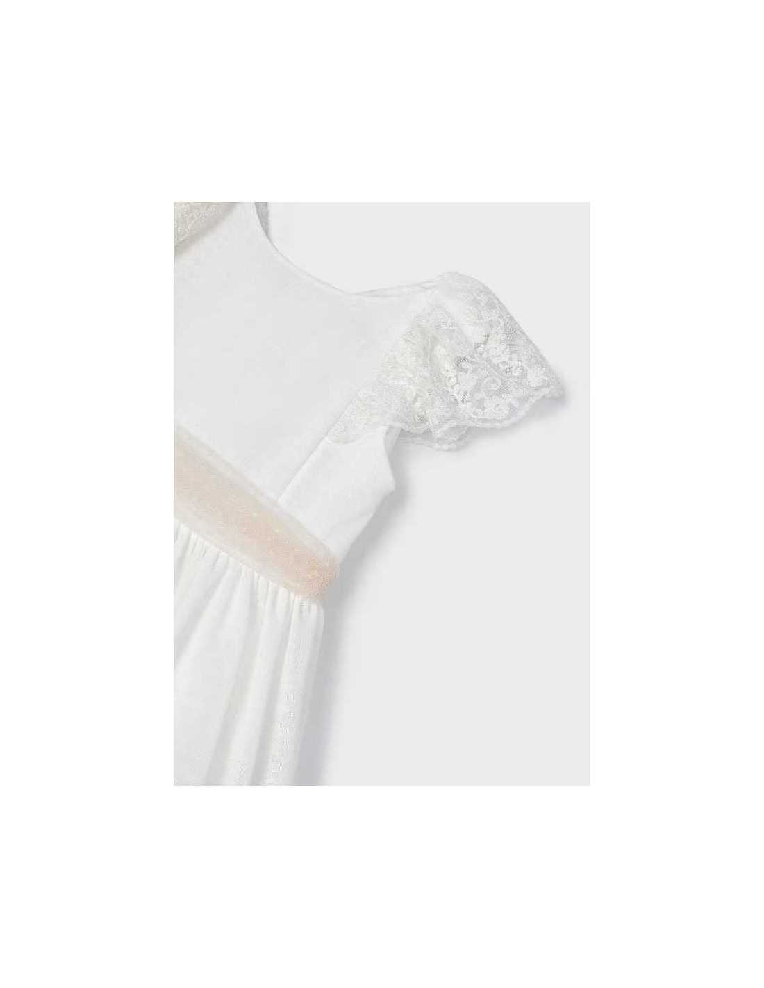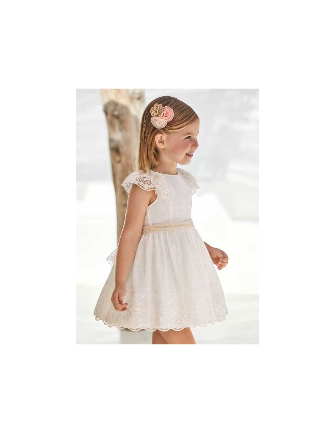 Vestido de manga corta para niña con detalles de volantes. Cierre con cremallera trasera invisible. Tejido rústico suave y transpirable. Elegante fajín a la cintura de tul plumeti. encajes.