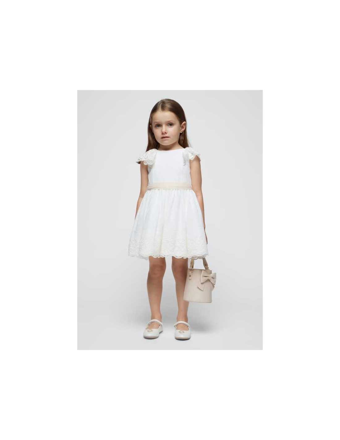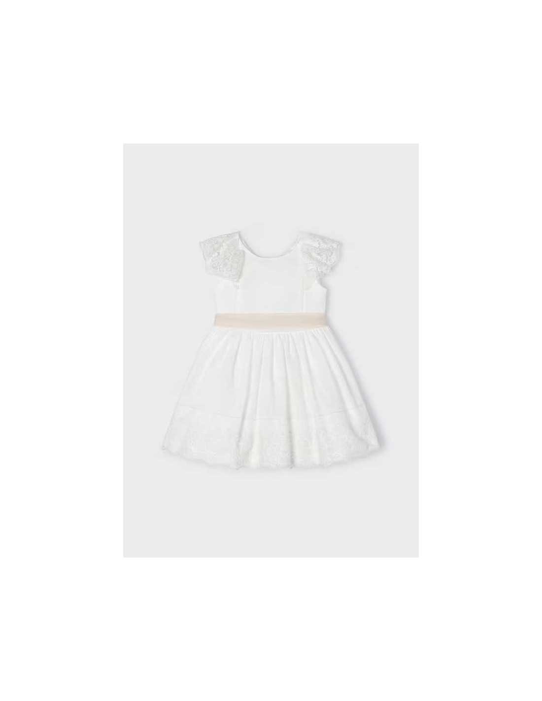 Vestido de manga corta para niña con detalles de volantes. Cierre con cremallera trasera invisible. Tejido rústico suave y transpirable. Elegante fajín a la cintura de tul plumeti. Elementos de adorno: encajes.