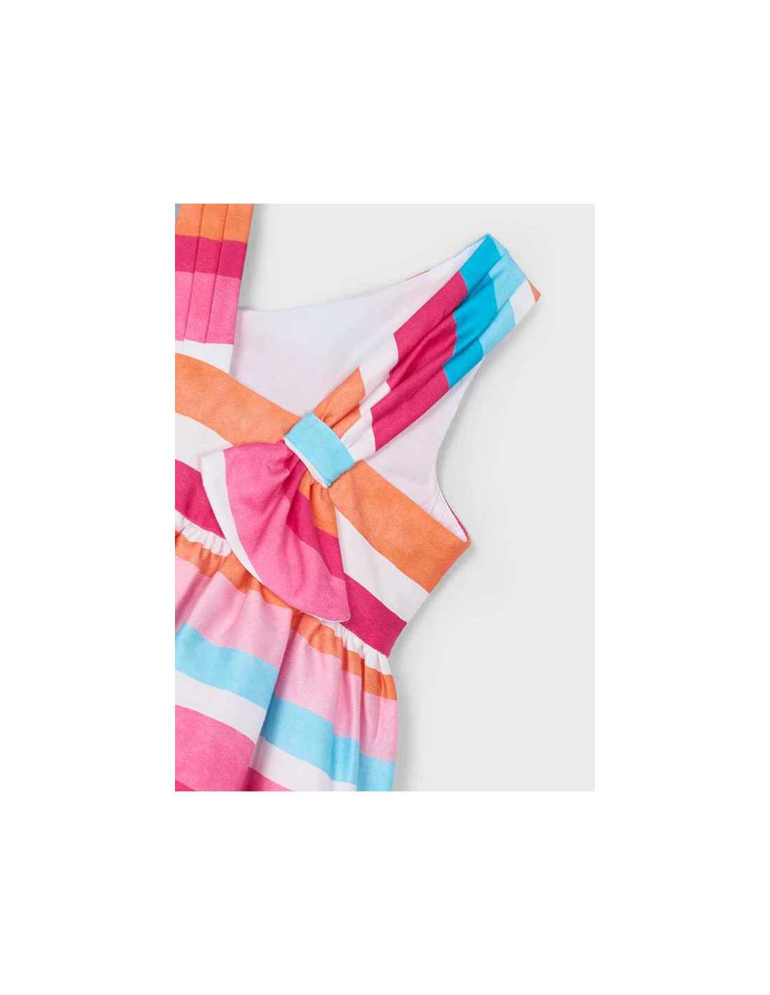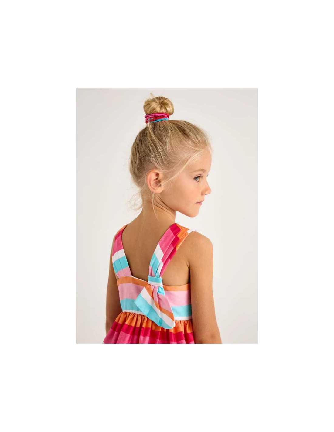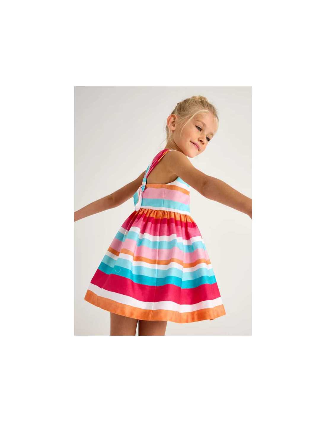 Vestido de tirantes para niña con detalles al tono. Cuello asimétrico. Cierre con cremallera invisible en el lateral de la prenda. Tejido 100% algodón. Modelo con rizo. Motivo de rayas.