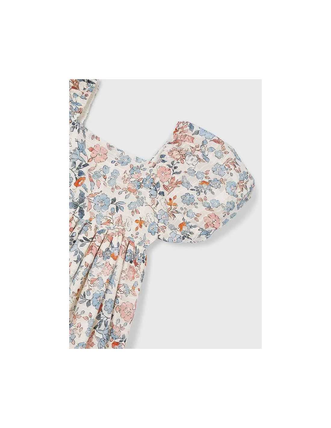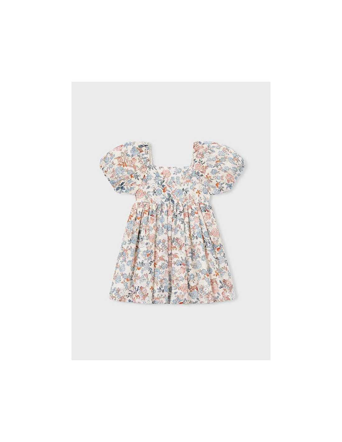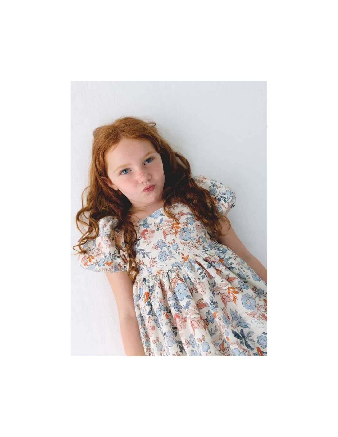 Este vestido está confeccionado en 100% algodón y presenta un diseño con cuello redondo y mangas abullonadas. La falda tiene un corte amplio y cuenta con una cintura elástica que proporciona comodidad. Modelo con forro interior. Disponible en tallas desde los 2 hasta los 10 años.
