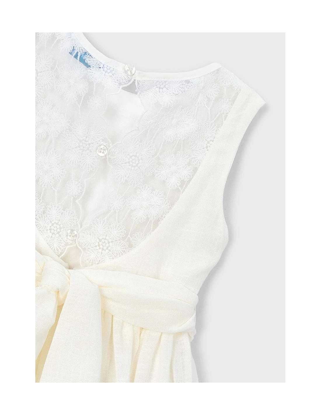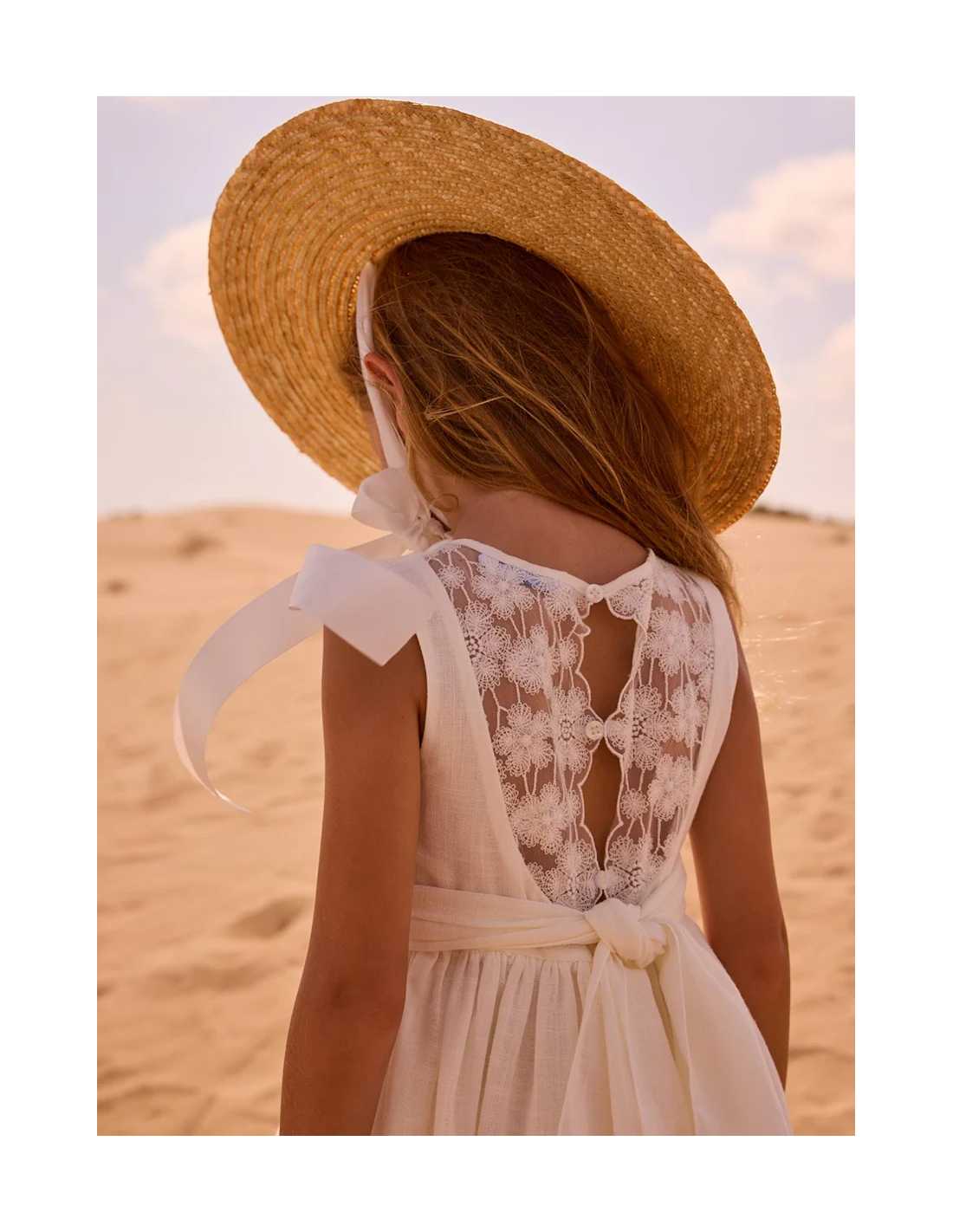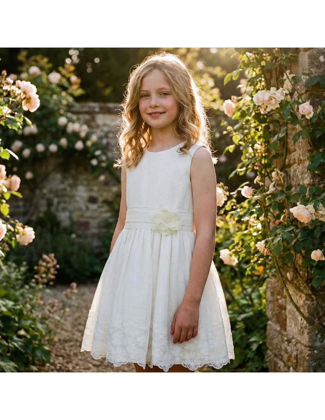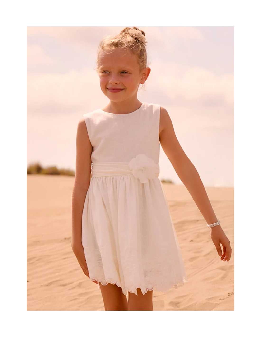 Vestido de ceremonia para niña. Cuello redondo. Fajín decorativo con flor y fornitura debajo. Bajo con rizo y bordado. Modelo con forro interior. Cierre trasero con cremallera invisible.colección de Ceremonia y ha sido diseñado para celebraciones, eventos y ocasiones especiales.