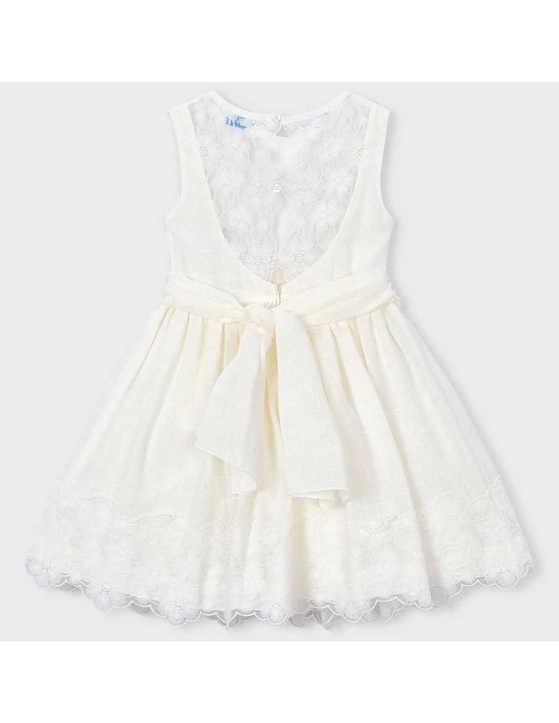 Vestido de ceremonia para niña. Cuello redondo. Fajín decorativo con flor y fornitura debajo. Bajo con rizo y bordado. Modelo con forro interior. Cierre trasero con cremallera invisible. Este exclusivo artículo pertenece a la colección de Ceremonia y ha sido diseñado para celebraciones, eventos y ocasiones especiales. Disponible en la talla desde los 2 a los 10 años.