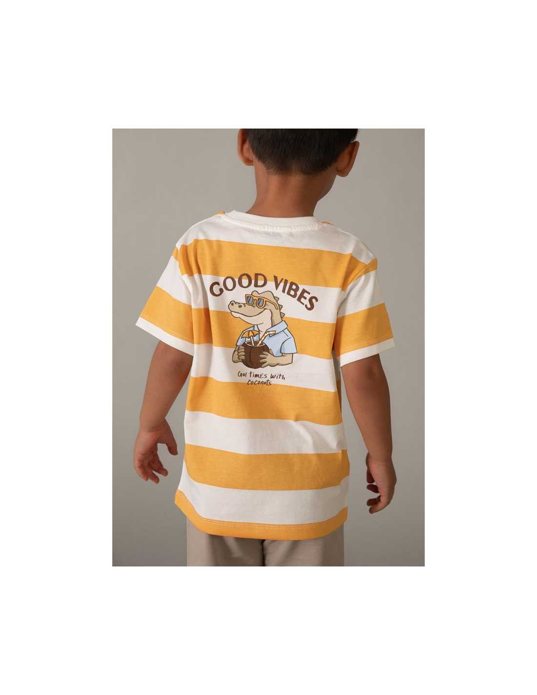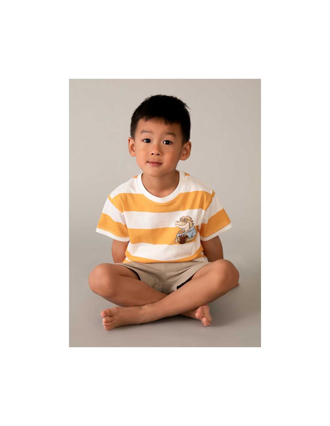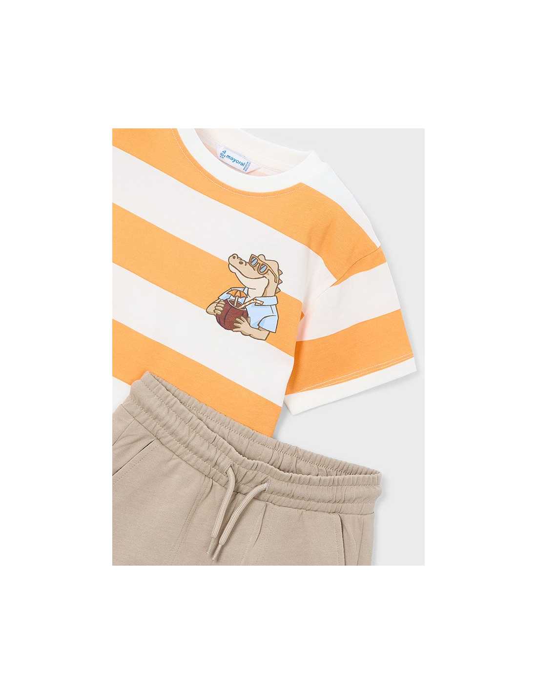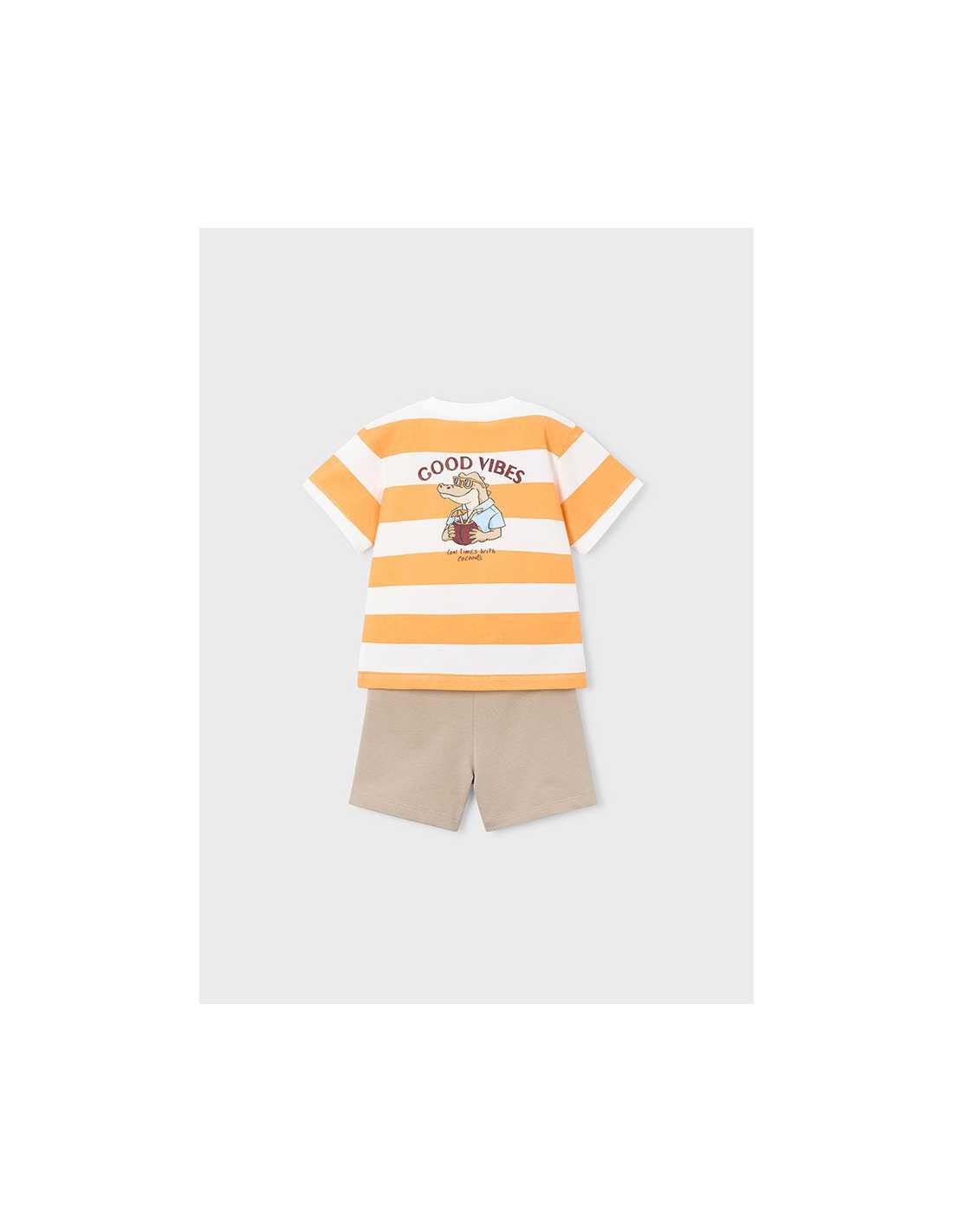 Conjunto de camiseta y pantalones cortos para niño. La camiseta tiene un cuello redondo y mangas cortas, confeccionada en 100% algodón, con un diseño de rayas . Los pantalones cortos incluyen cintura elástica y dos bolsillos frontales. Disponible en la talla desde los 2 a los 10 años.