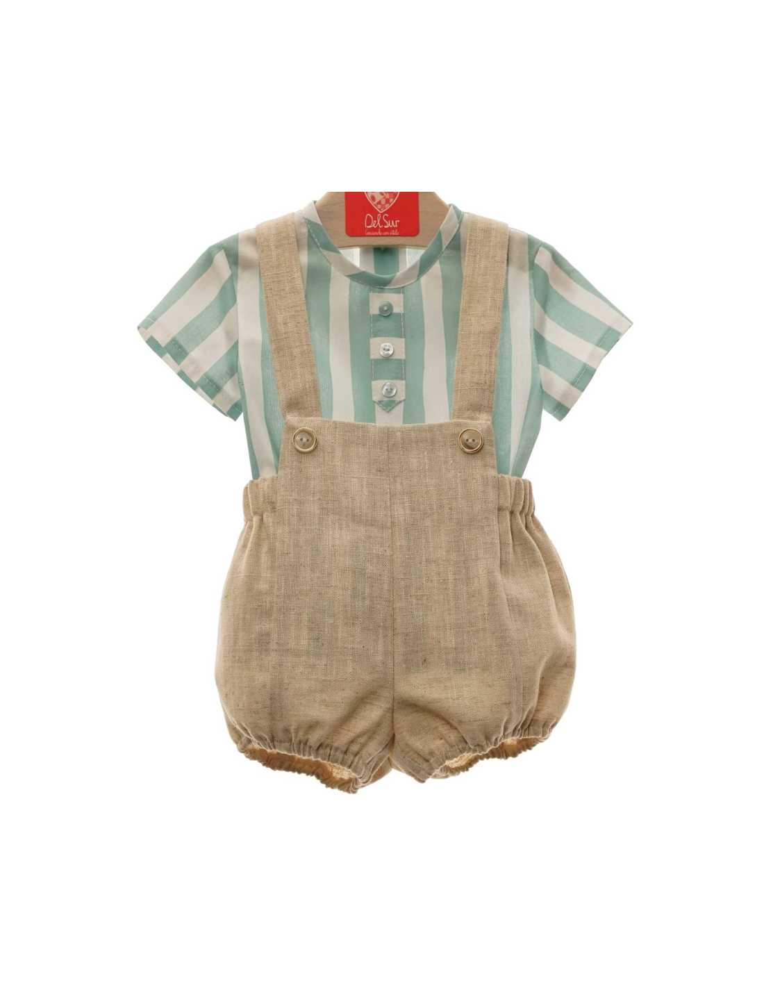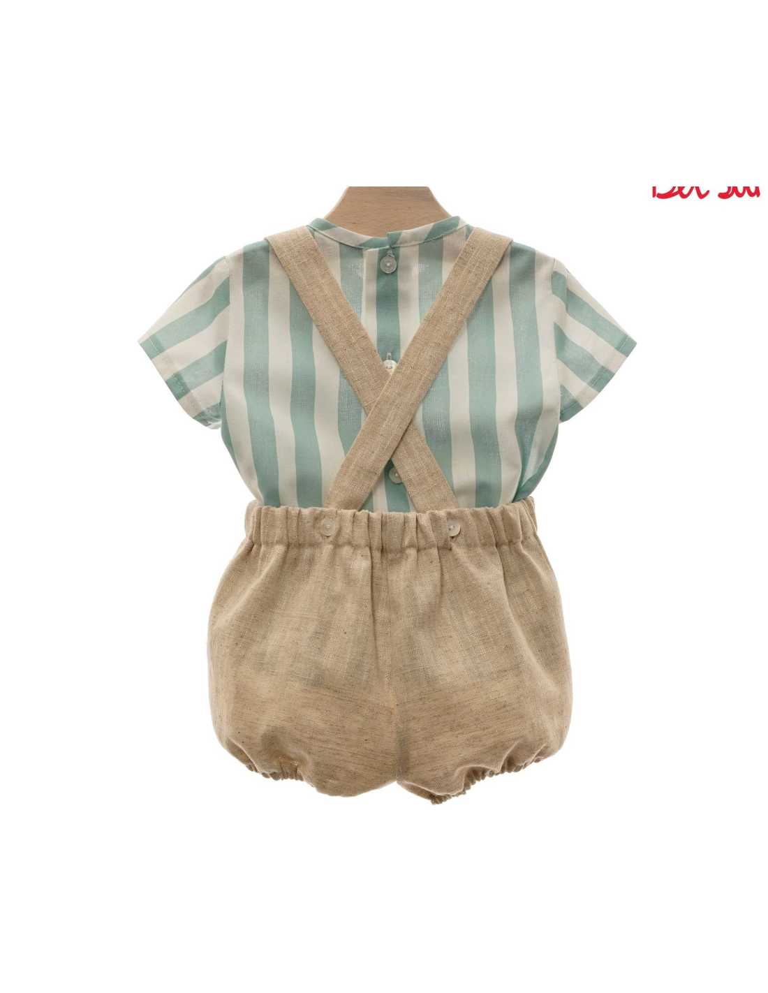 Conjunto ranita tipo peto para bebé niño de la colección MACEDONIA con tirantes y detalle botones frontal. Tejido lino. Camisa en manga corta y cuello redondo. Cierre botones en espalda. Estampado rayas turquesa.