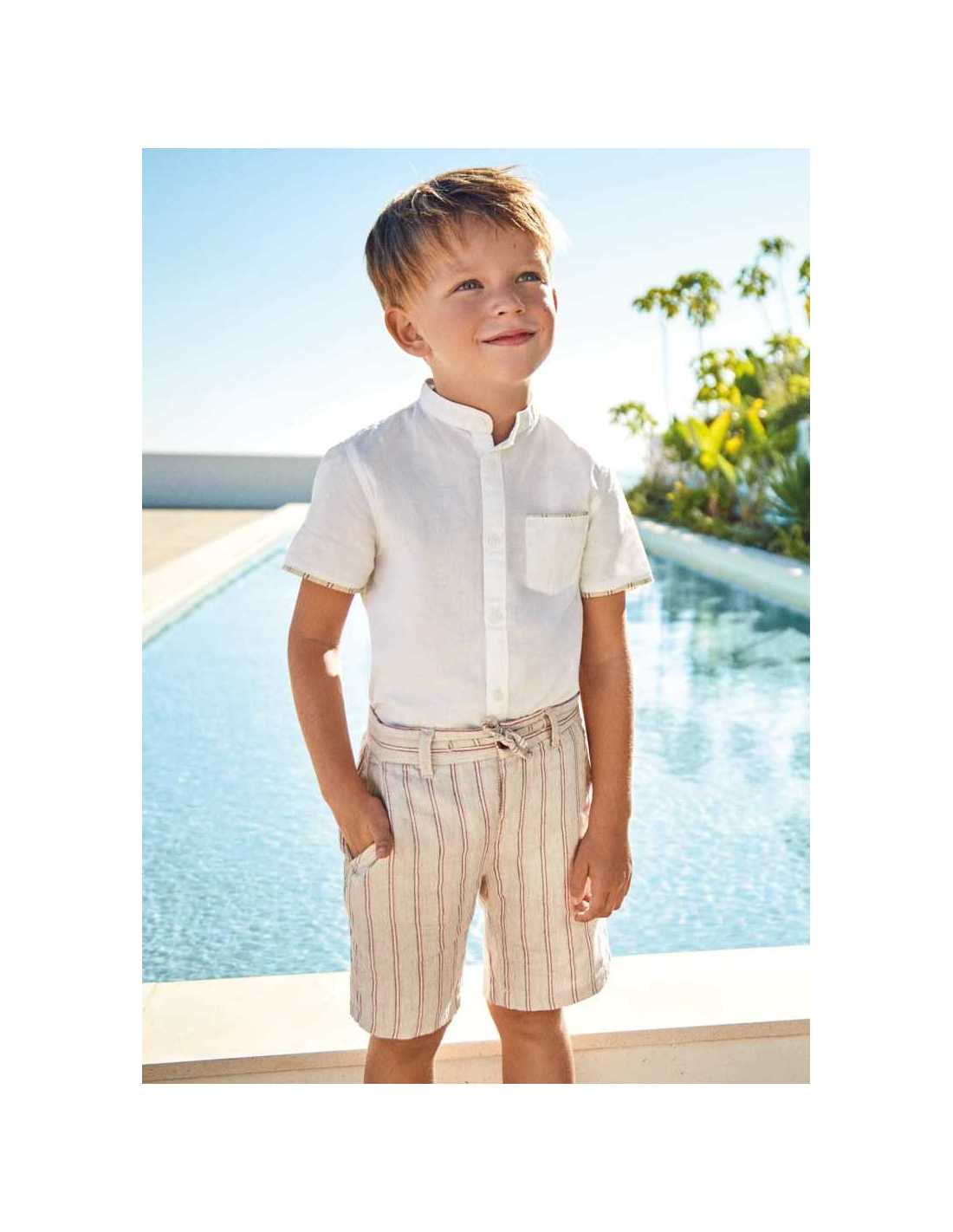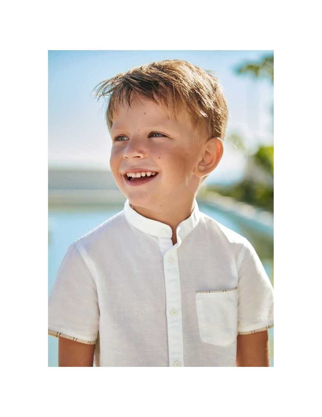 Camisa de manga corta para niño. Modelo con cuello mao al tono. Tejido de aspecto fresco y actual con lino.