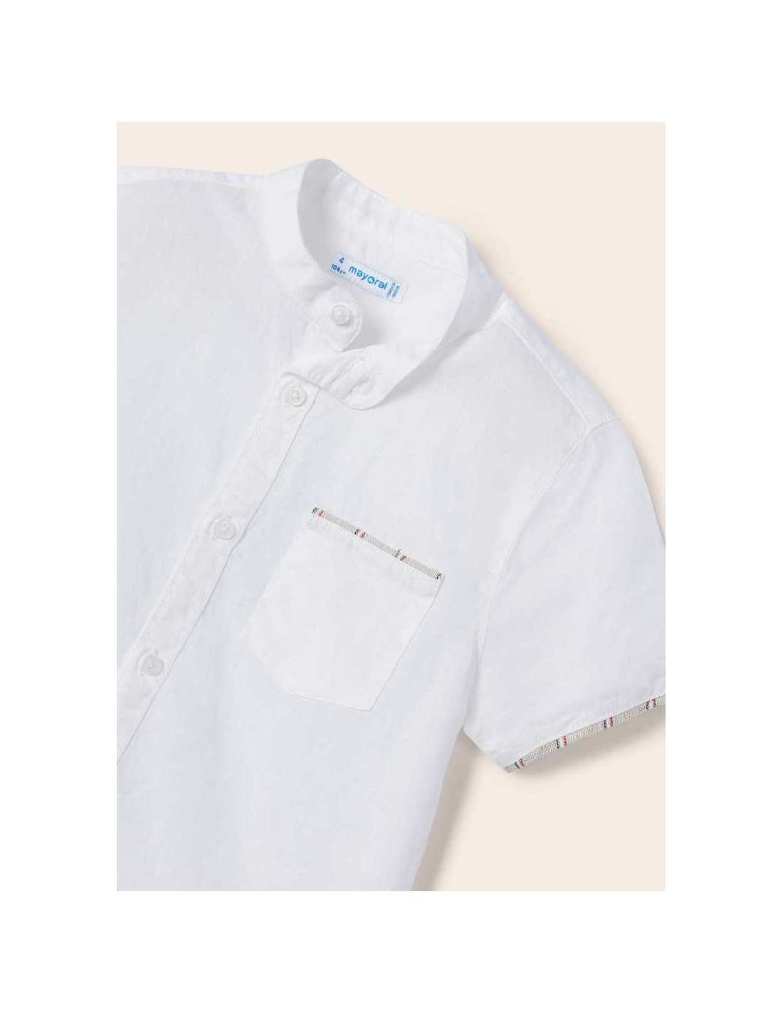 Camisa de manga corta para niño. Modelo con cuello mao al tono. Tejido de aspecto fresco y actual con lino. Bolsillo funcional en la parte delantera.