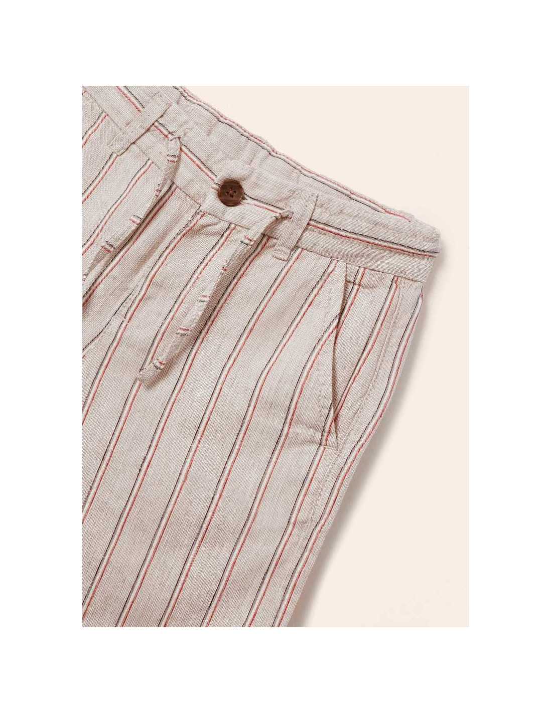 Pantalón de tipo bermuda para niño. Cierre con cremallera y botón. Cintura con cordón interior ajustable. Tejido de aspecto fresco y actual con lino. Bolsillos funcionales en el delantero y en la parte trasera de la prenda. Por motivos de seguridad, las tallas pequeñas (2-5 años) no llevarán cremallera en la bragueta, sino que será simulada.