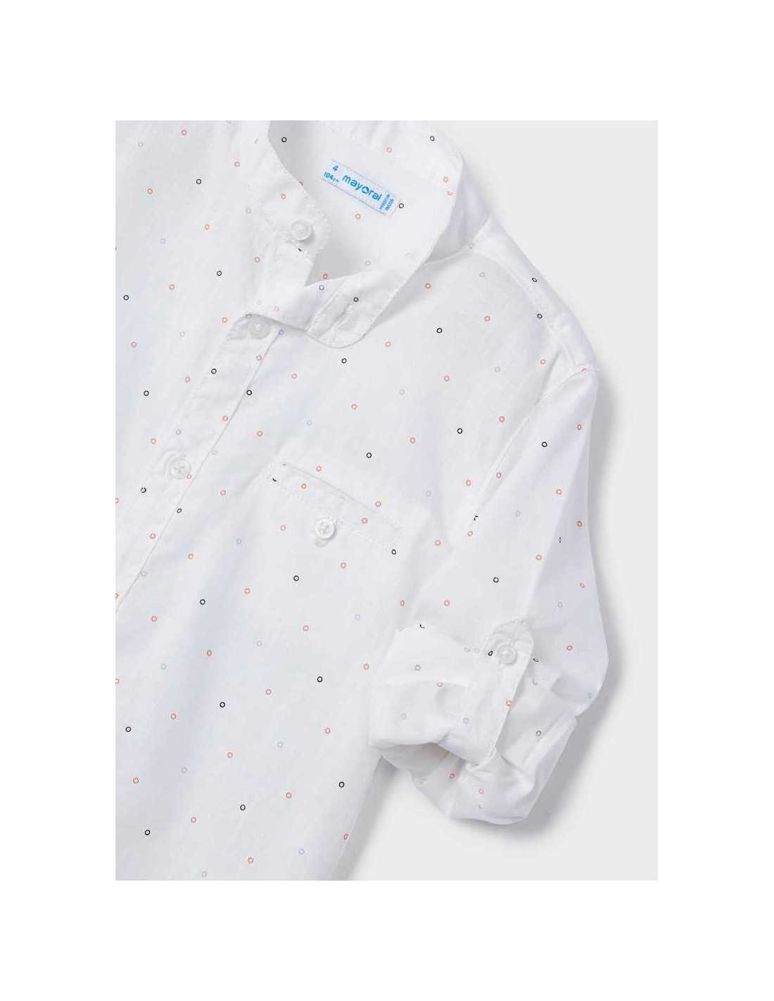 Camisa de manga larga para niño con trabilla y botón en el lateral para poder recogerla y ajustar el largo. Modelo con cuello mao al tono. Tejido 100% algodón. Bolsillo funcional en la parte delantera. Diseño estampado.