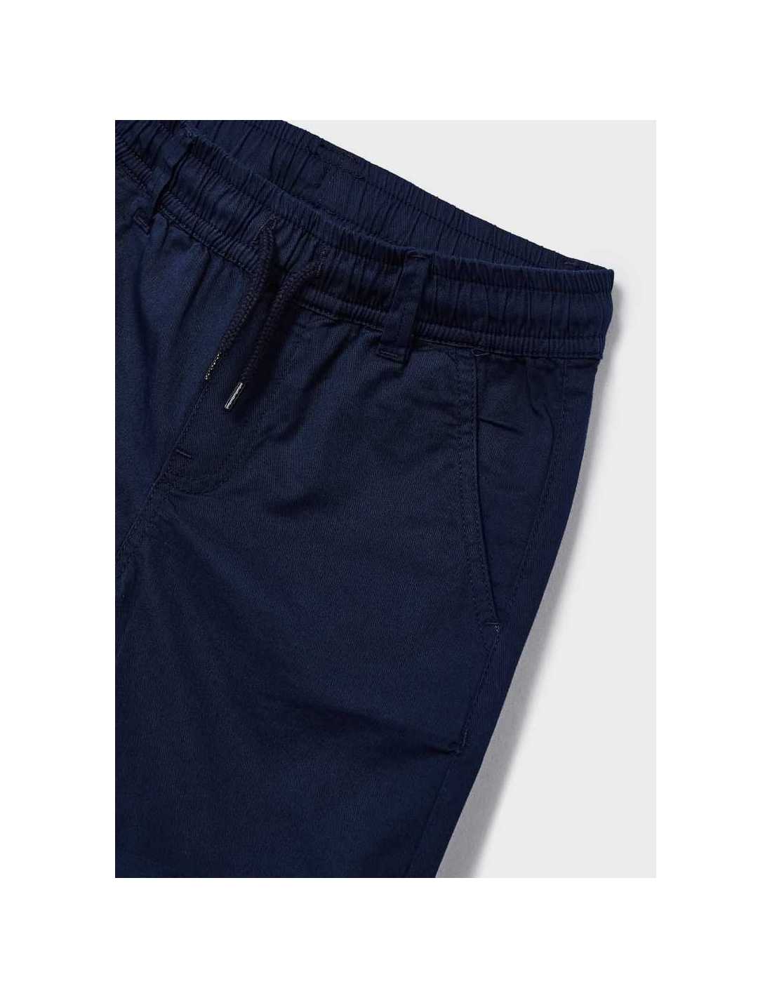 Pantalón de tipo bermuda para niño. Cintura con cordón interior ajustable. Suave tejido de algodón elástico. Bolsillos funcionales en el delantero y en la parte trasera de la prenda.