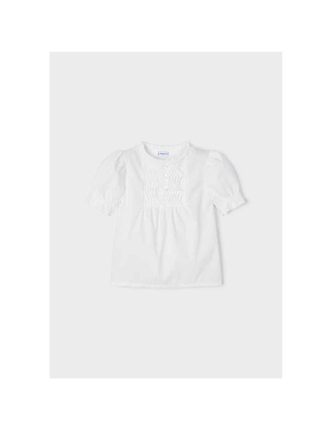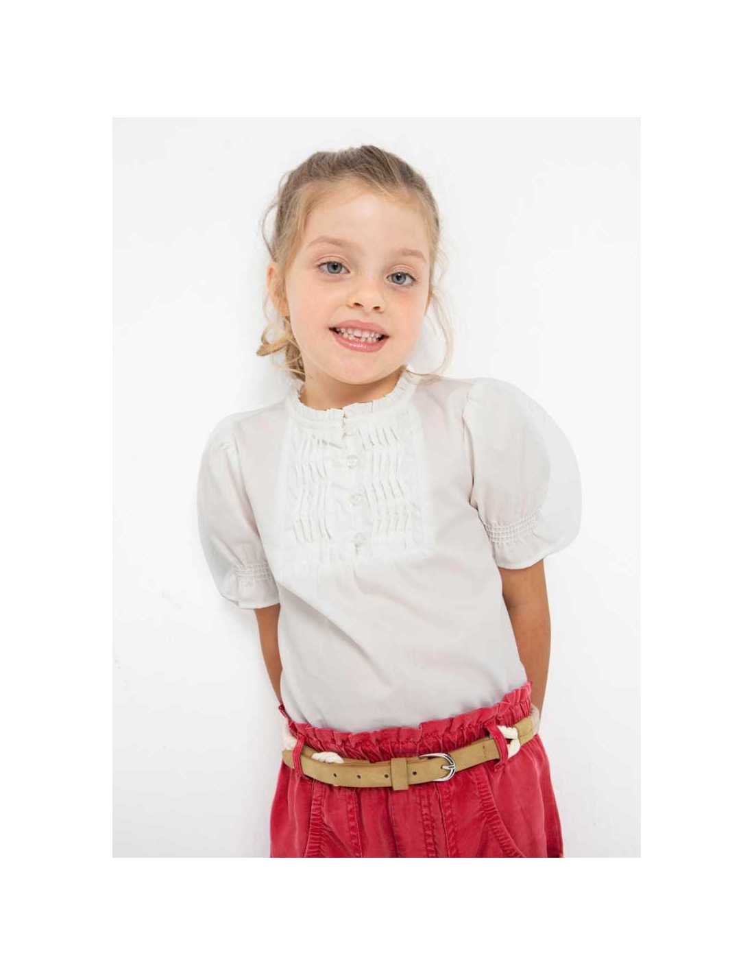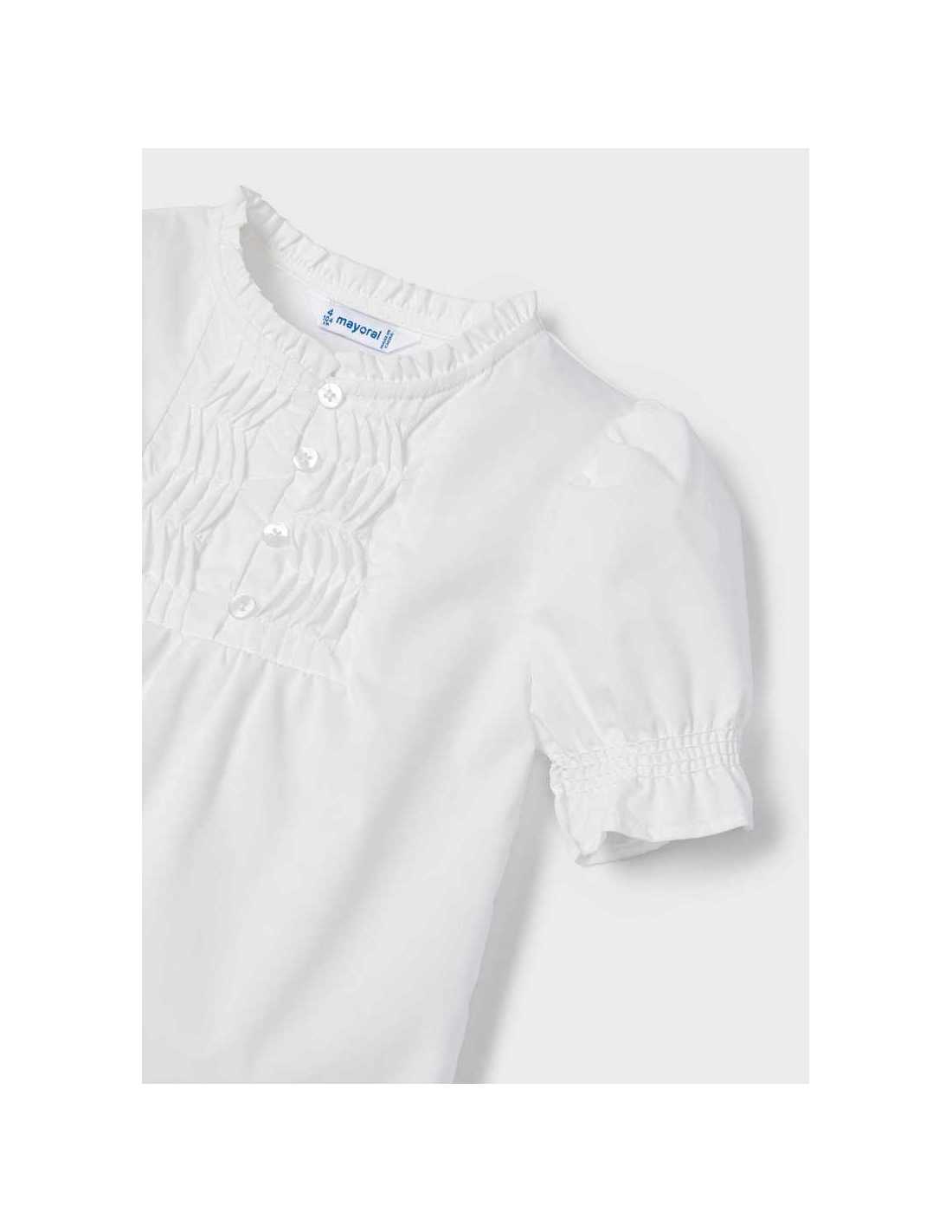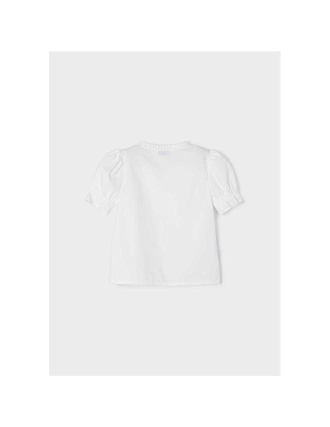 Blusón de manga corta para niña con detalles de volantes. Cuello redondo con volante.