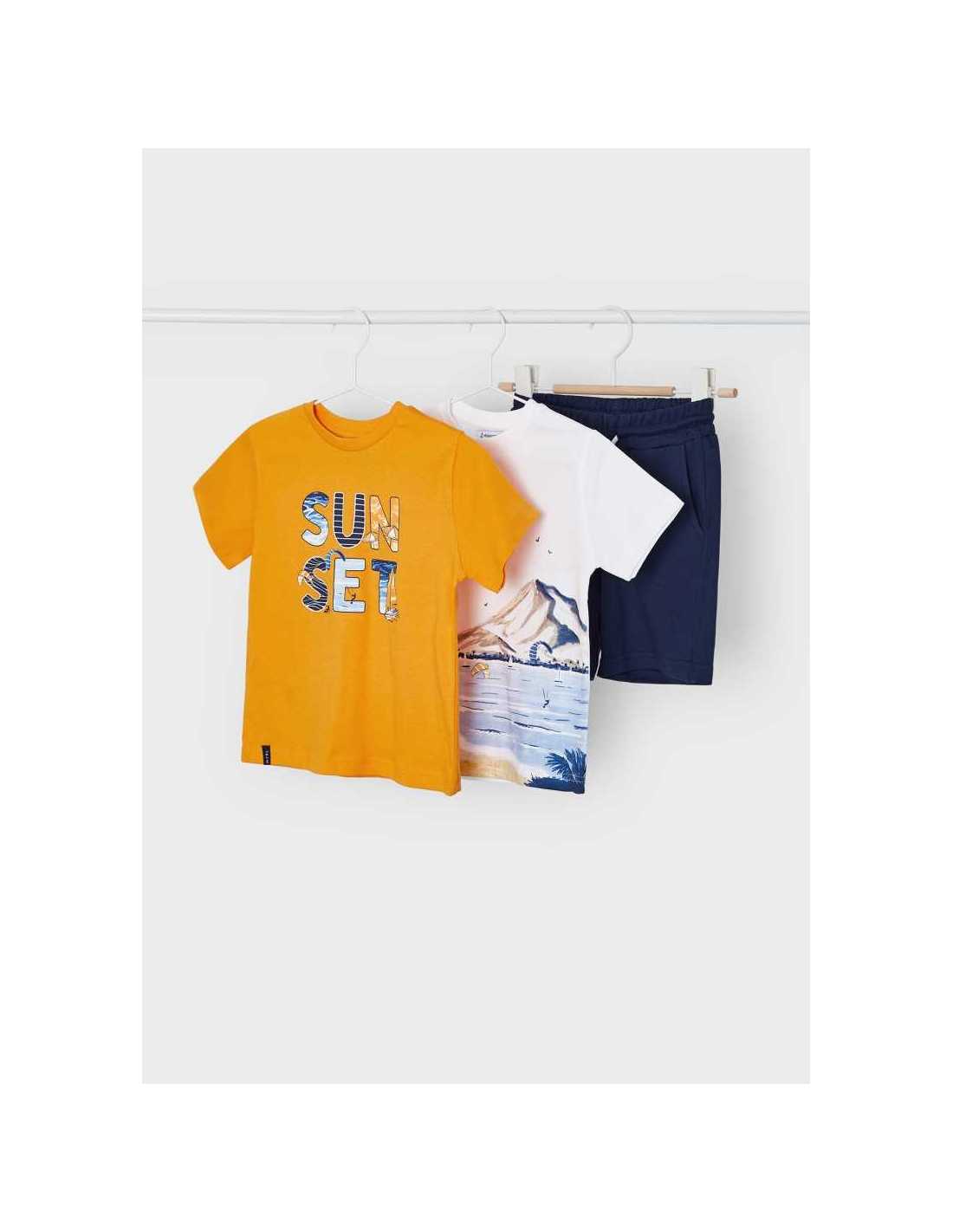 Conjunto de tres piezas para niño formado por dos camisetas y un pantalón corto coordinado.