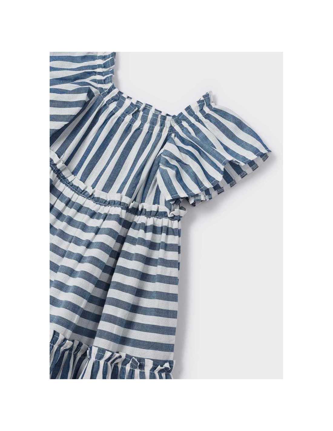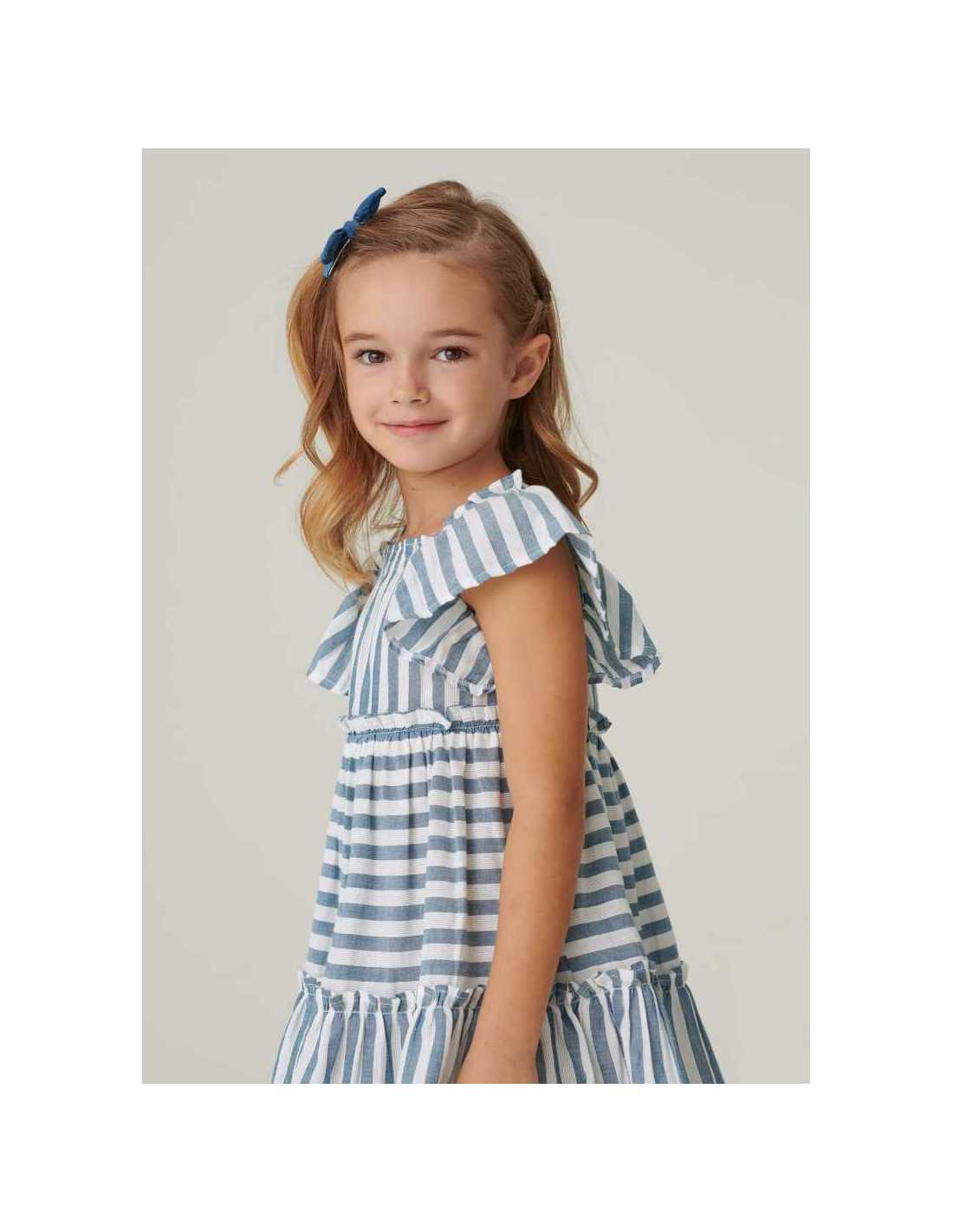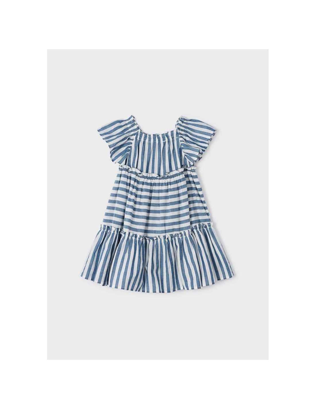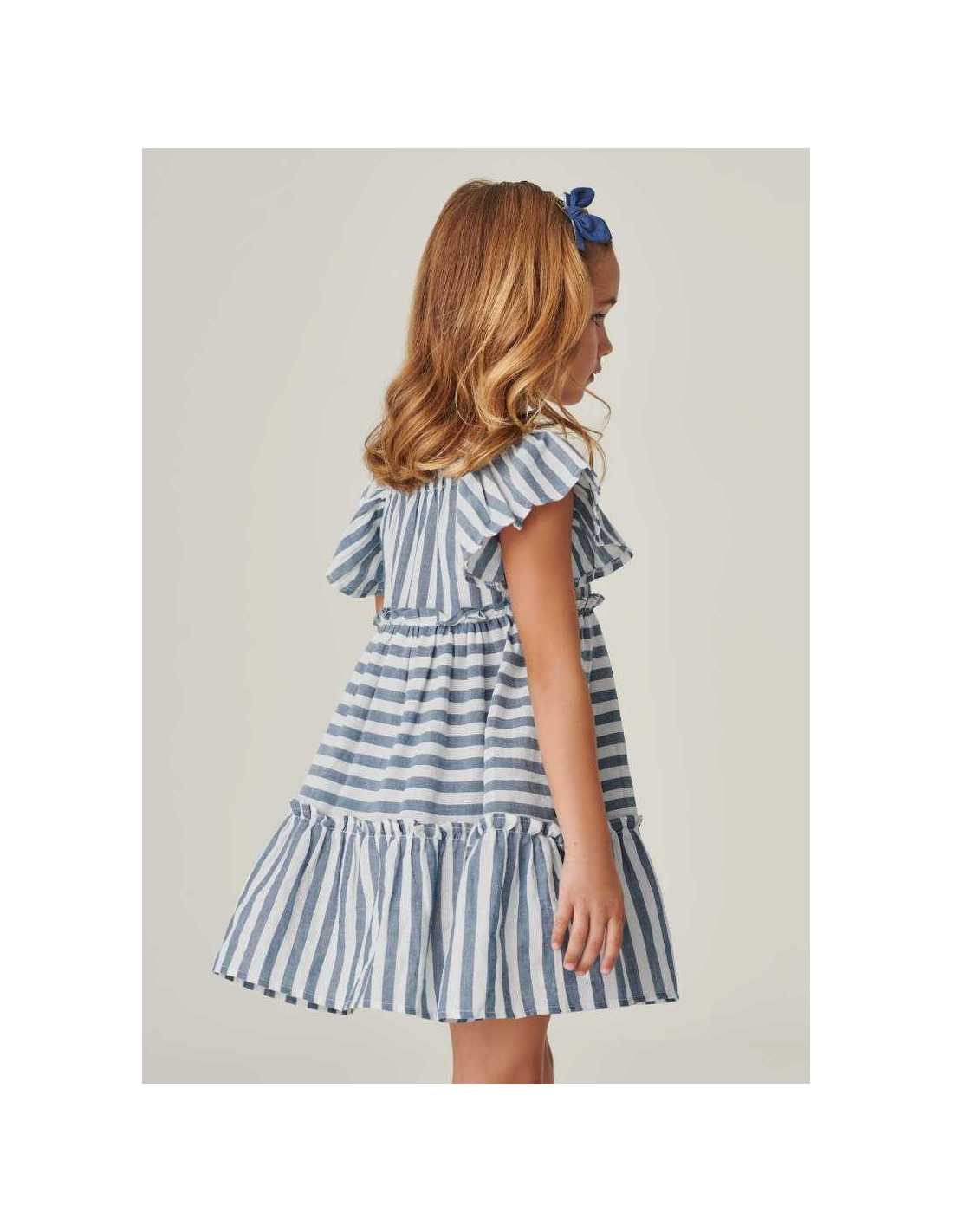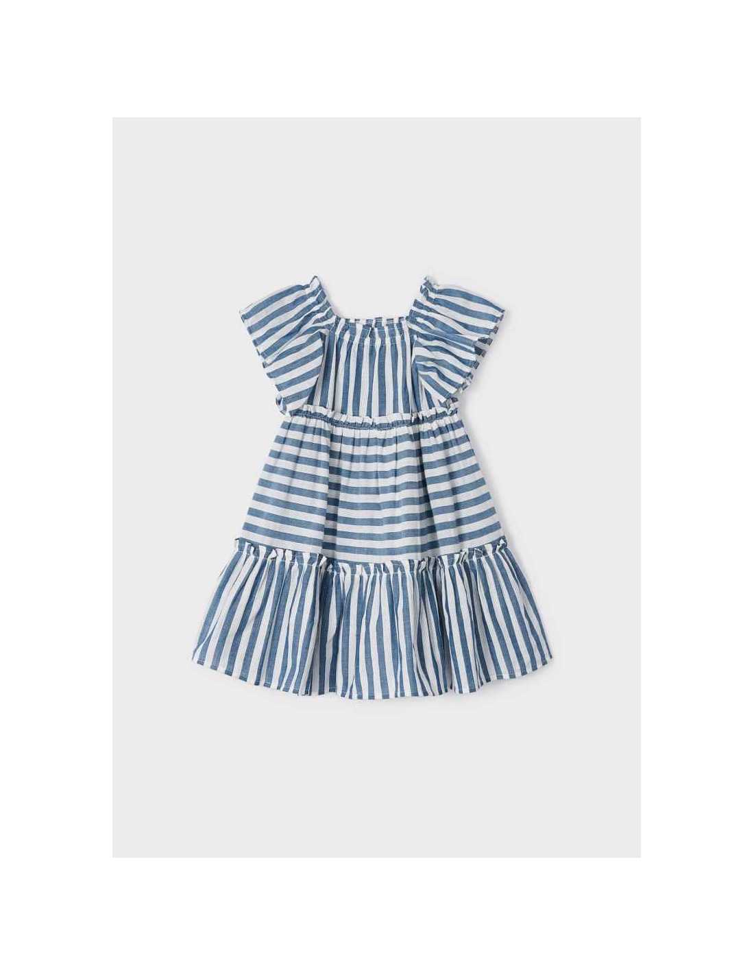 Vestido de manga corta para niña. Cuello cuadrado. Tejido 100% algodón. Motivo de rayas.