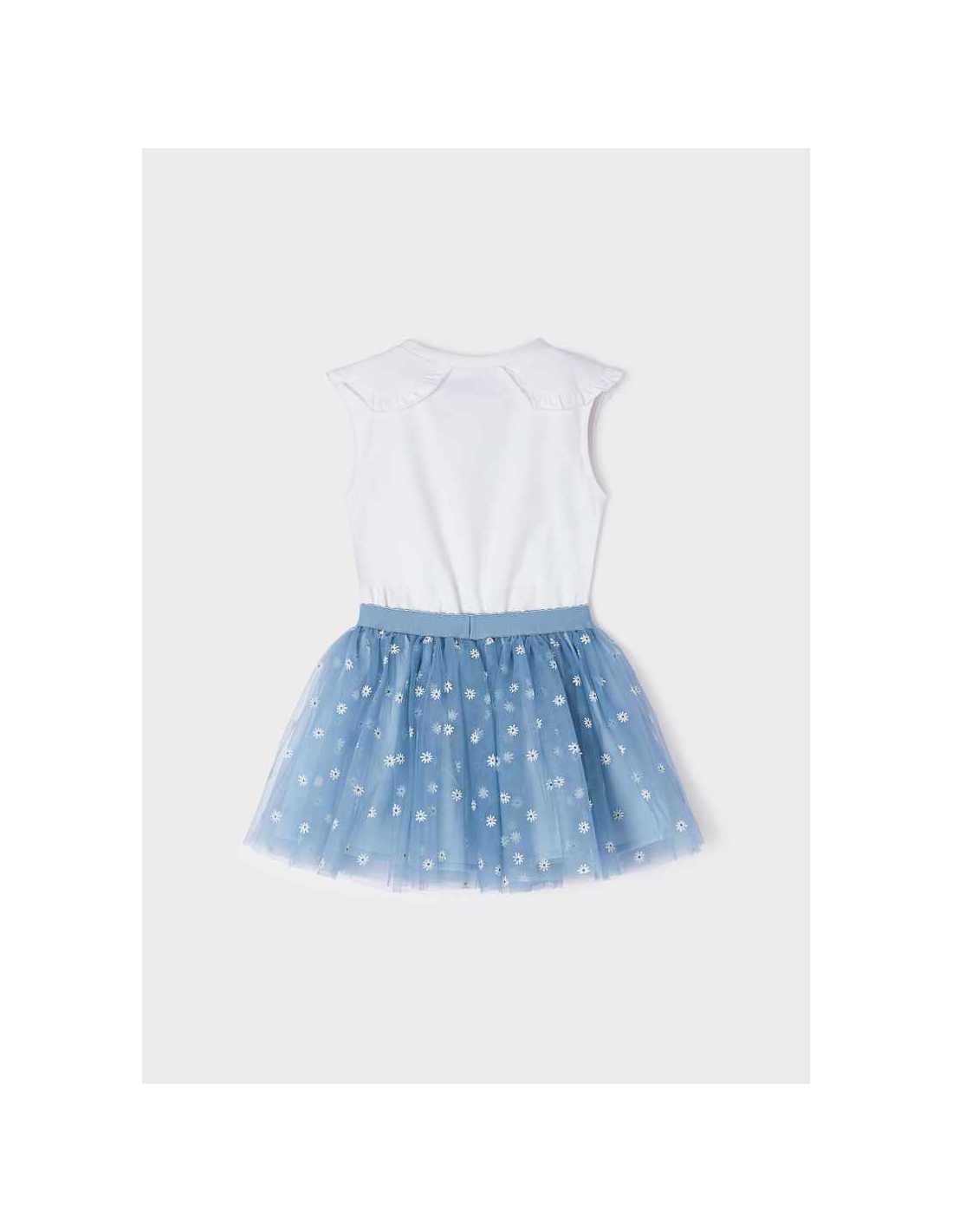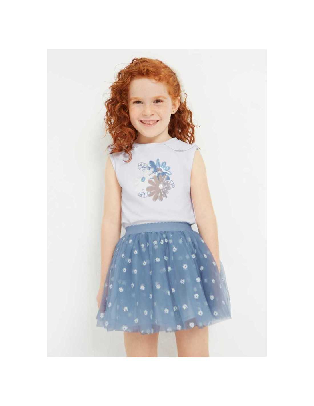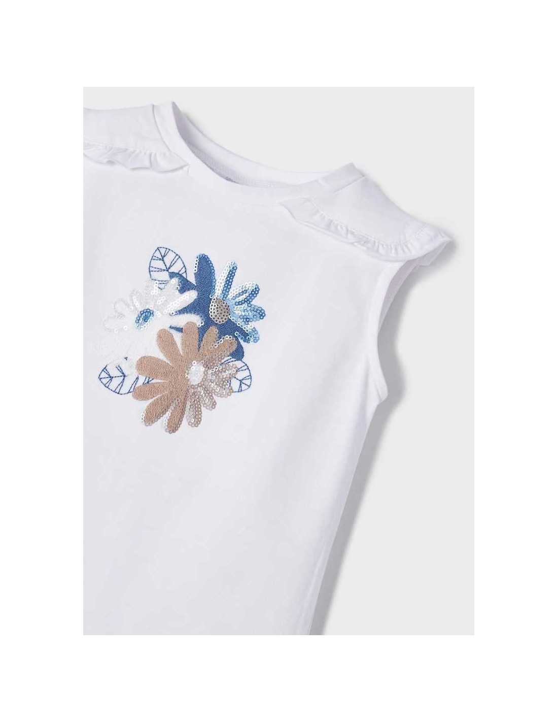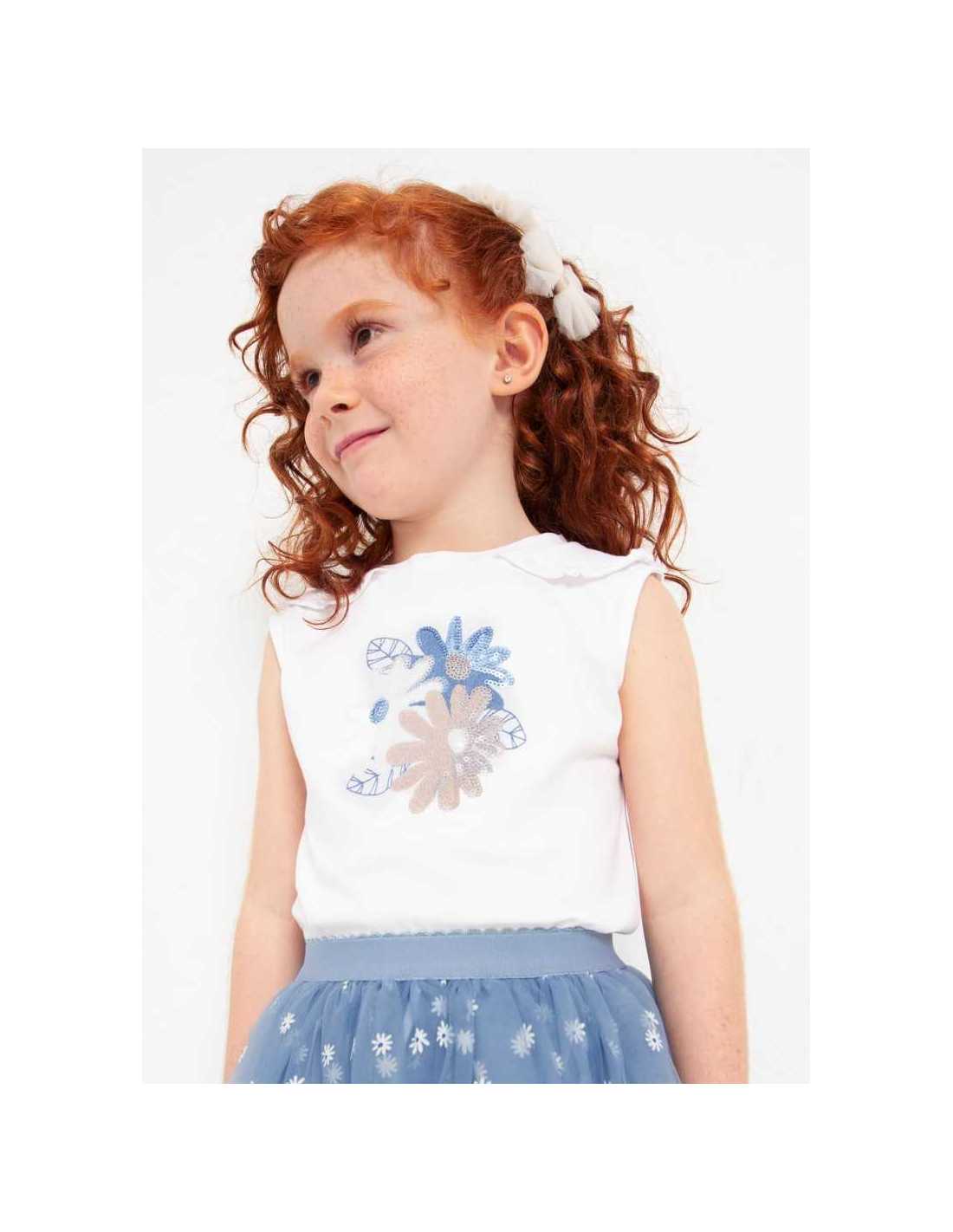 Camiseta sin mangas para niña. Cuello redondo. Suave tejido de algodón elástico. Modelo con volantes. Elementos de adorno: bordado.