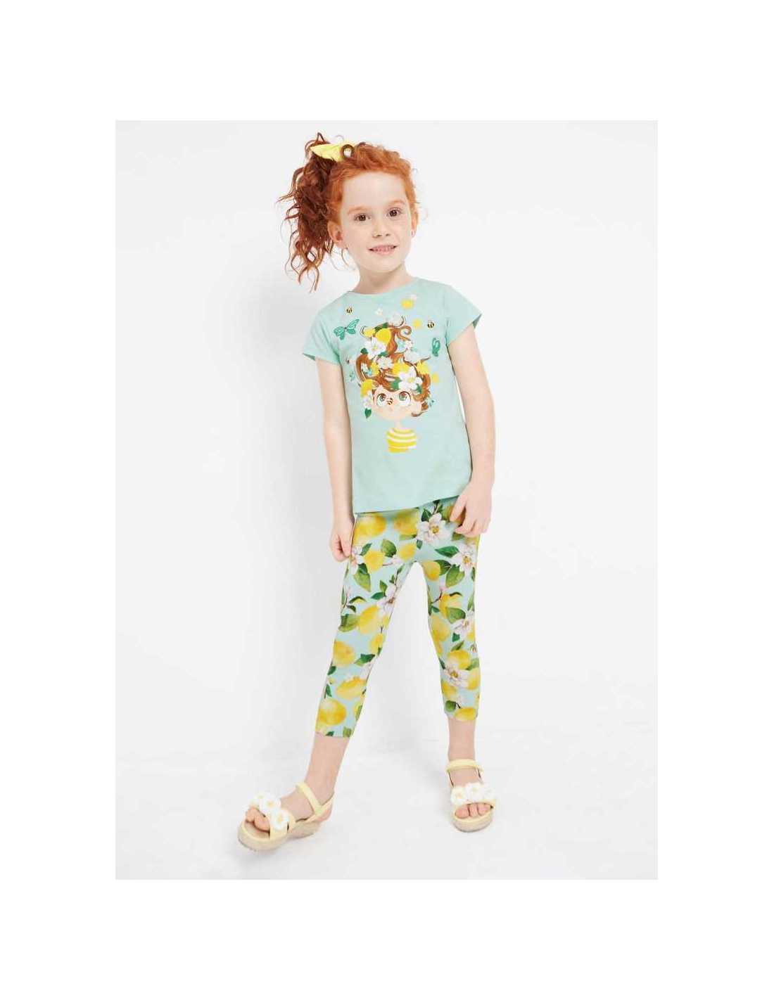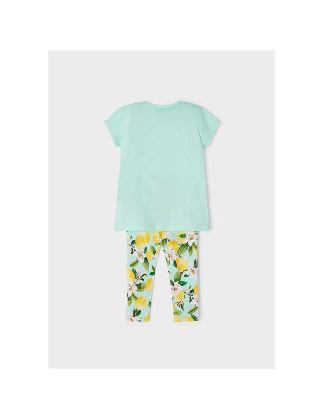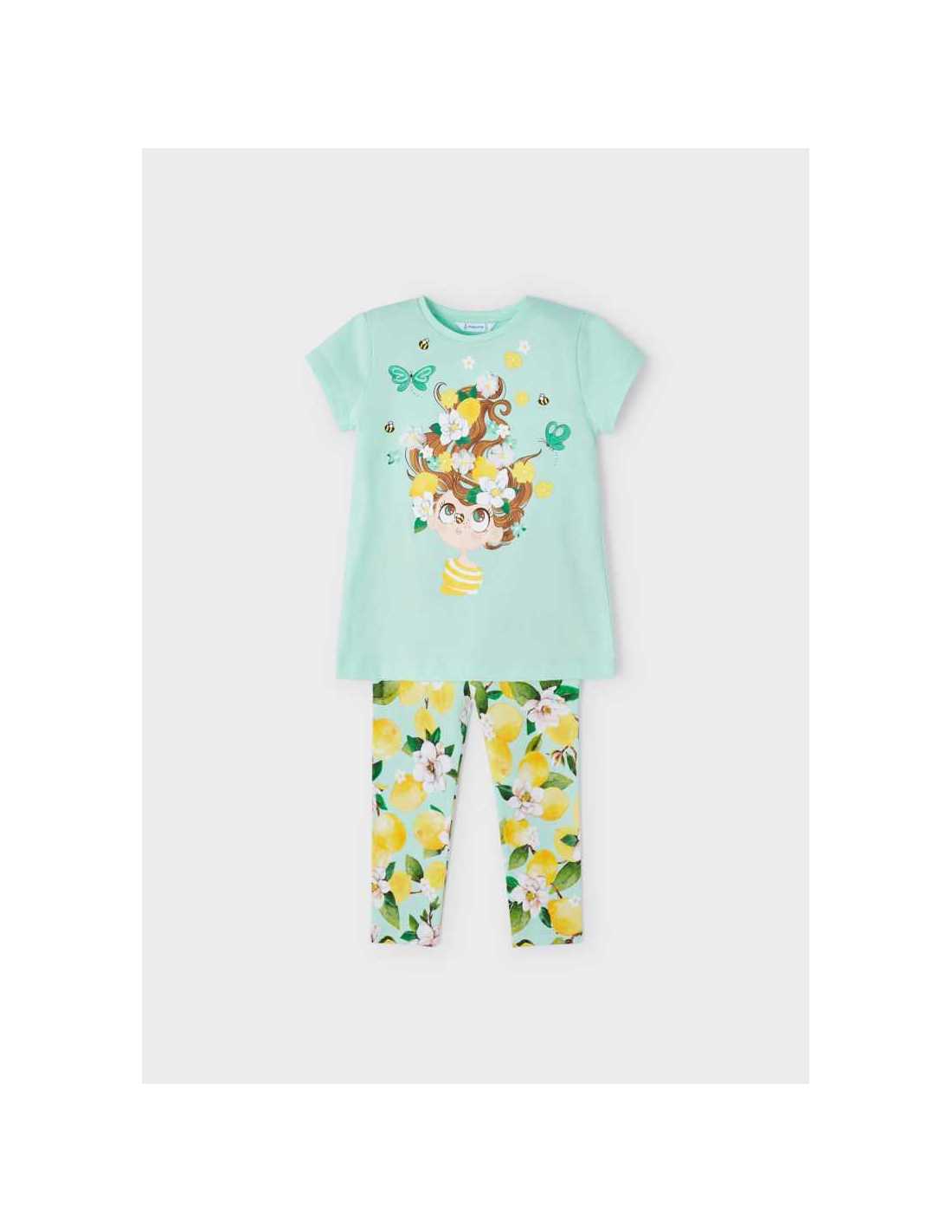 Conjunto de dos piezas para niña compuesto por una camiseta con pantalón tipo leggings combinado.