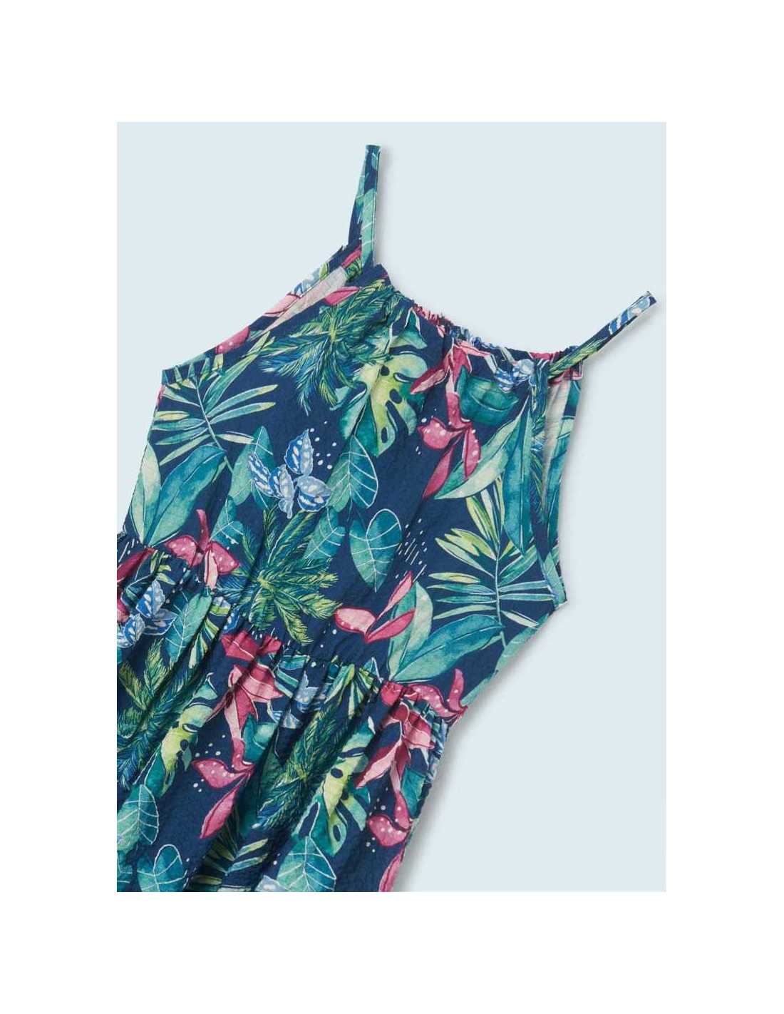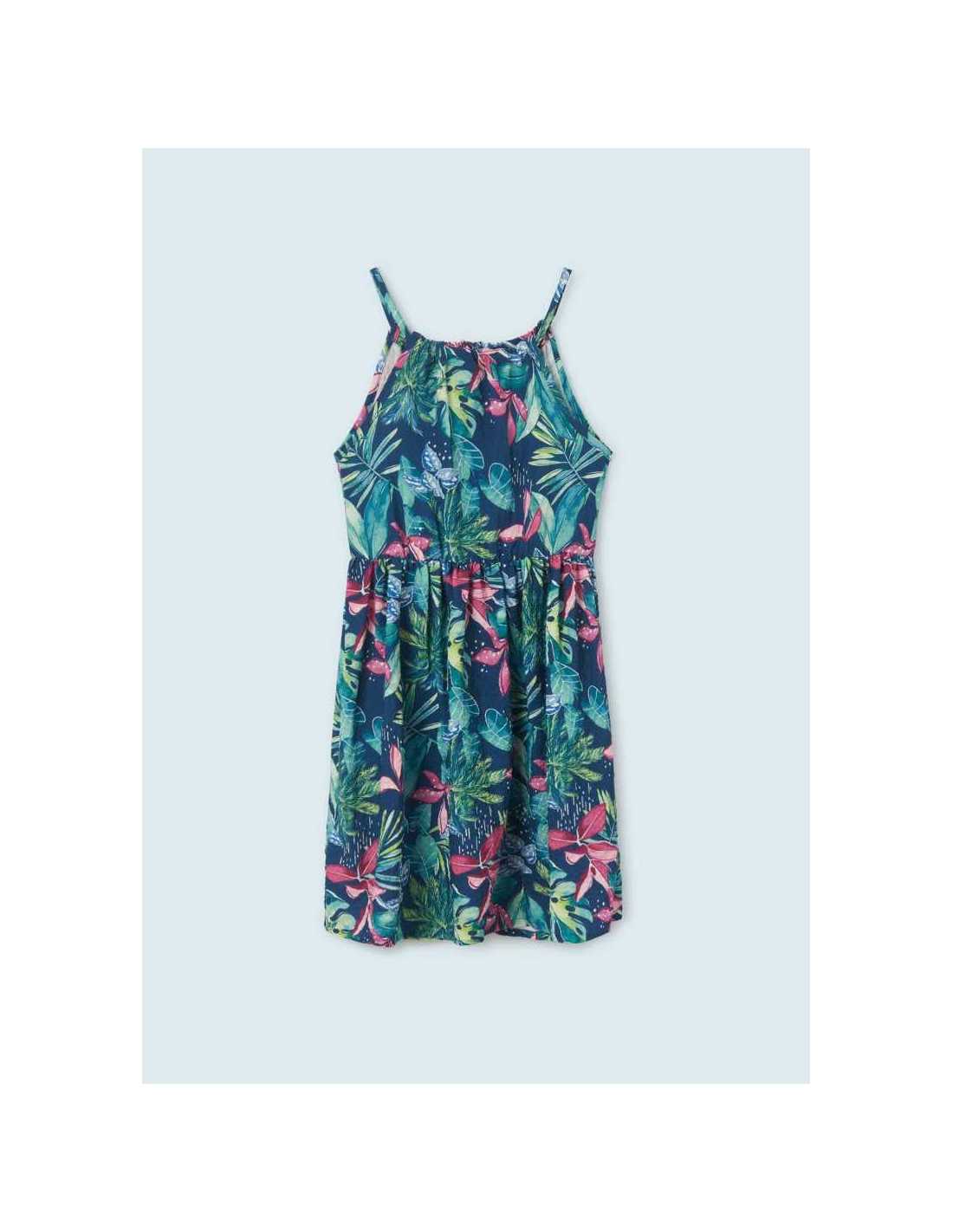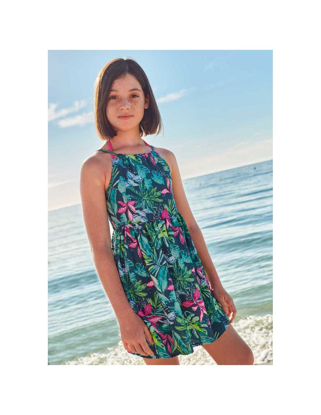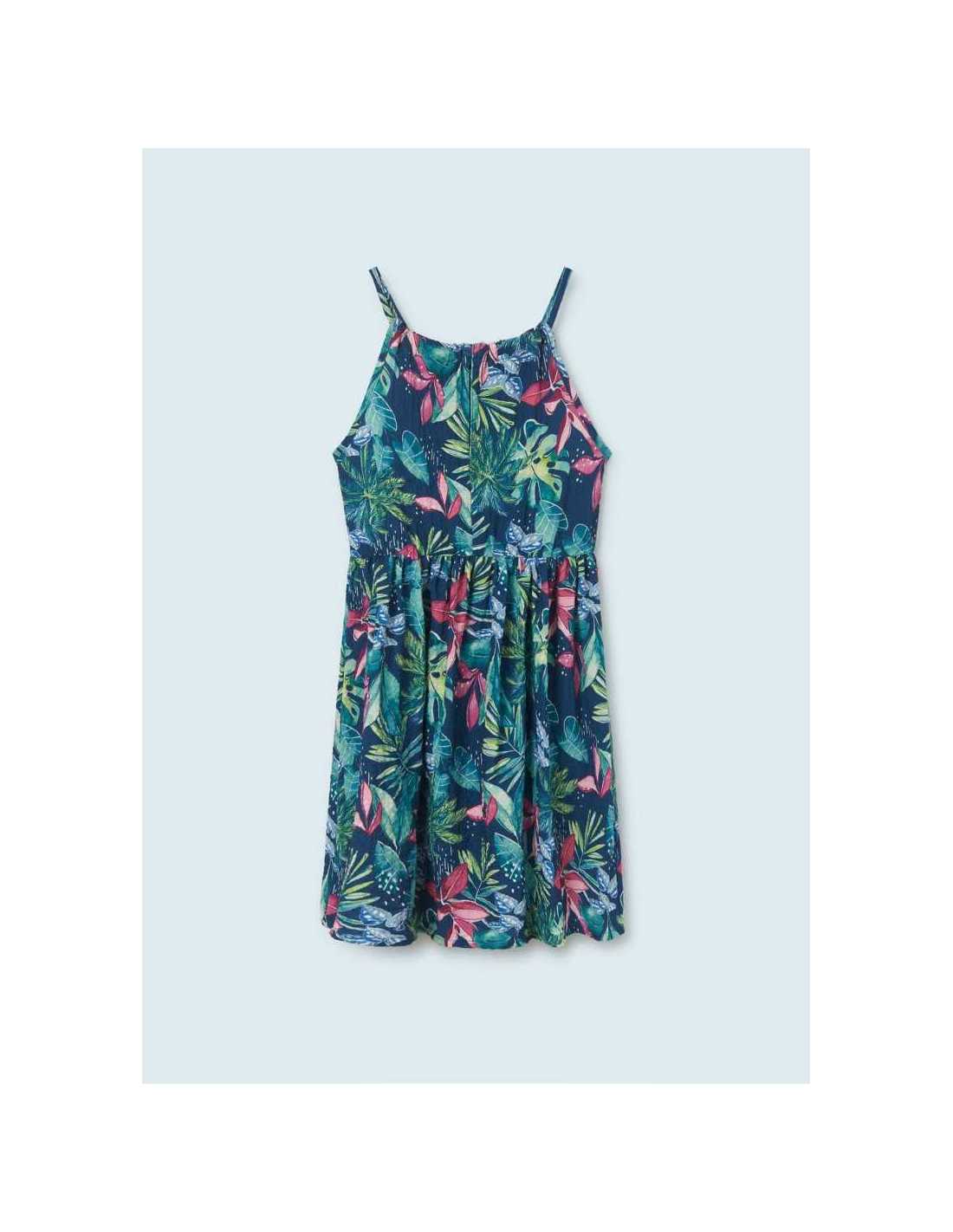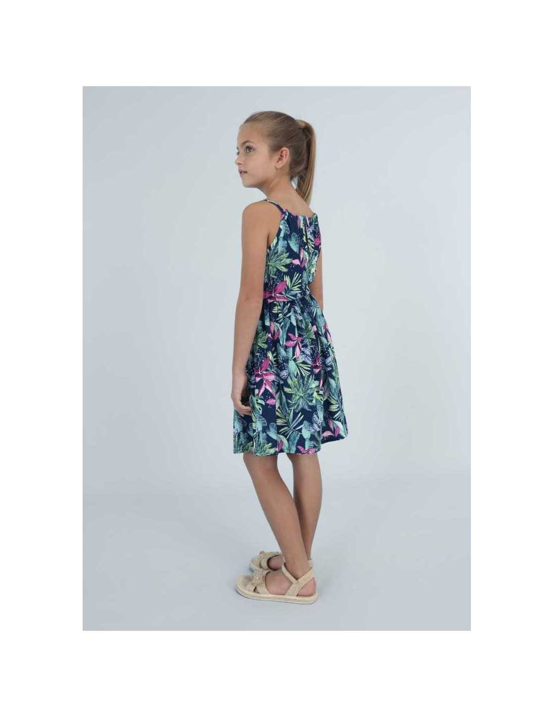 Vestido de tirantes para chica. Cuello redondo. Pequeña abertura en la espalda con cierre de botón para facilitar la puesta de la prenda. Diseño estampado.