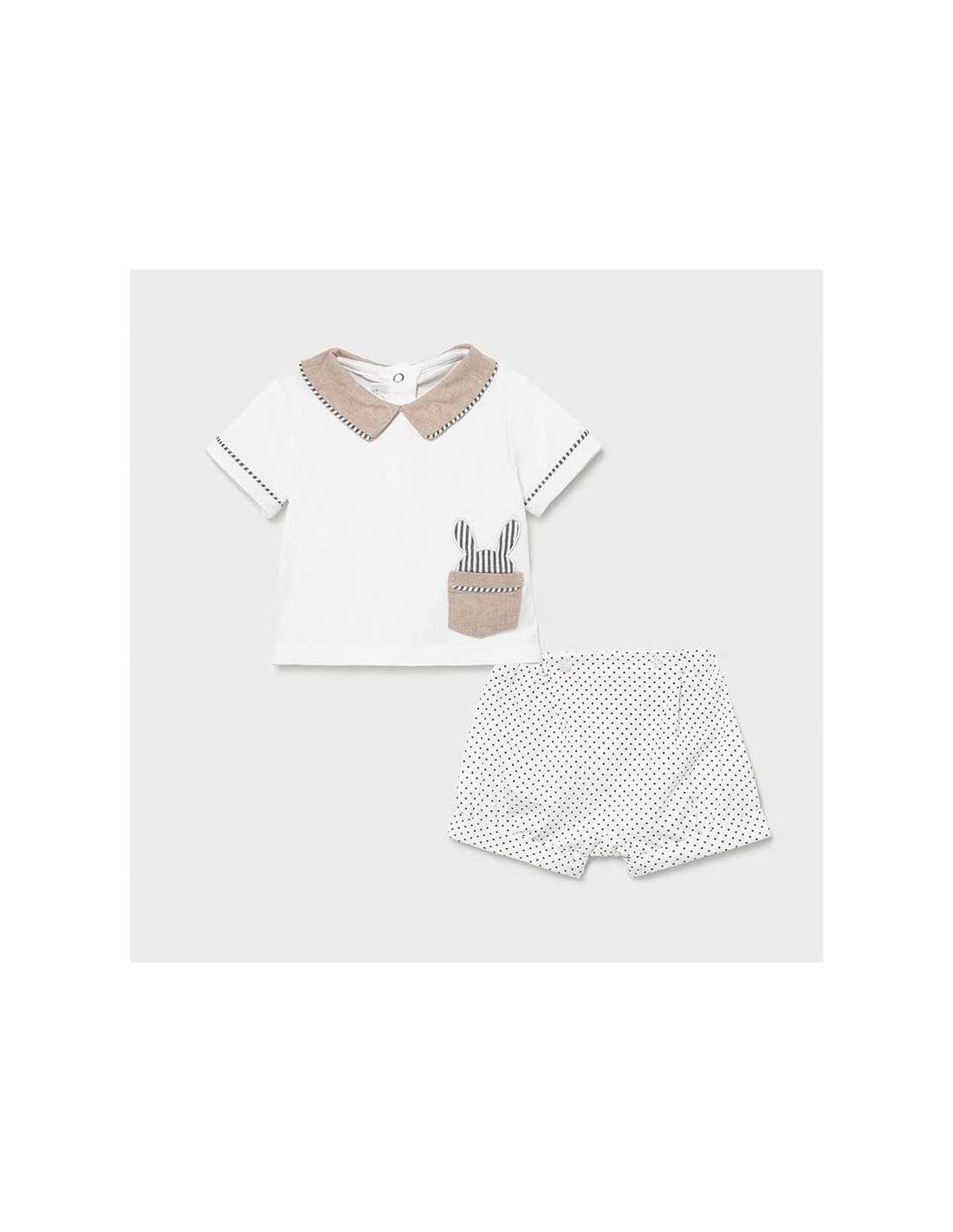 Camiseta de manga corta para recién nacido niño. Cuello camisero. Bolsillo simulado decorativo en la parte delantera. bordado.
